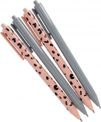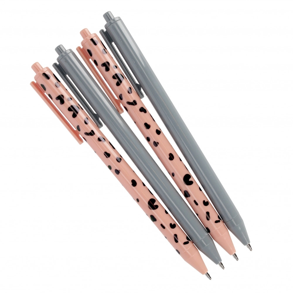 Stilizan set od četiri kemijske olovke u kombinaciji sive i ružičaste boje nudi udobno pisanje svaki dan. Zahvaljujući vrhu 0,7 mm i crnoj tinti pružaju glatki i čitki tekst. Kompaktna duljina 14 cm i klik mehanizam osiguravaju praktičnu uporabu kod kuće, u školi i u uredu.