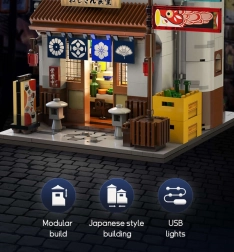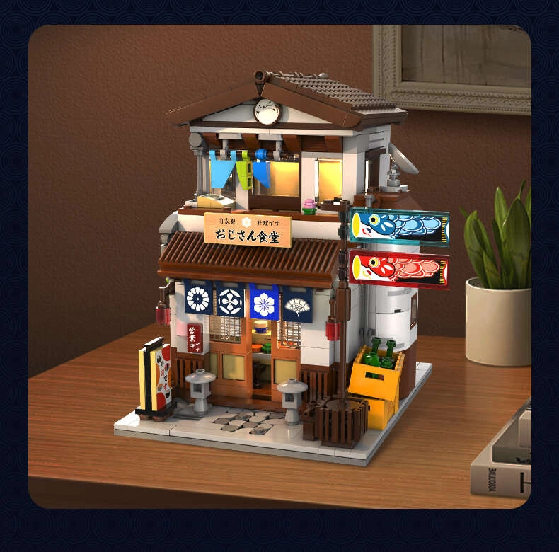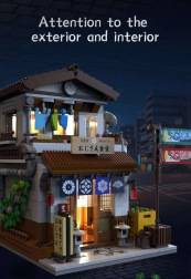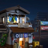 Ovaj razrađeni set donosi tradicionalnu japansku kuću s kuhinjom u prizemlju i dnevnim dijelom na katu. Zahvaljujući uklonjivom krovu ili mogućnosti pomicanja zida lako ćete zaviriti unutra i uživati u svim sitnim detaljima. Integrirano LED svjetlo stvara večernju atmosferu ulica Tokija i daje modelu jedinstven ugođaj.