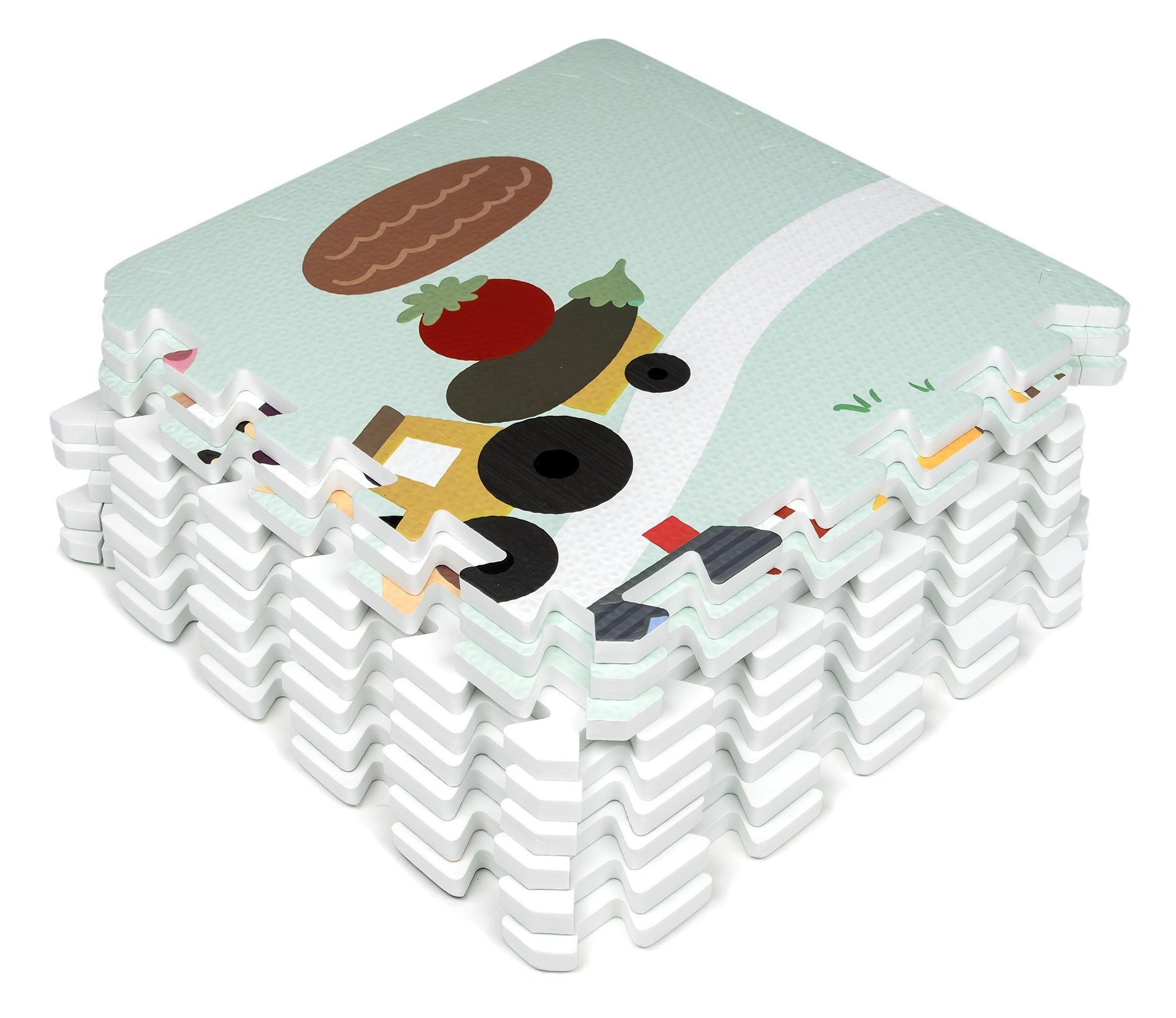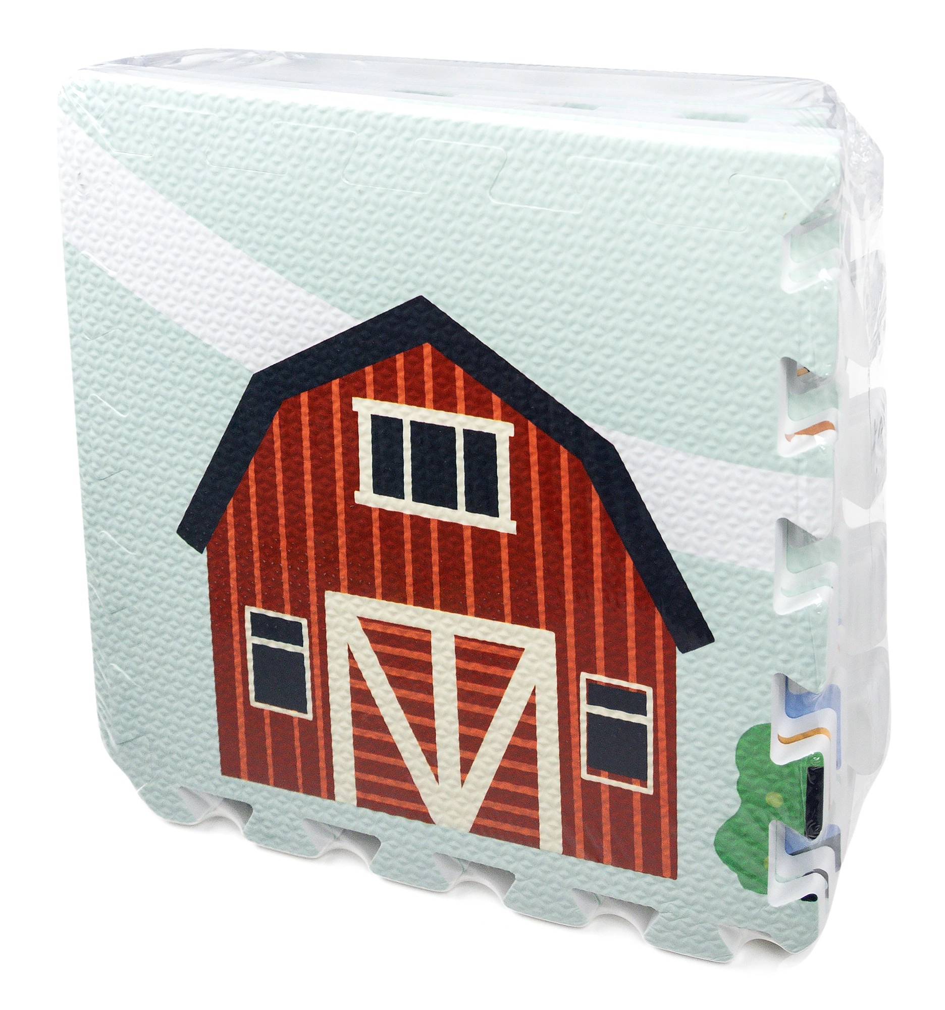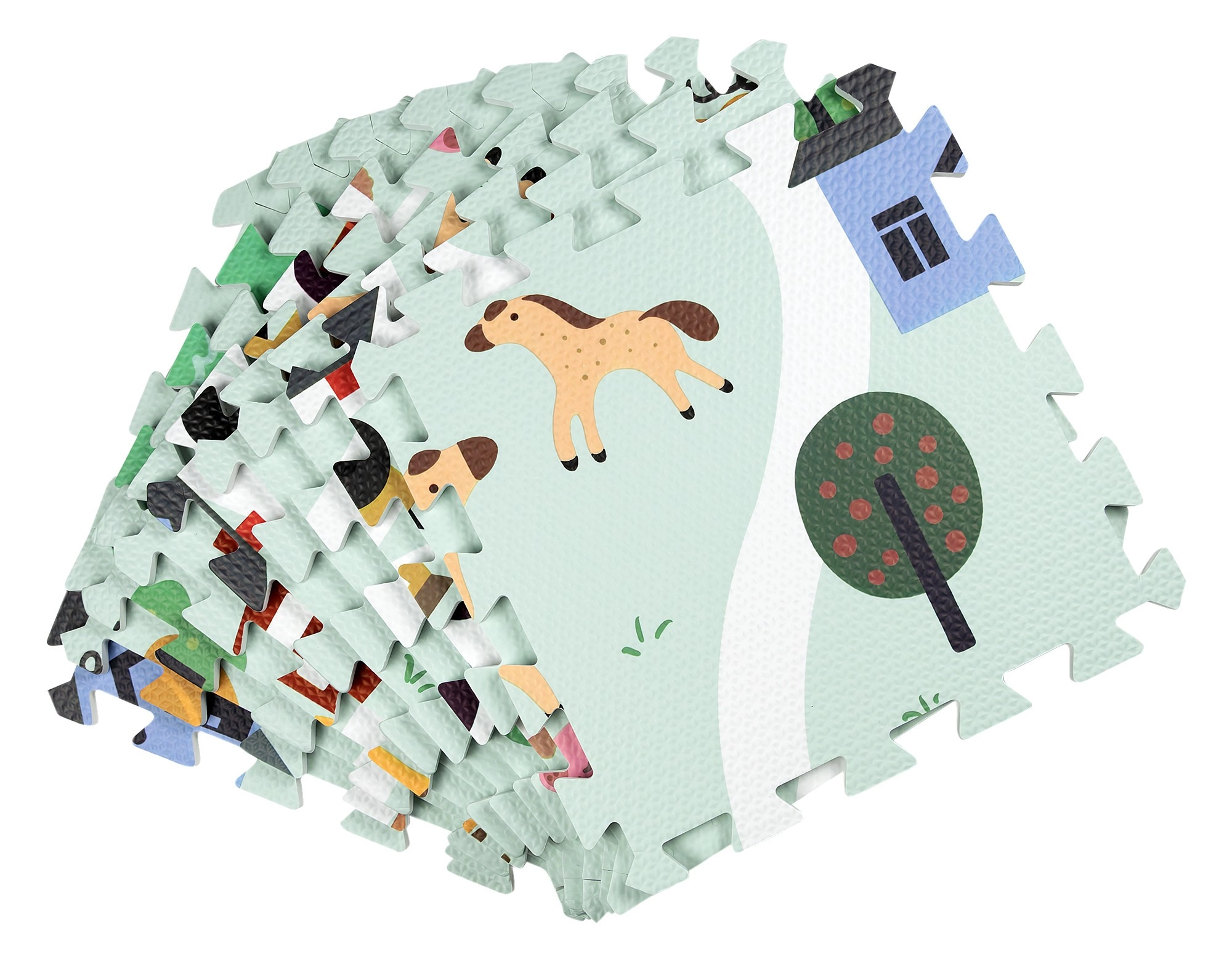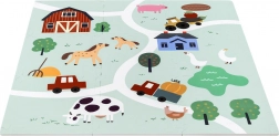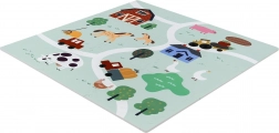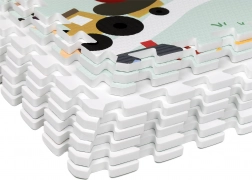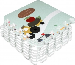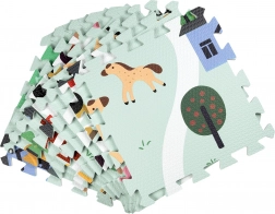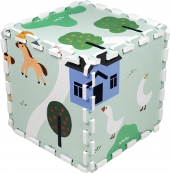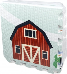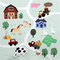 Meka i sigurna dječja podloga od EVA pjene sastavljena od 9 dijelova dimenzija 30 × 30 cm s motivom farme. Pruža izolaciju od hladnoće, ublažavanje padova i protukliznu površinu. Vodooporna je, lako se čisti i zahvaljujući rubovima iz dijelova se može složiti veća površina ili 3D oblici (npr. kocka). Prikladna od rođenja, bez ftalata, formamida, PVC-a i BPA, udovoljava standardima EN 71 i REACH.
