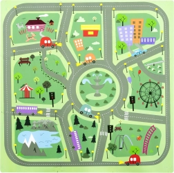 Ceste, kružni tok, parkovi, jezerce, zgrade i prometni elementi potiču maštu i prometnu edukaciju. Idealno za autiće i figurice.