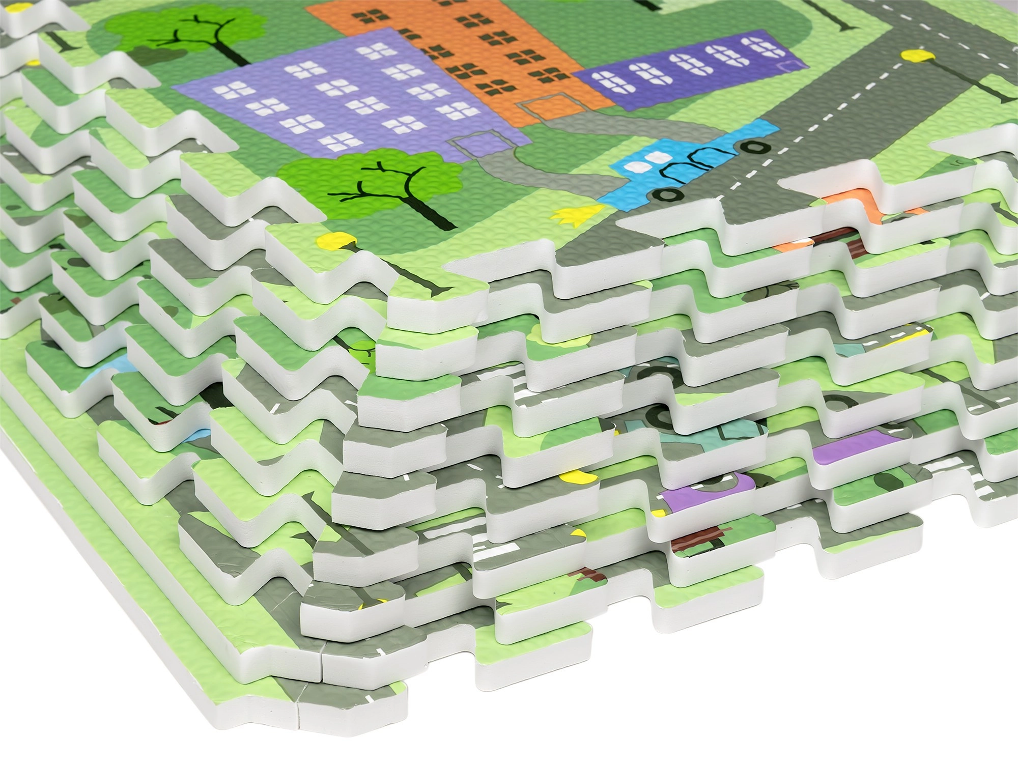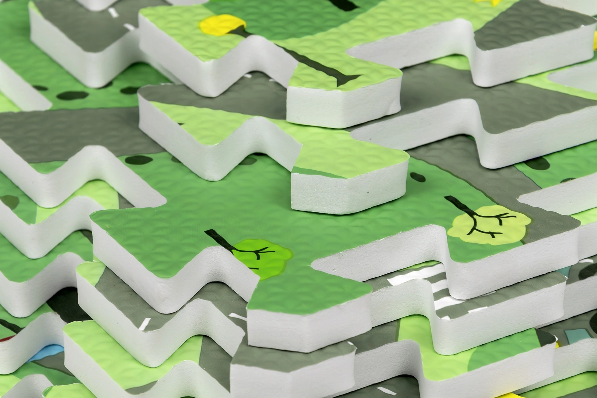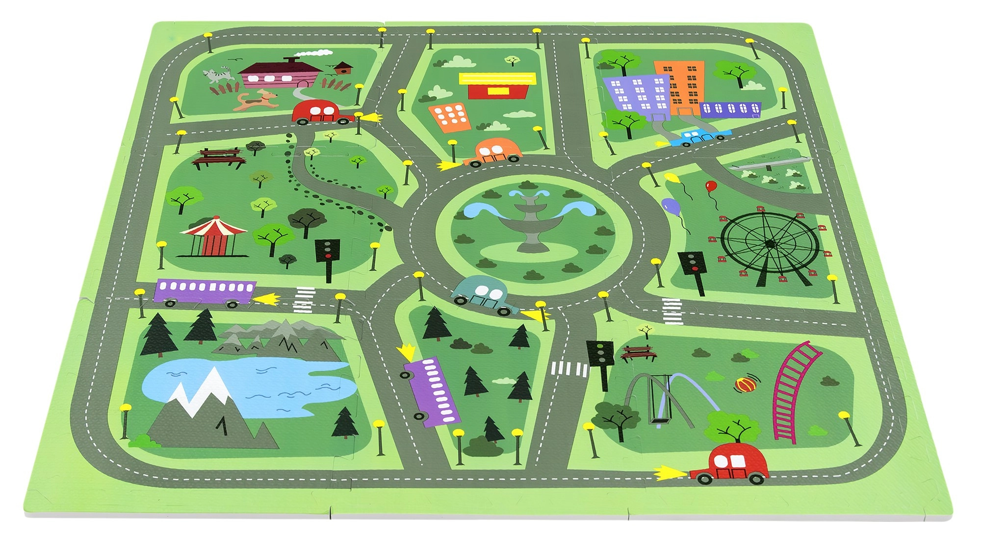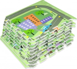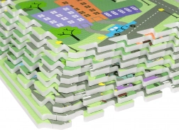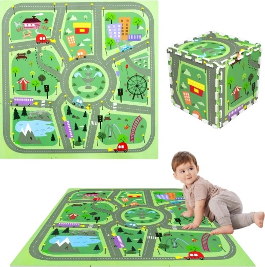 Stvorite djetetu udobno i higijensko mjesto za igru. Podloga od elastične EVA pjene je bez ftalata, formamida, PVC-a i BPA-a, ima protukliznu površinu i nježne reljefe za sigurnije prve korake. Pastelni motiv gradskih ulica s kružnim tokom, parkovima, jezercem i zgradama potiče maštu i poziva na vožnju autićima i kreativnu igru s figuricama.