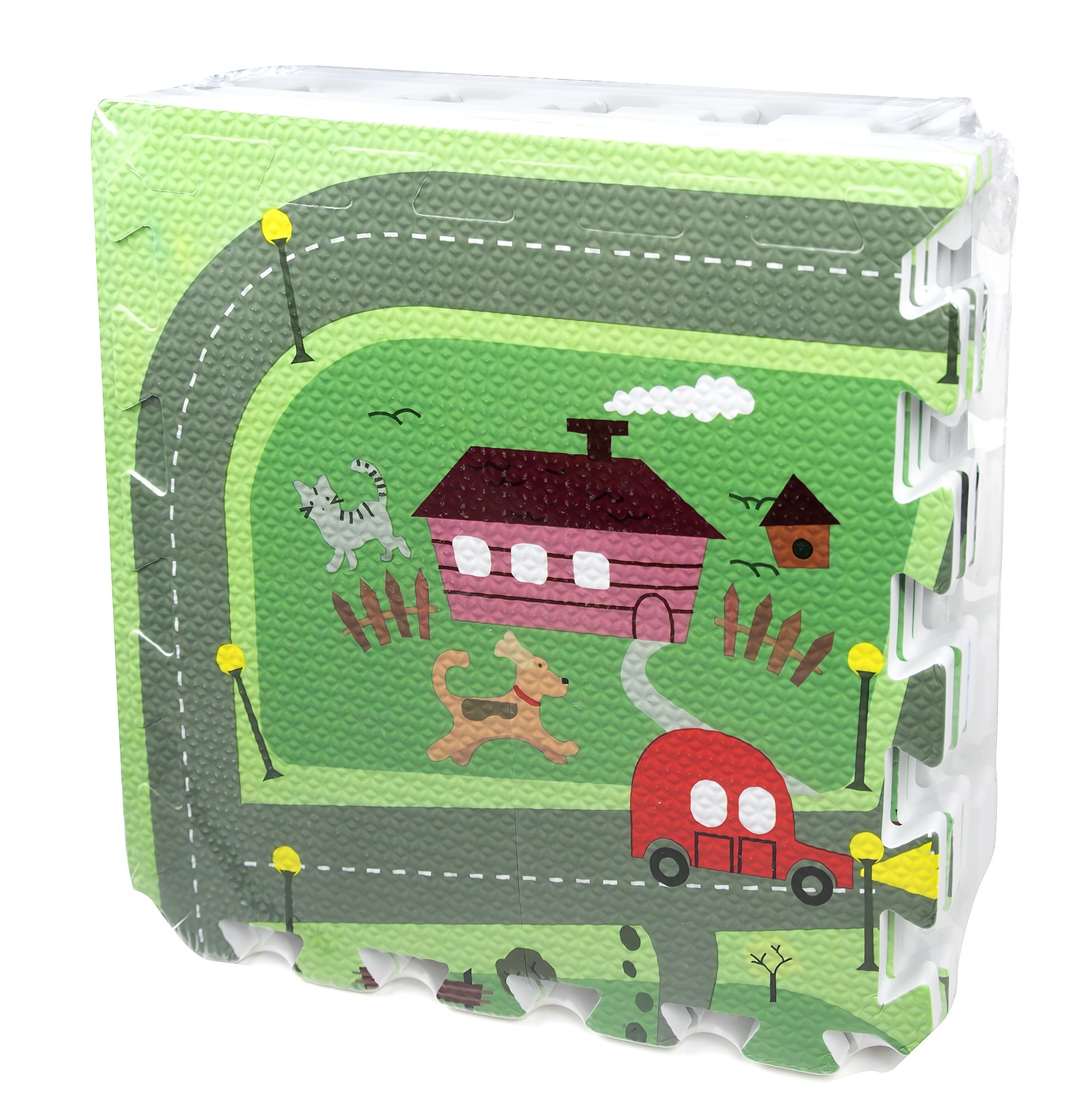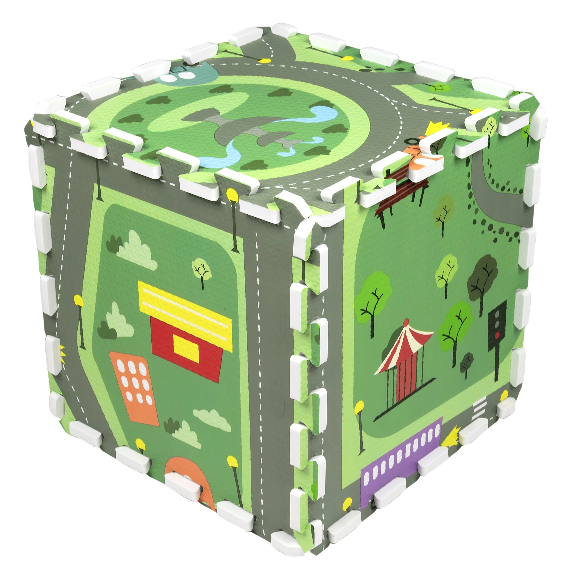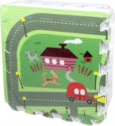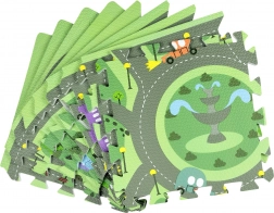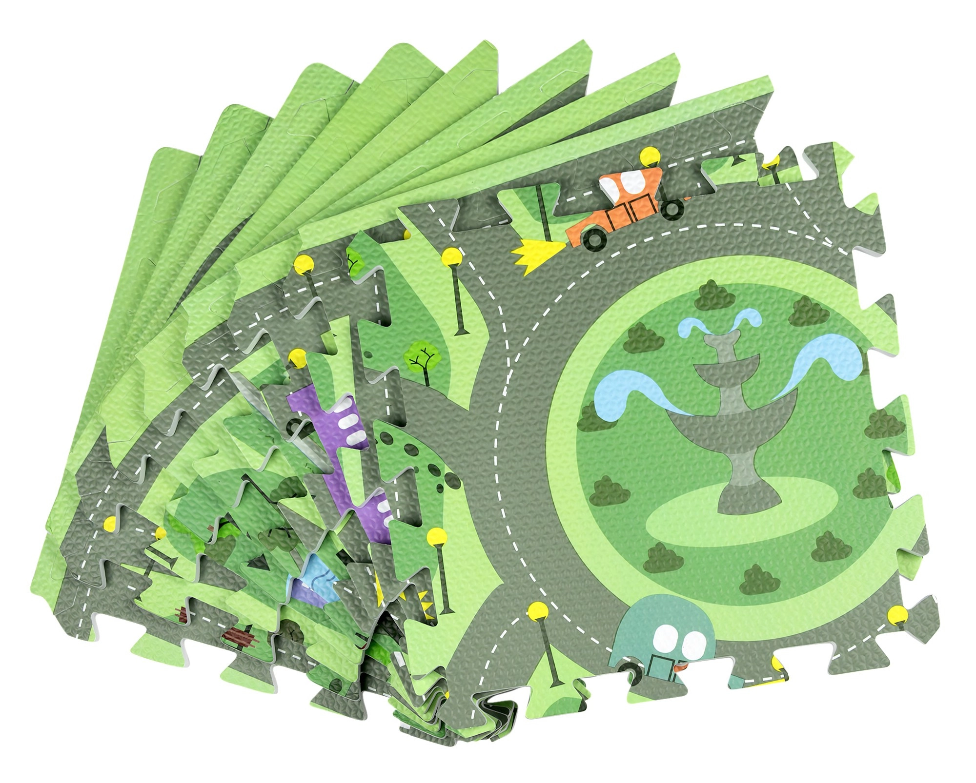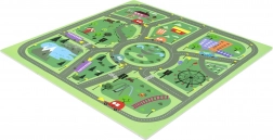 Stvorite djetetu udobno i higijensko mjesto za igru. Podloga od elastične EVA pjene je bez ftalata, formamida, PVC-a i BPA-a, ima protukliznu površinu i nježne reljefe za sigurnije prve korake. Pastelni motiv gradskih ulica s kružnim tokom, parkovima, jezercem i zgradama potiče maštu i poziva na vožnju autićima i kreativnu igru s figuricama.