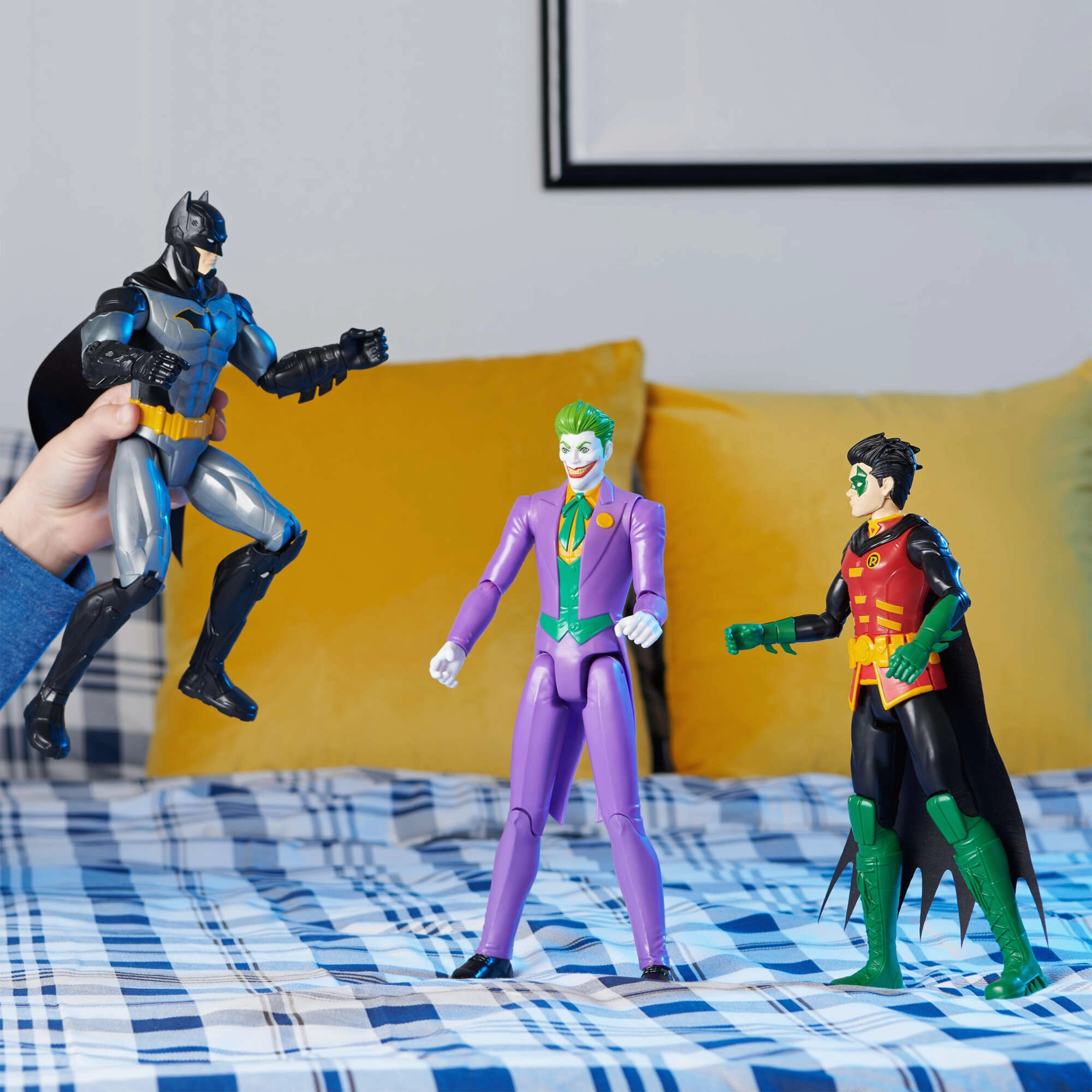Zahvaljujući artikuliranim zglobovima u području glave, ramena, laktova, kukova i koljena, lako ćete kreirati akcijske scene, dvoboje i ikonične poze. BATMAN u crno-sivom odijelu s platnenim plaštom, ROBIN s crveno-žutim prslukom i zelenim detaljima te JOKER u ljubičastom odijelu donose vašoj kolekciji autentičnu atmosferu stripovskog svijeta.
