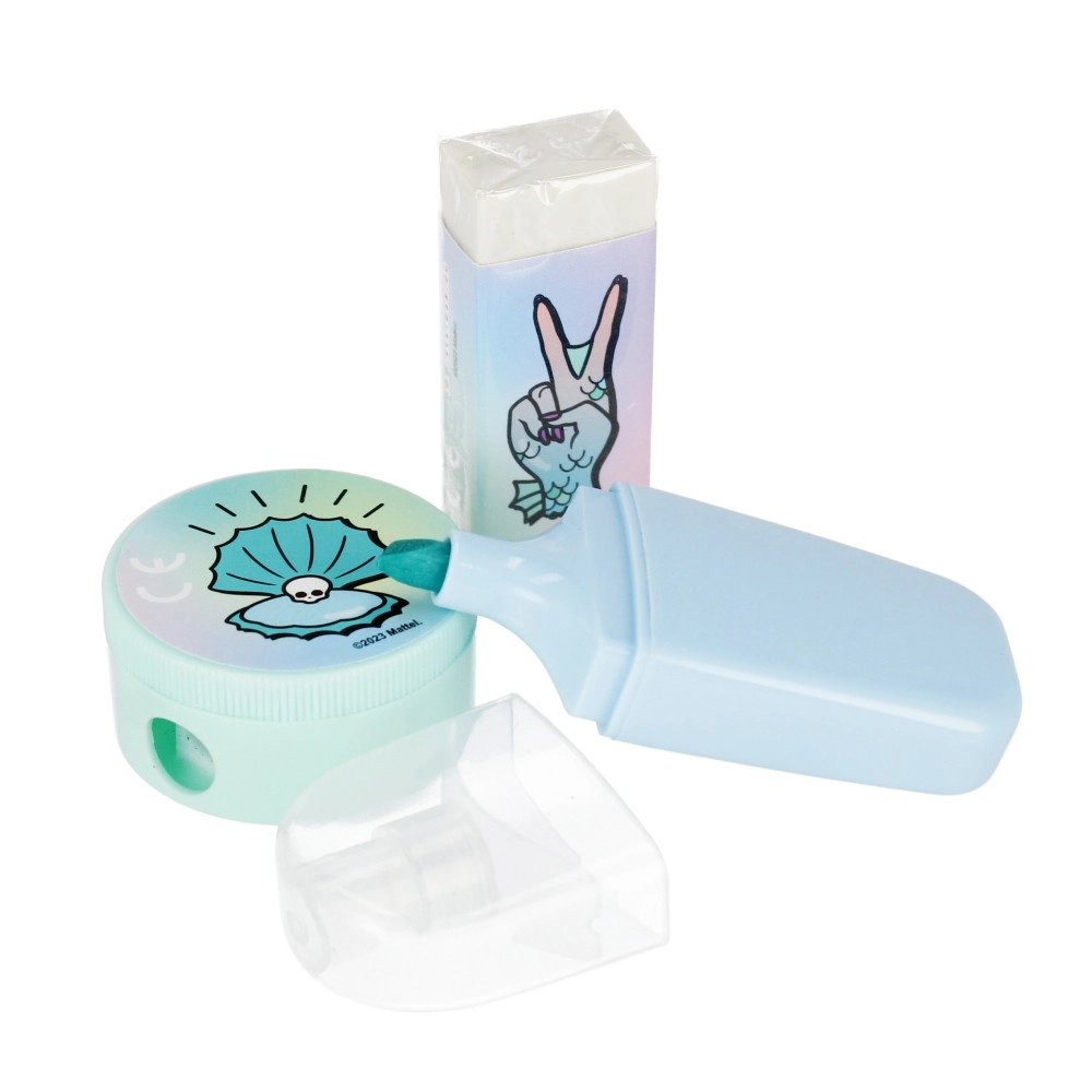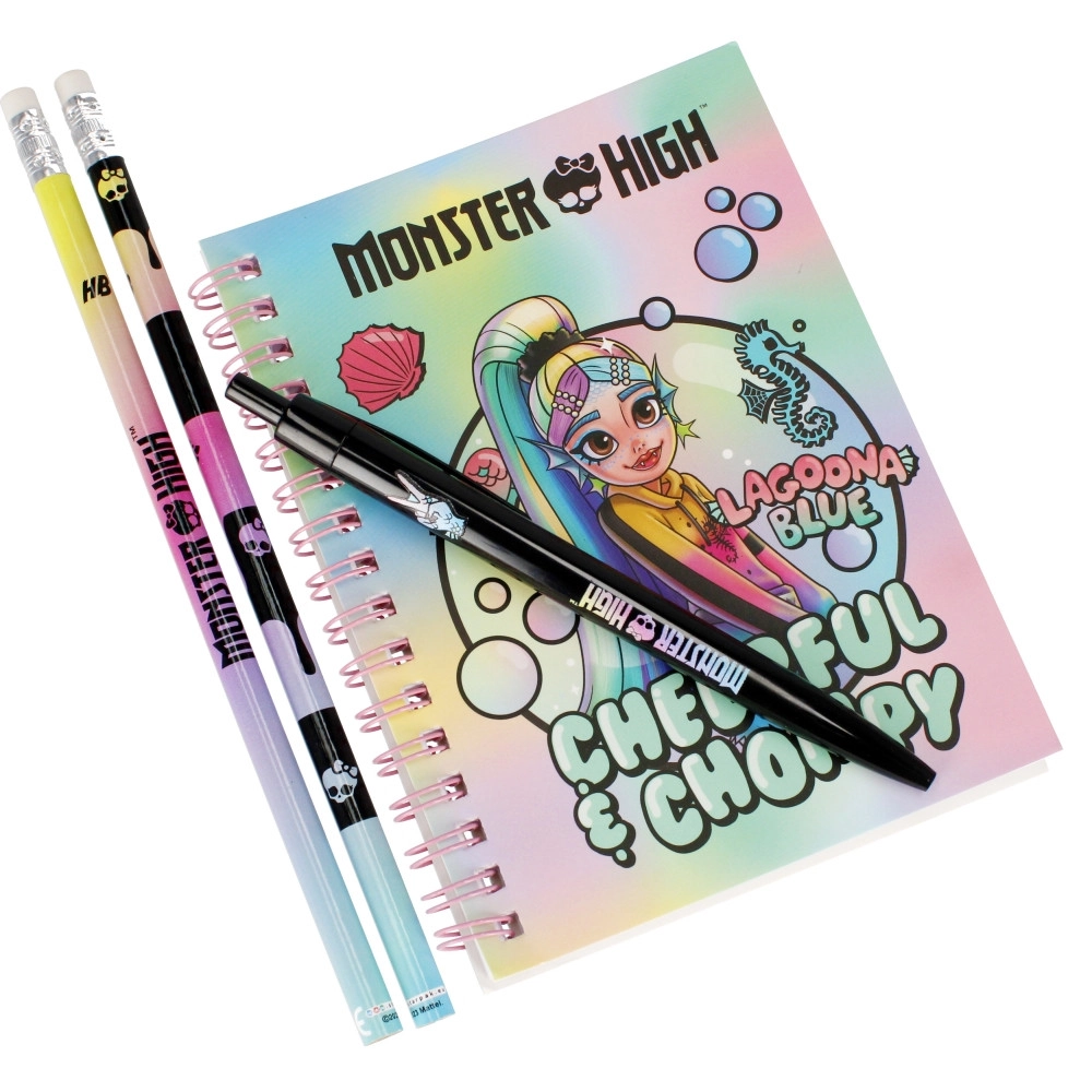 Stilski školski set s motivom MONSTER HIGH razveselit će svakog malog školarca. Sadrži prozirnu pernicu, spiralnu bilježnicu, 2 olovke s gumicom, zasebnu gumicu, šiljilo, marker, kemijsku olovku i ravnalo 15 cm. Kompaktne dimenzije i zabavan dizajn idealni su za školu, pisanje i kreativni rad. Pogodno za djecu 3+.