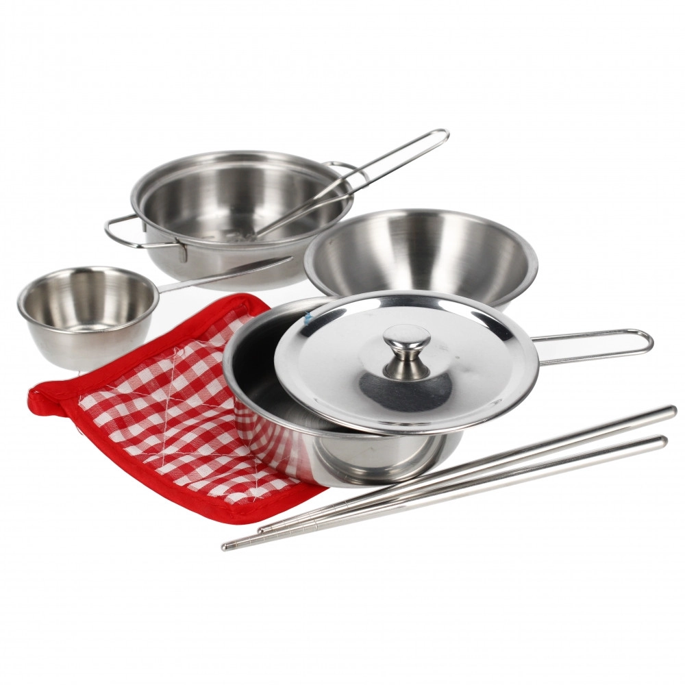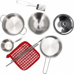 Zabavan dječji kuhinjski set za male kuhare od 3 godine. Sadrži lonce s poklopcem, zdjelu, kutlaču, krpu i štapiće za igru kuhanja. Idealan za razvoj mašte, fine motorike i igranja uloga u dječjoj kuhinjici.