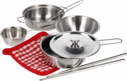 1× lonac s drškom, 2× lonac, 1× poklopac, 1× zdjela, 1× kutlača, 1× krpa, 1× set štapića