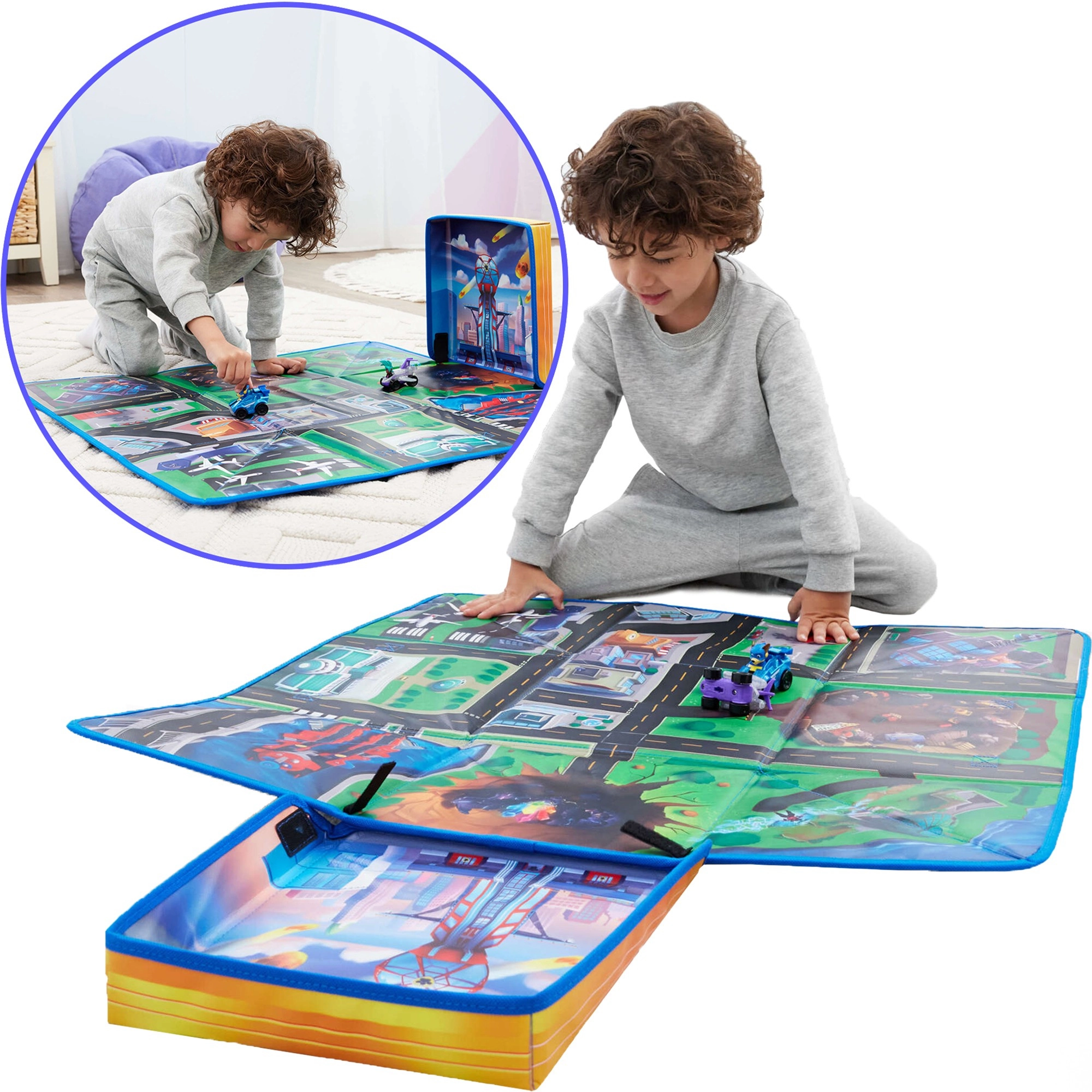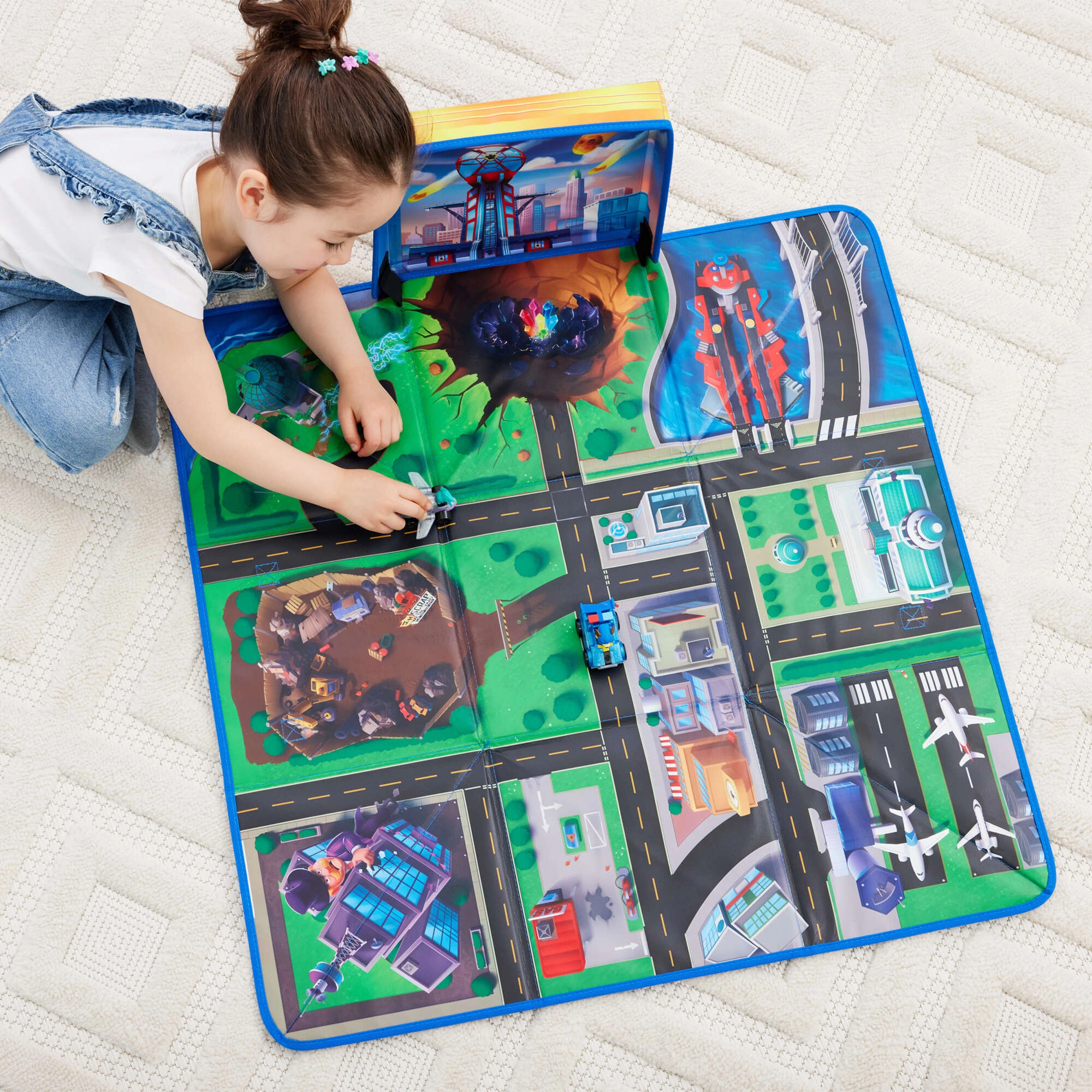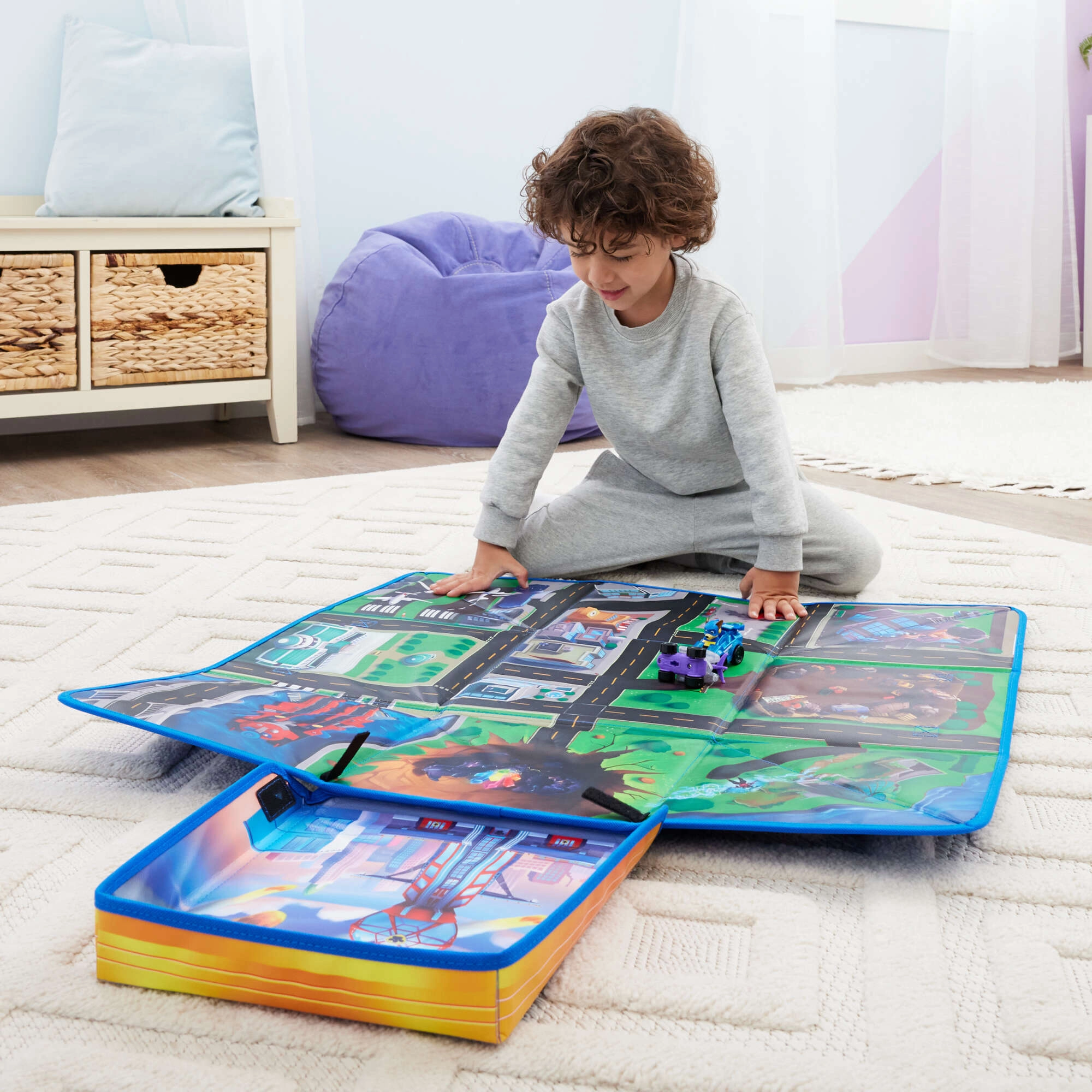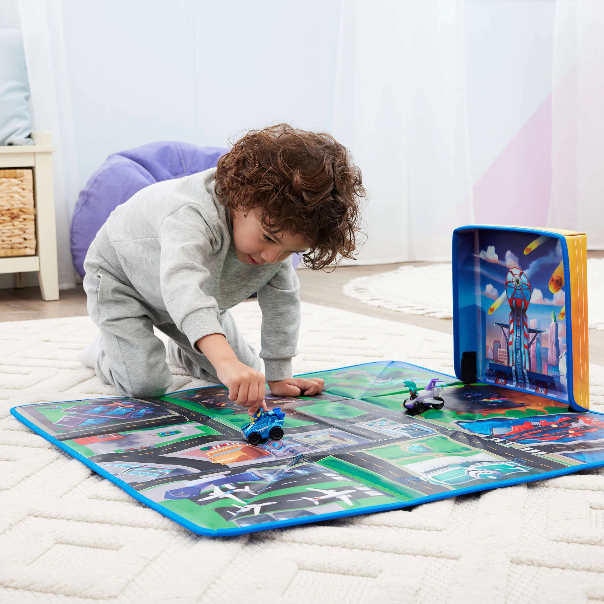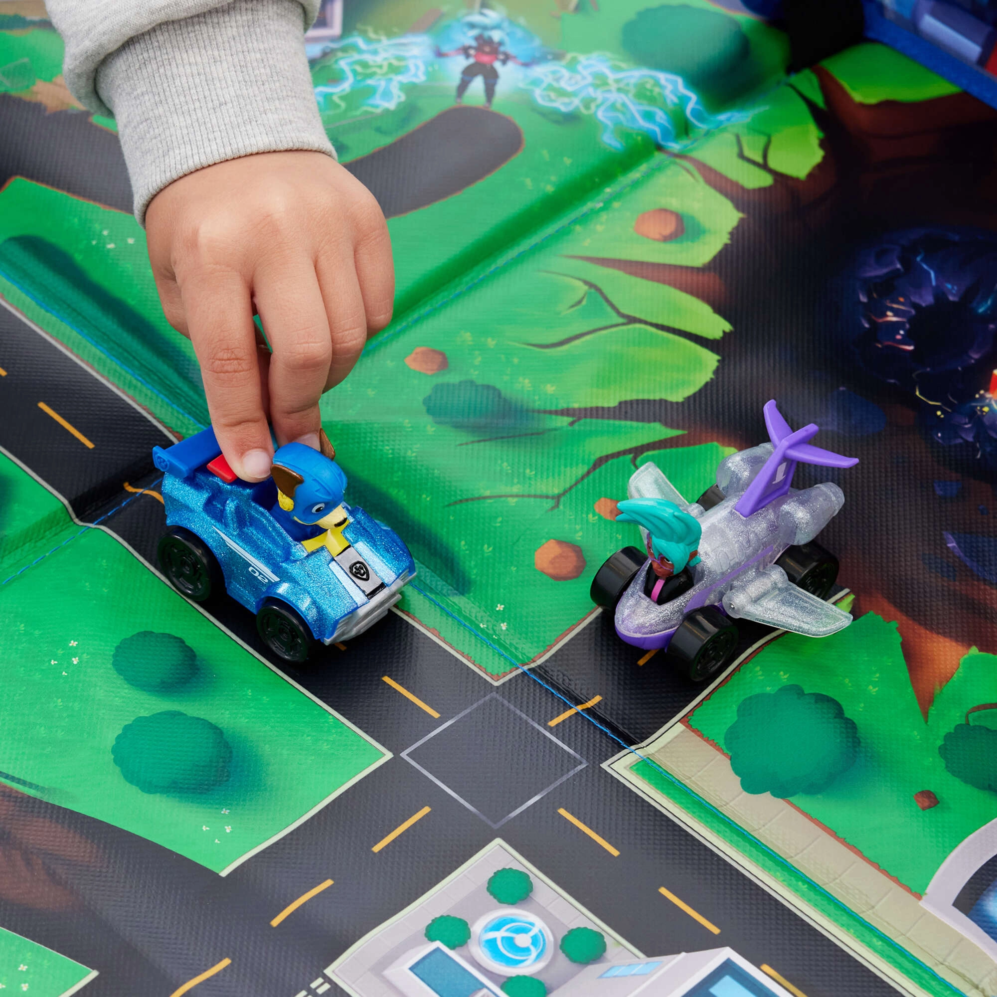 Nakon završetka igre podloga se u trenu pretvara u stabilnu kutiju za spremanje 25,4 × 25,4 × 25,4 cm, u koju stanu autići i figurice. U pakiranju ćete pronaći i vozilo Chase Rescue Racer te ekskluzivno vozilo Vee Rescue Racer, pa možete početi voziti odmah nakon otvaranja.