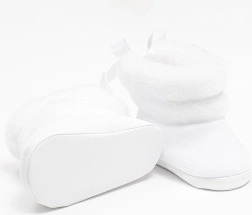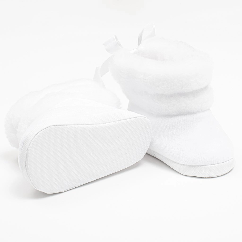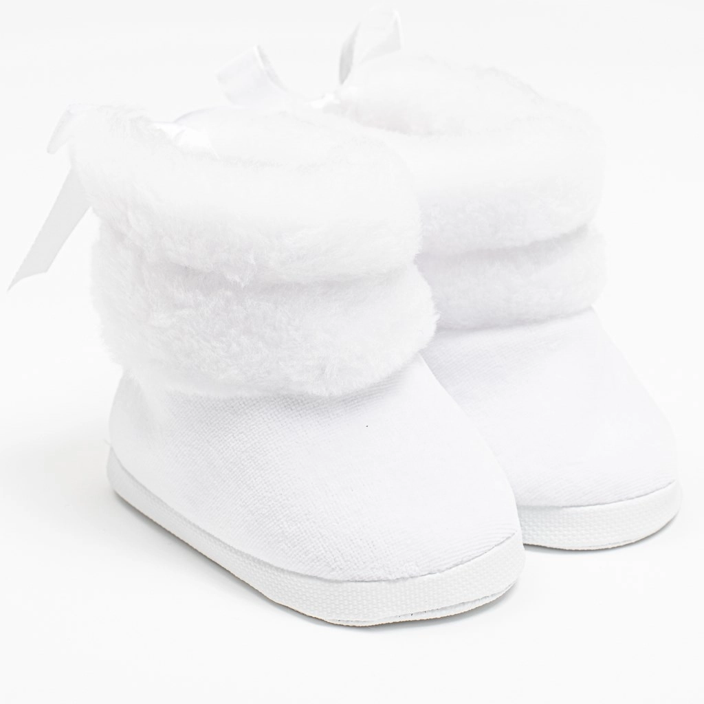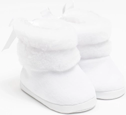 Slatke i praktične dječje zimske čizmice New Baby u bijeloj boji za bebe 0–3 mjeseca. Mekane i tople, izrađene od antilopa s nježnom wellsoft podstavom za maksimalnu udobnost. Zahvaljujući vezicama odlično stoje na nožici, imaju široku unutarnju prostoriju za slobodno kretanje prstića i lagani tanki potplat. Idealne za zimu u kolicima – nisu namijenjene hodanju.