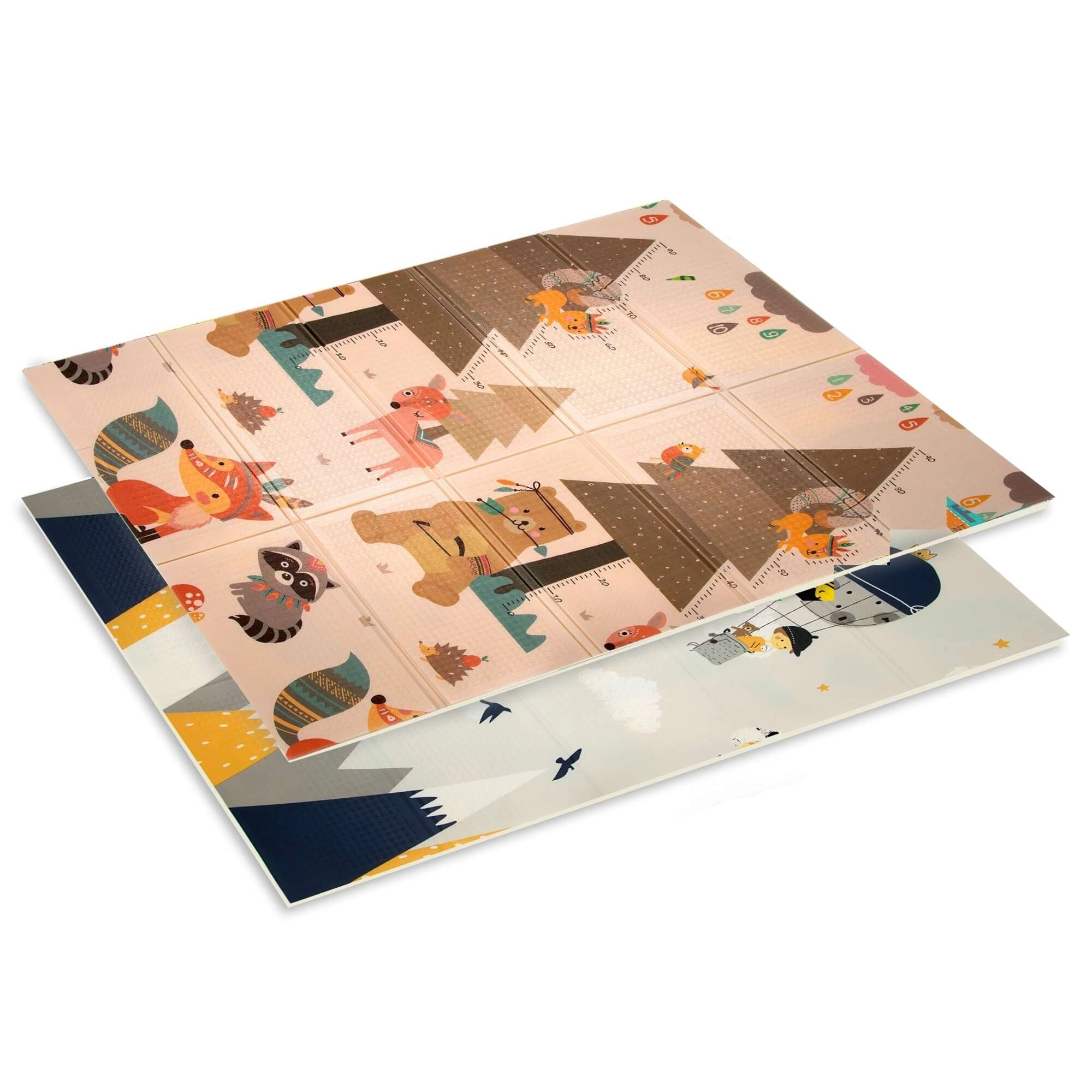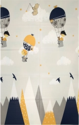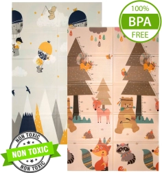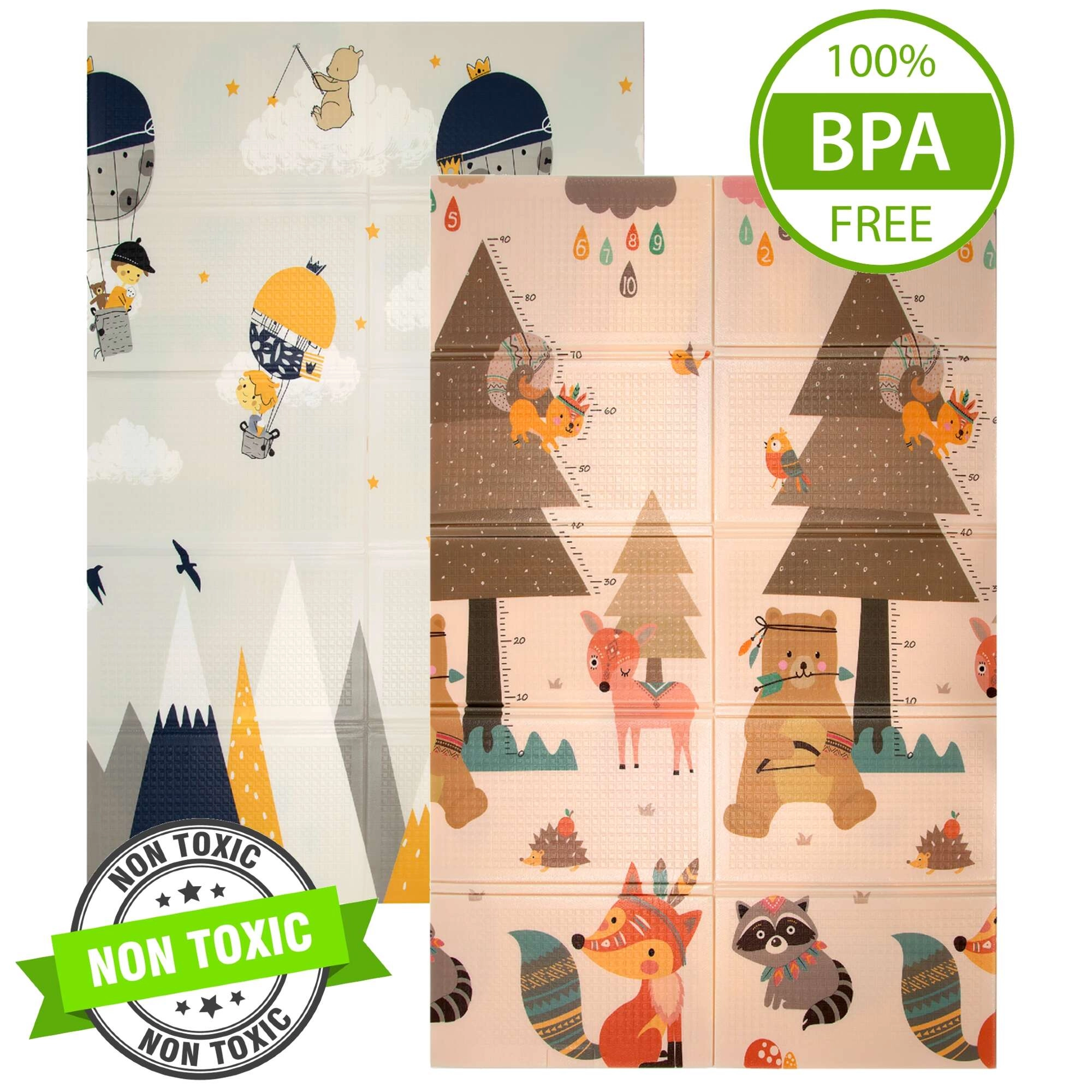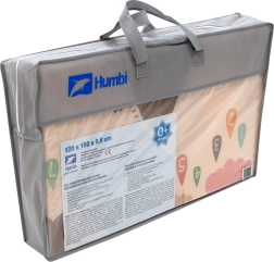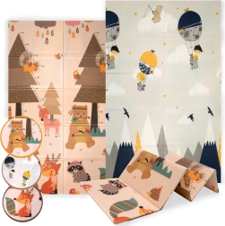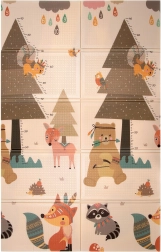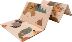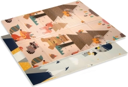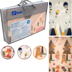 Podloga HUMBI od premium XPE pjene nudi izvrsnu amortizaciju, toplinsku izolaciju od hladnog poda i protukliznu površinu s blagim reljefom za sigurno puzanje i prve korake. Obostrana je – s jedne strane slatke šumske životinje, s druge motiv planina i avanture – tako da lako uskladite izgled s interijerom i djetetovim raspoloženjem.