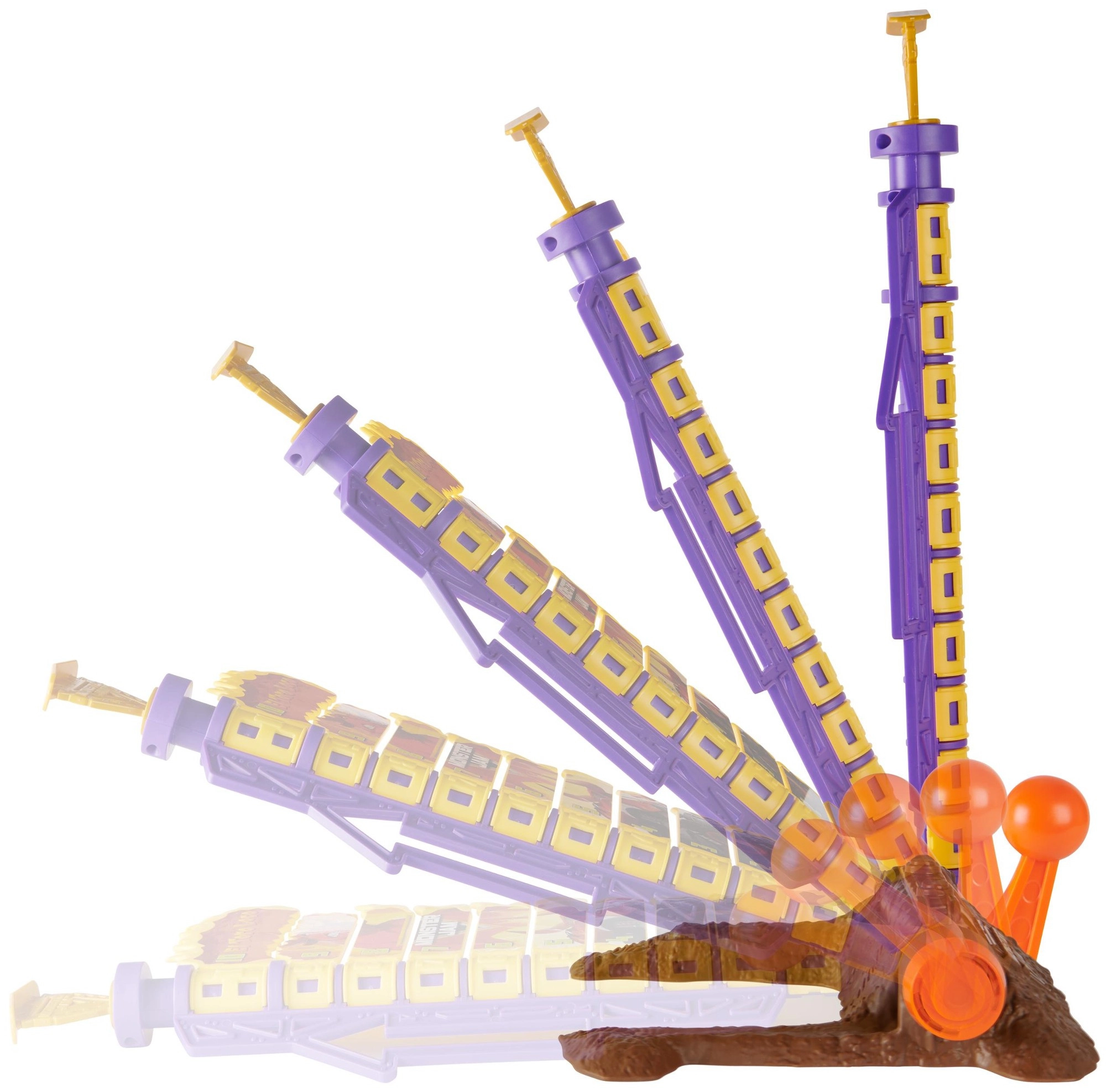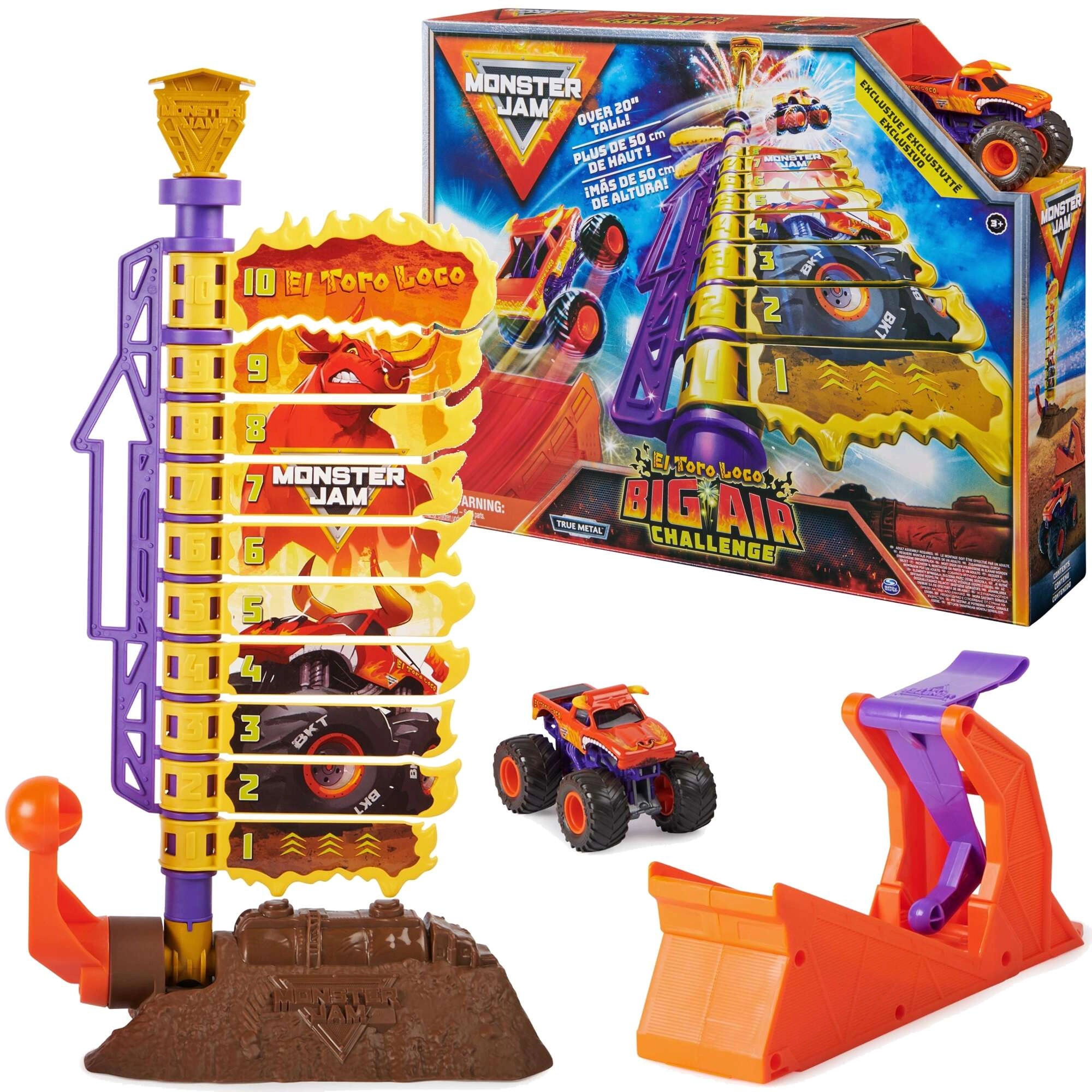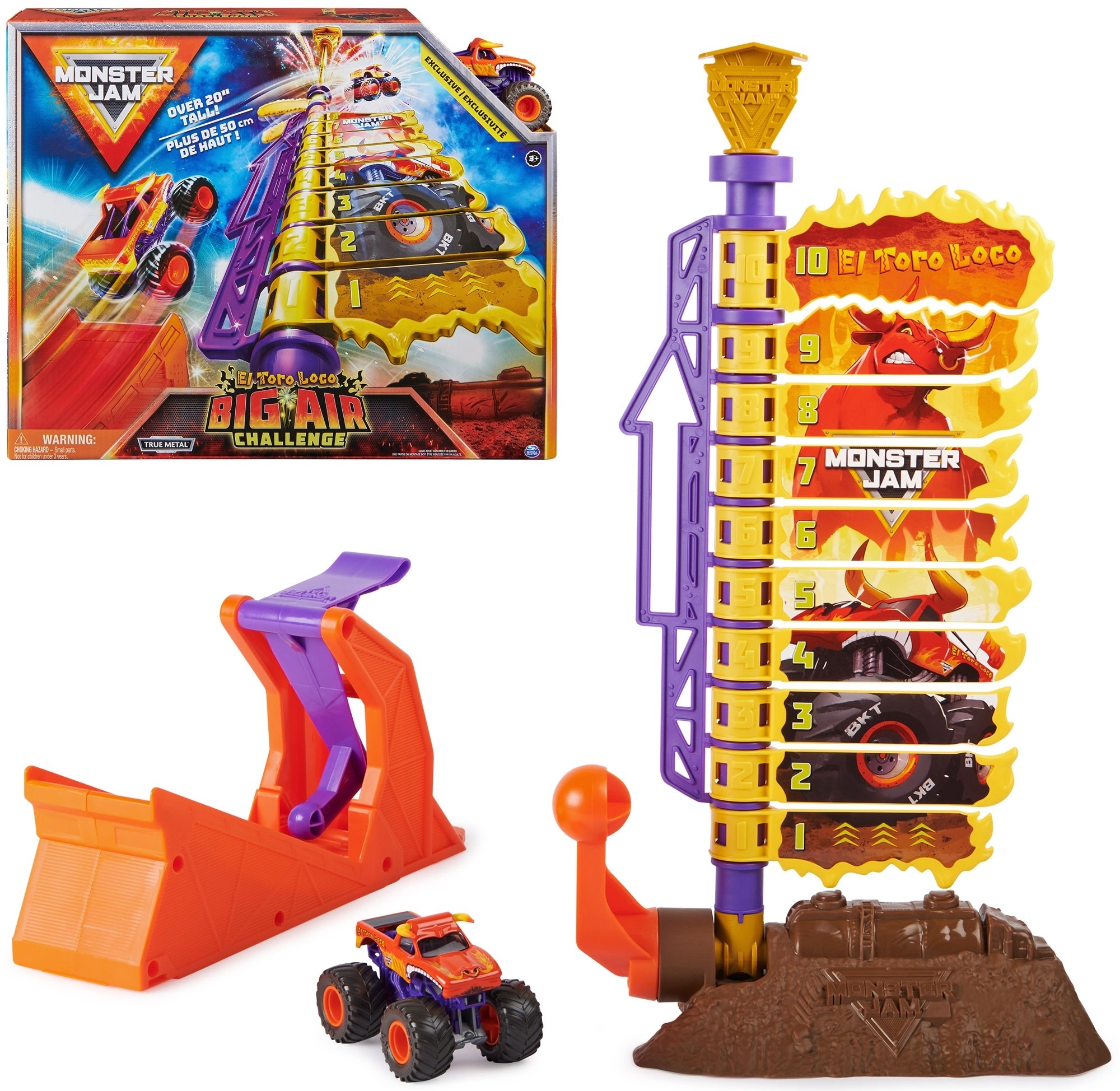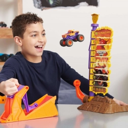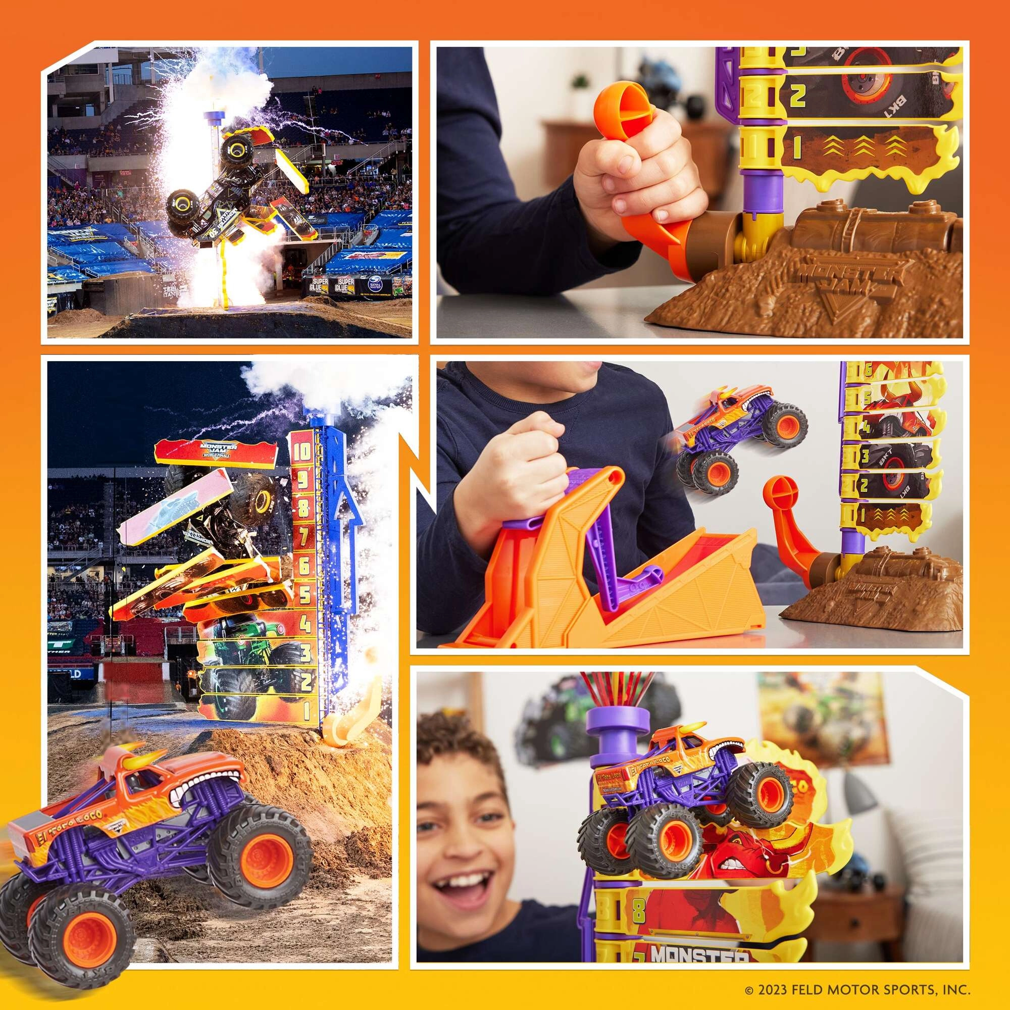 Složite lanser, nanišanite i ispalite svoj kamion EL TORO LOCO u visinu. Skoring kula s numeriranim razinama pokazat će koliko ste visoko poletjeli – dosegnite sam vrh i nagradit će vas efektni “vatromet”. Zahvaljujući 5 podesivih kutova lansera lako prebacujete između visine i daljine skoka i poboljšavate rezultate.
