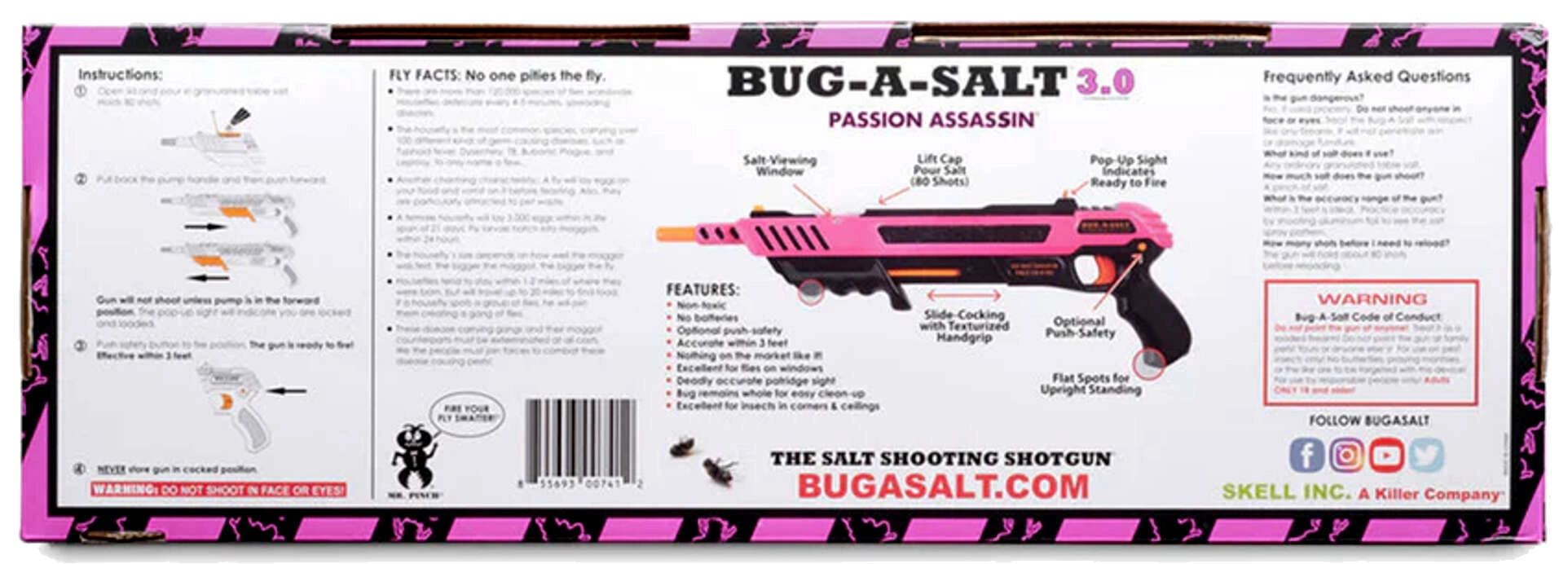 BUG-A-SALT 3.0 Pink Passion Assassin je modernizirana verzija popularne „solne puške“ za odrasle, koja uklanja insekte kratkim hicem kuhinjske soli. Zahvaljujući mehaničkom pogonu bez baterija uvijek je spremna za akciju i pri pravilnoj uporabi neće oštetiti površine poput prozora ili zaslona. Ružičasto‑crni dizajn s narančastim detaljima daje vašem „lovu na muhe“ stil.