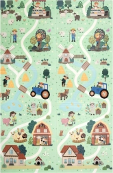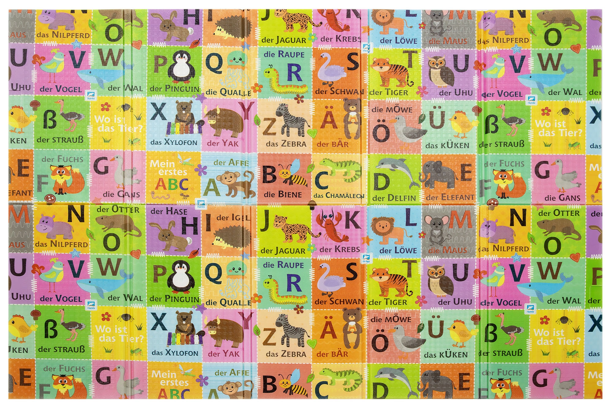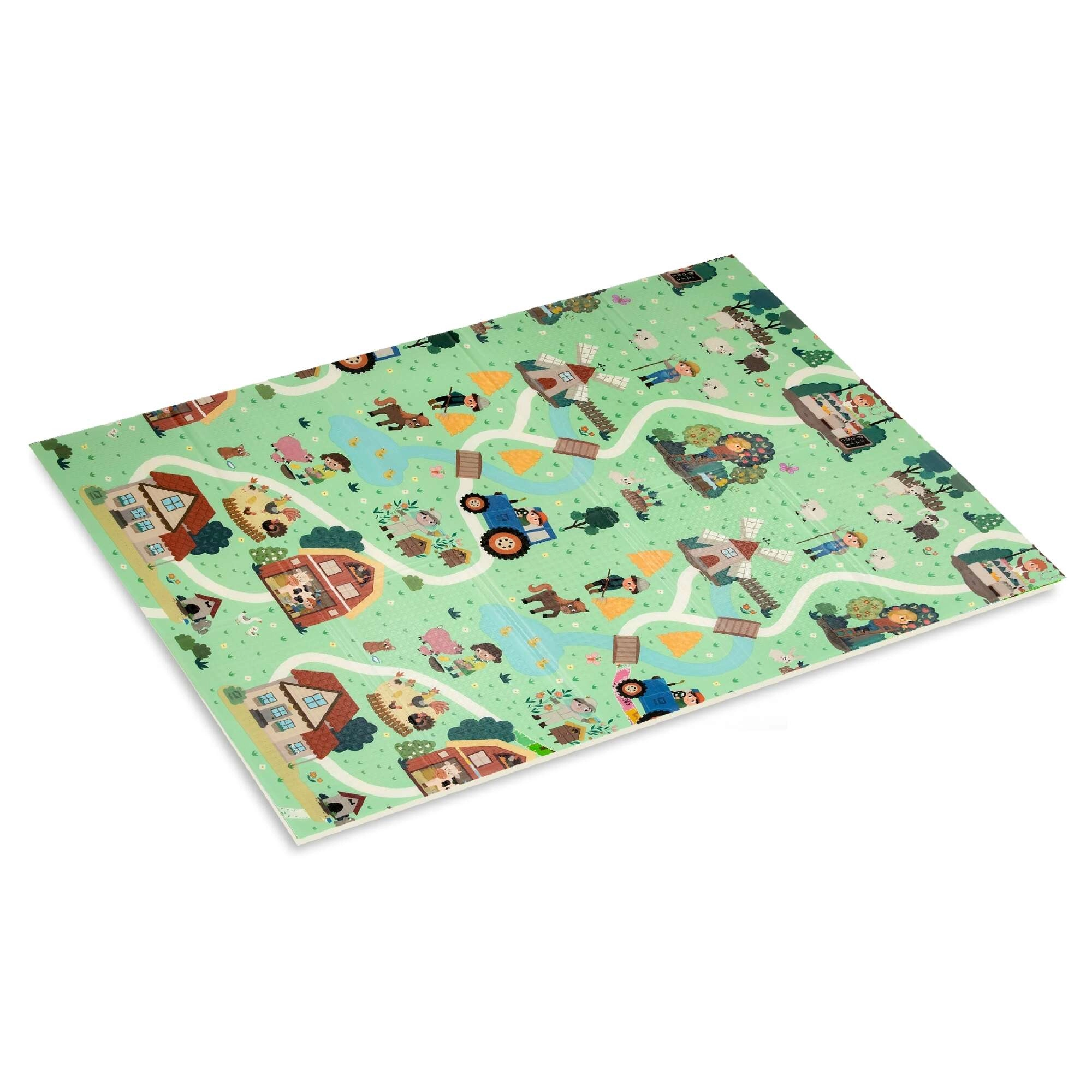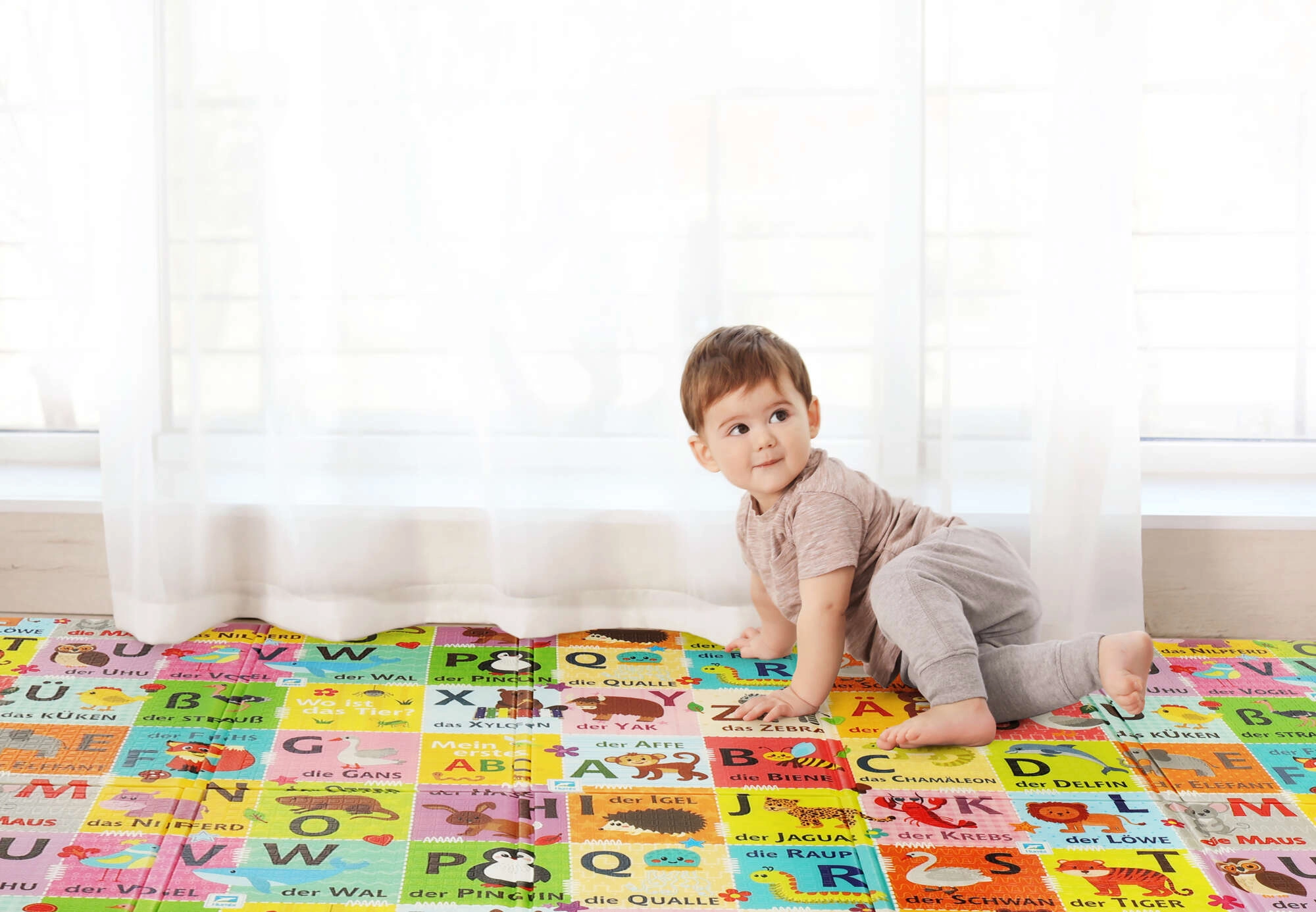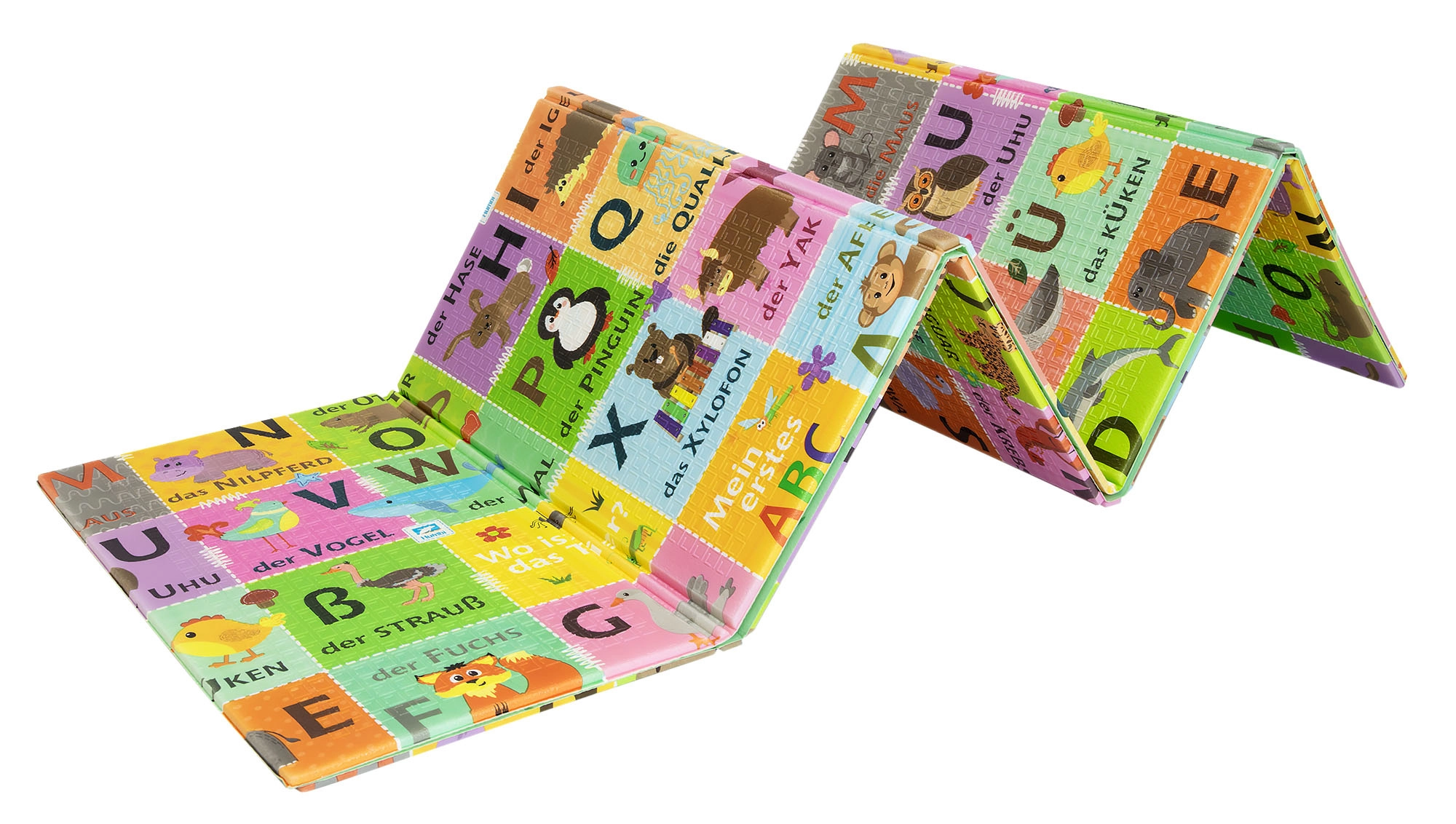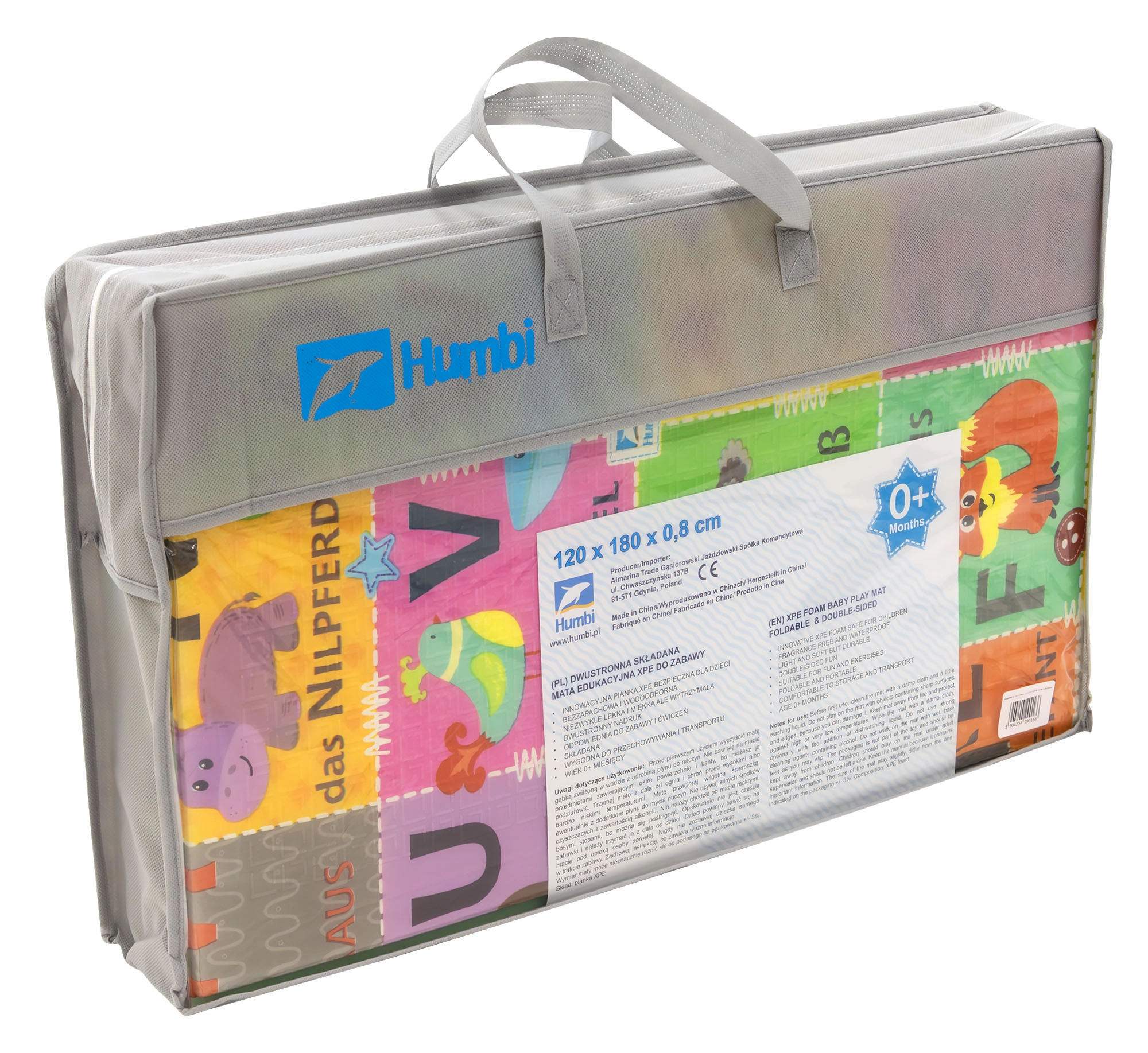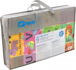 HUMBI podloga od kvalitetne bezzapahne XPE pjene izdržljiva je, elastična i ugodno mekana. Dvostrano izvedenje donosi dvije edukativne grafike – njemačku abecedu sa sličicama i motiv života na farmi za poticanje mašte. Zahvaljujući dimenzijama 120 × 180 × 0,8 cm nudi dovoljno prostora za igru, puzanje i prve korake.