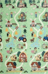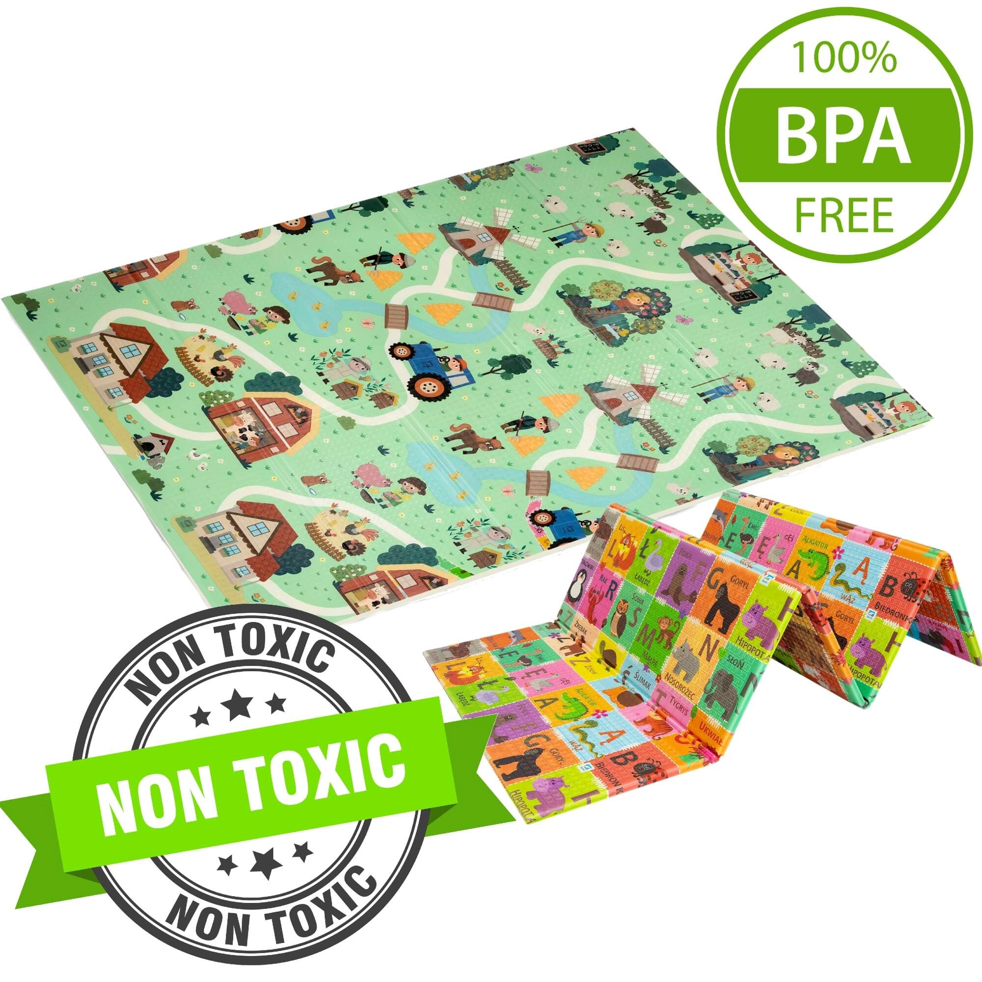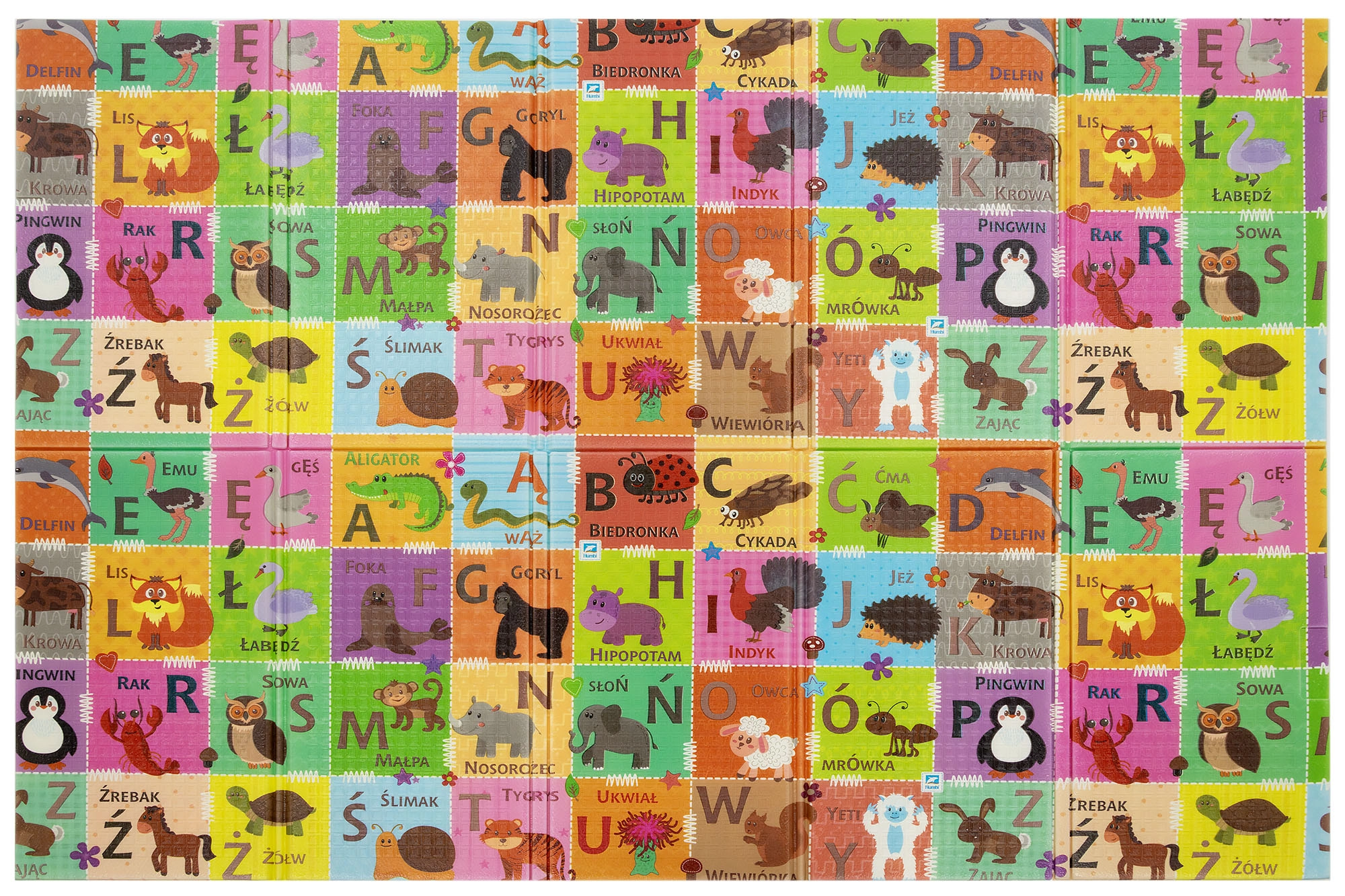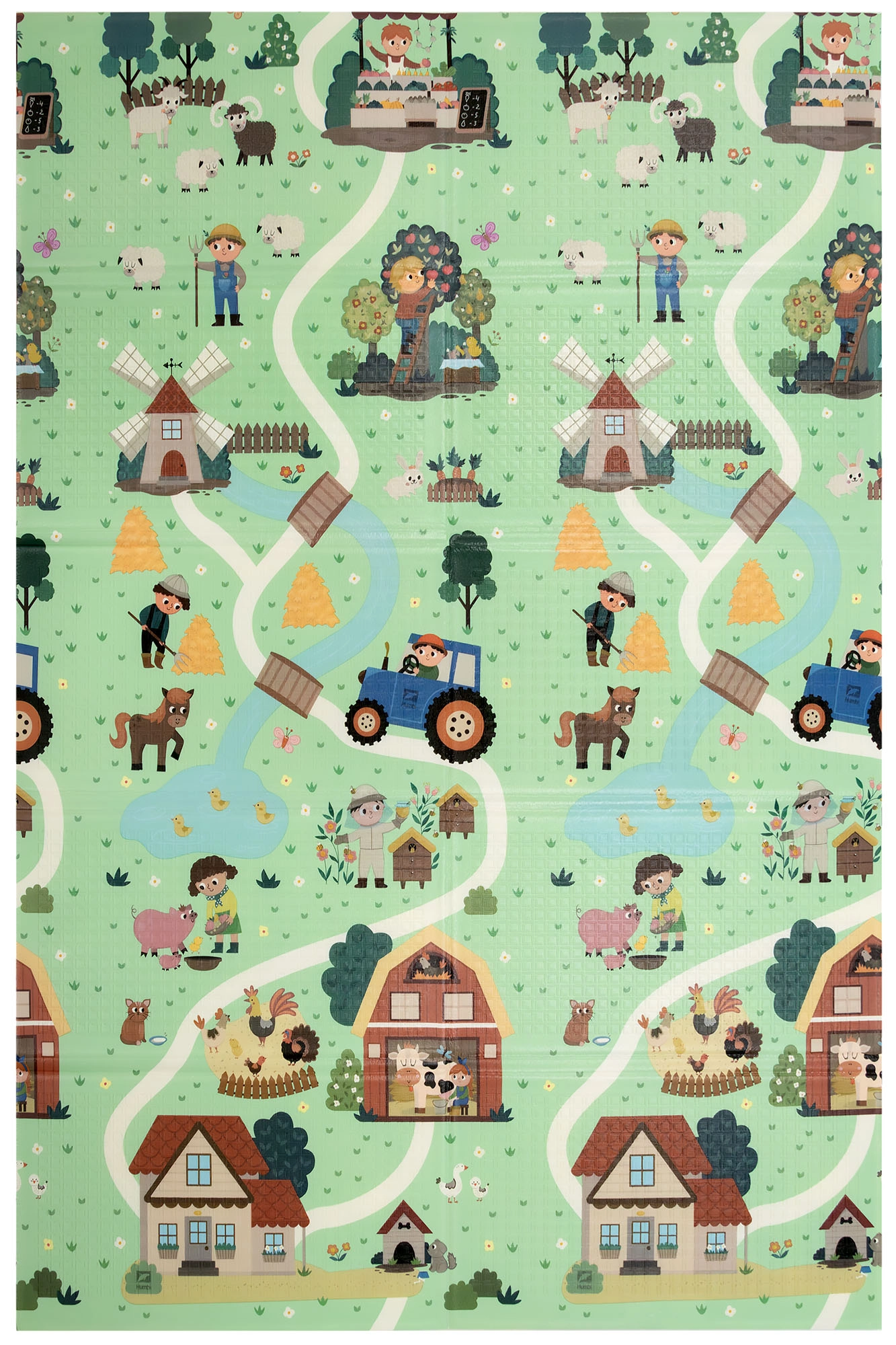 Velika i mekana dječja podloga od XPE pjene nudi udobnost, sigurnost i izvrsnu izolaciju od hladnoće pri igri i prvim koracima. Dvostrana je – s jedne strane šarena abeceda sa životinjama, s druge strane seoski krajolik s cestama za maštovite igre. Podloga je sklopiva, vodootporna, lako se čisti i dolazi s torbom za nošenje.