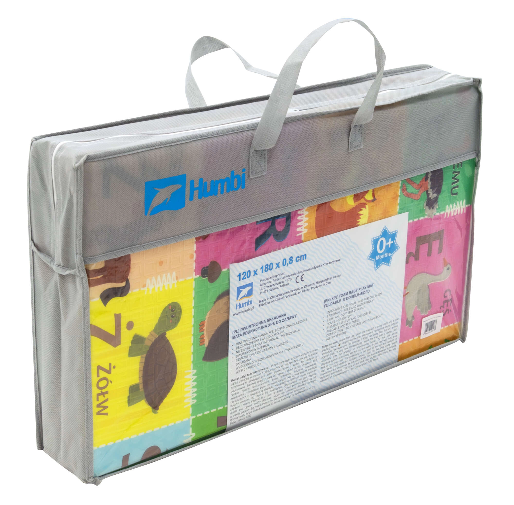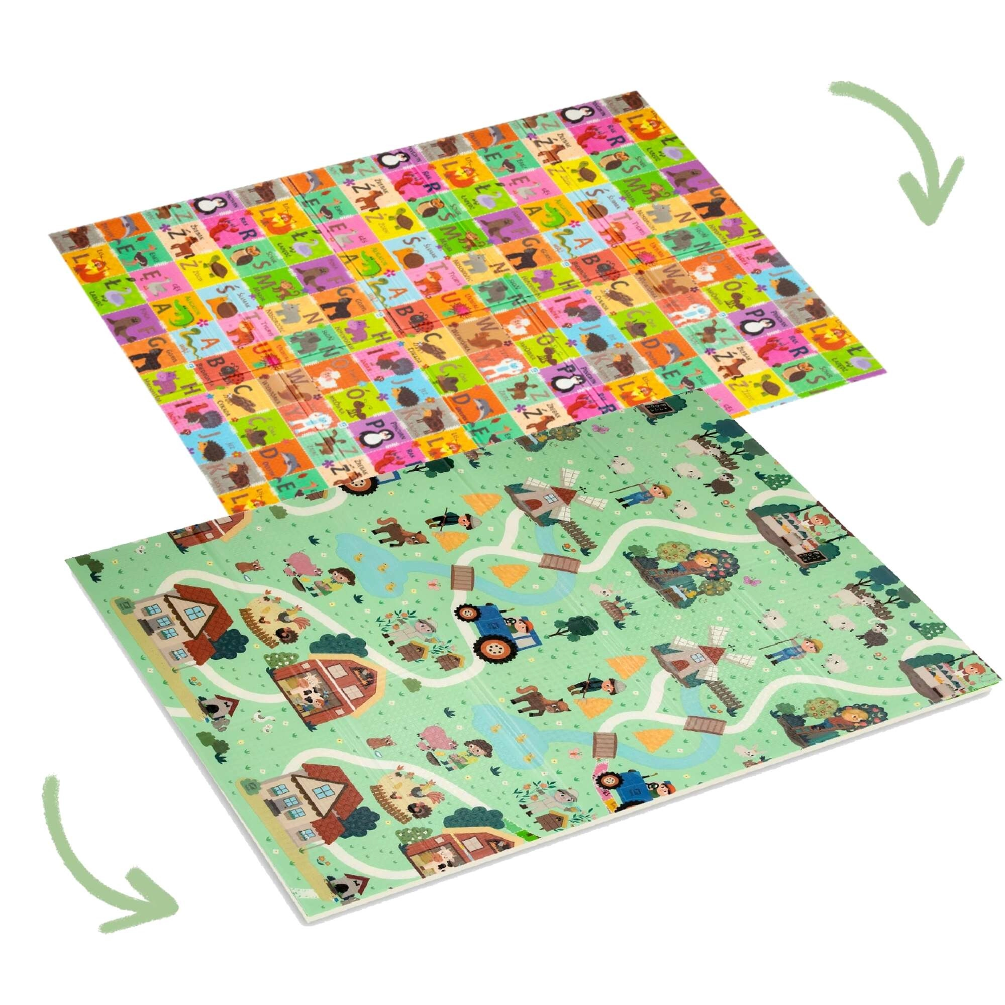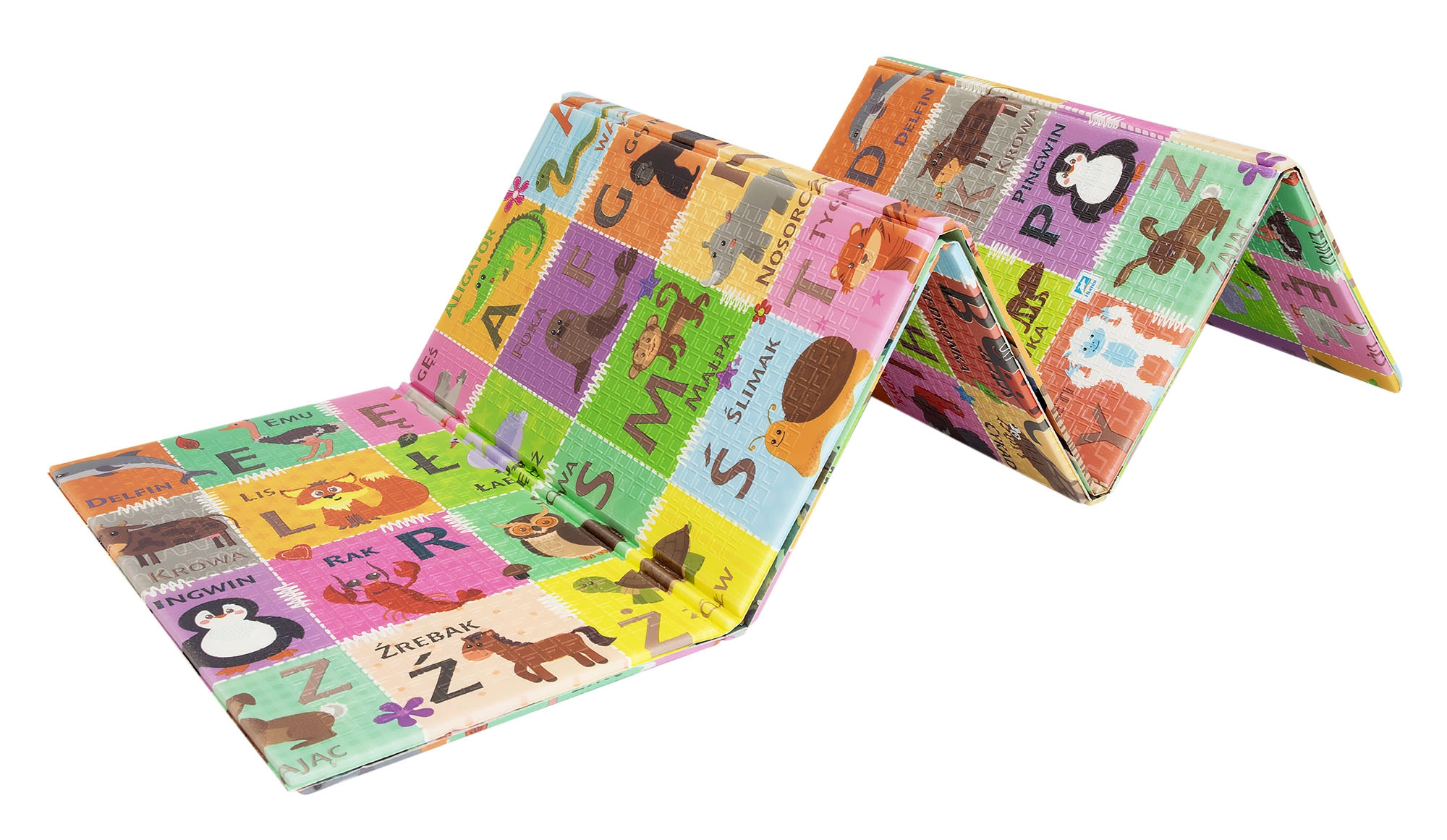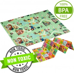 Obostrani dizajn potiče učenje i kreativnost: jedna strana s šarenom abecedom i životinjama razvija prepoznavanje slova, druga strana sa selom, kućicama i cestama poziva na maštovitu igru. Podloga je protuklizna, vodootporna i higijenska – dovoljno ju je obrisati vlažnom krpom. Zahvaljujući sklopivoj konstrukciji brzo je složite, lako pospremite i uz priloženu torbu s ručkom udobno prenesete.