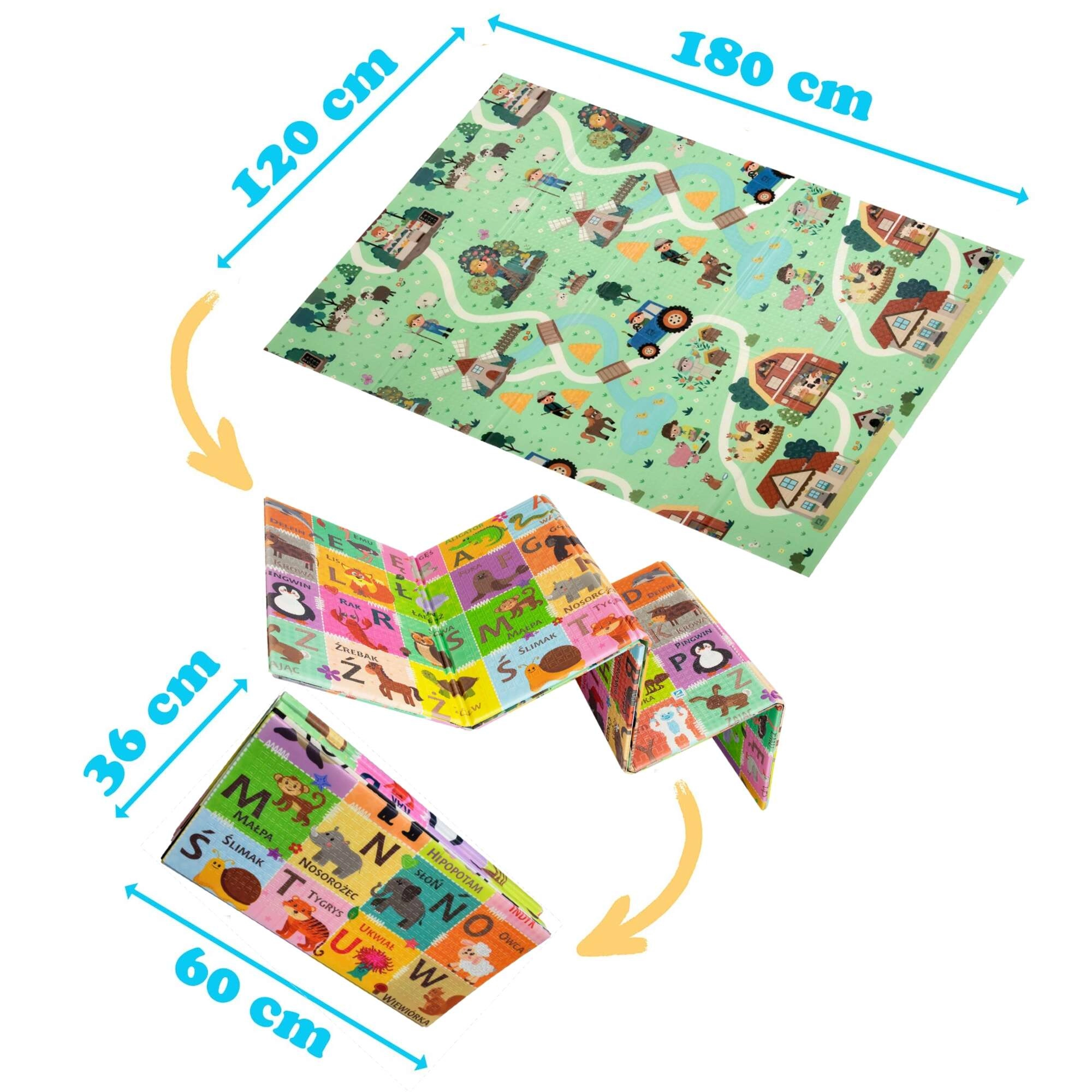 Dvostrana sklopiva pjenasta podloga za igru XPE 120 × 180 cm s abecedom i motivom sela