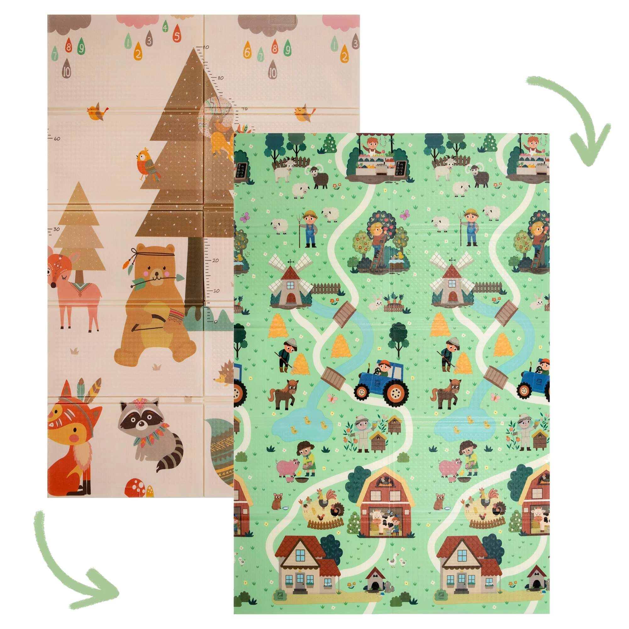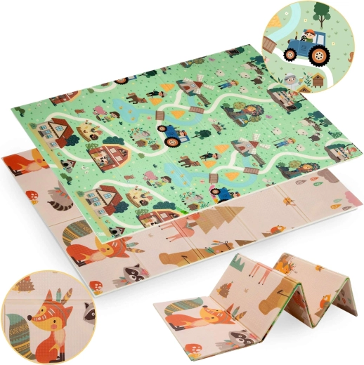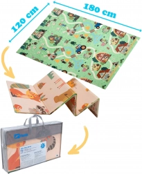 Jedna strana prikazuje šumske životinje, druga selo s cestama za autiće. Mijenjajte motive prema raspoloženju i potičite maštu i osjetilnu percepciju.