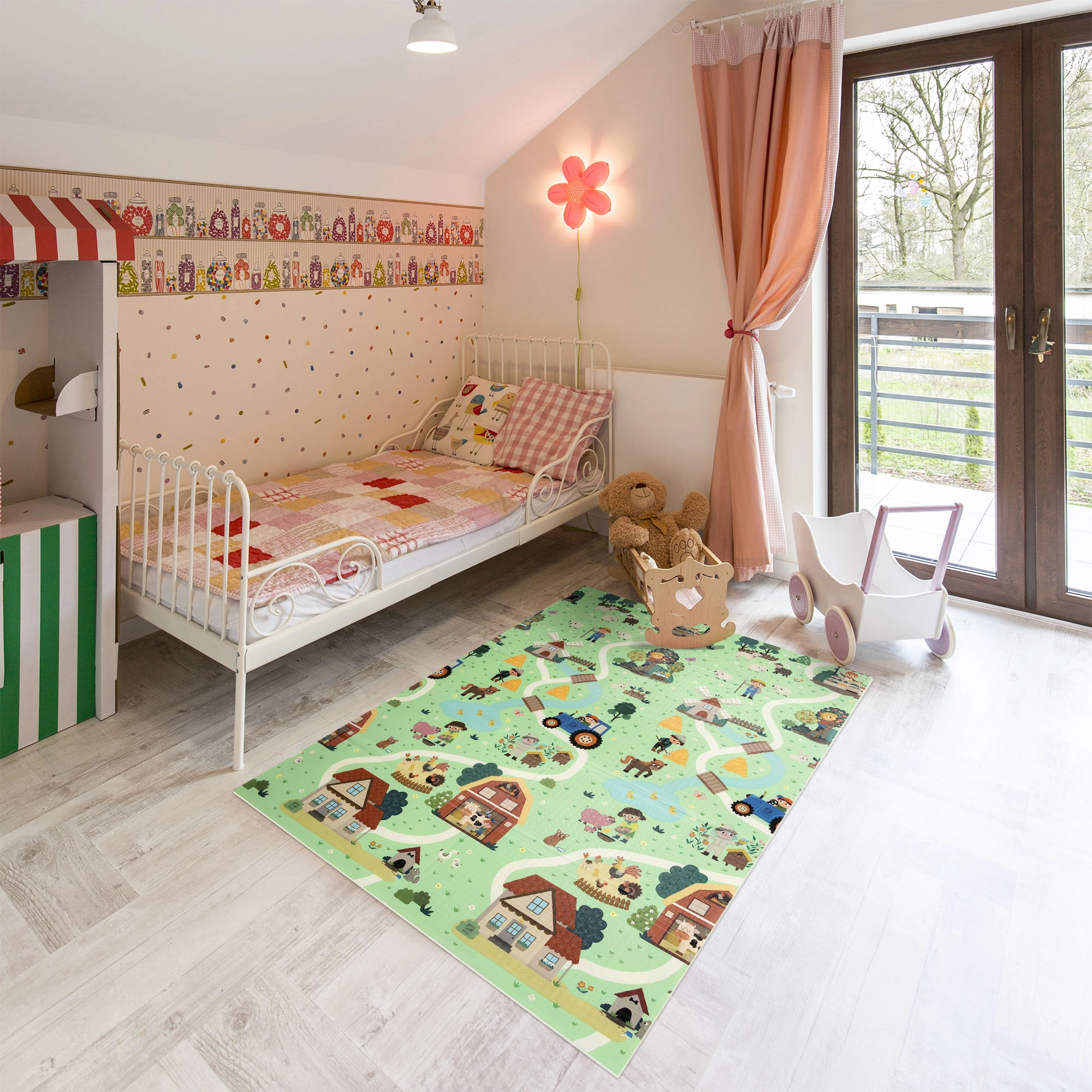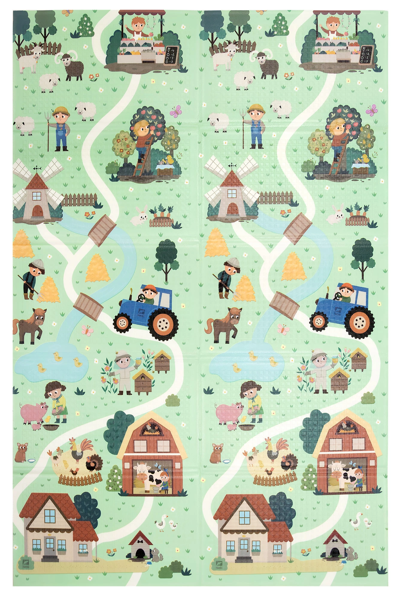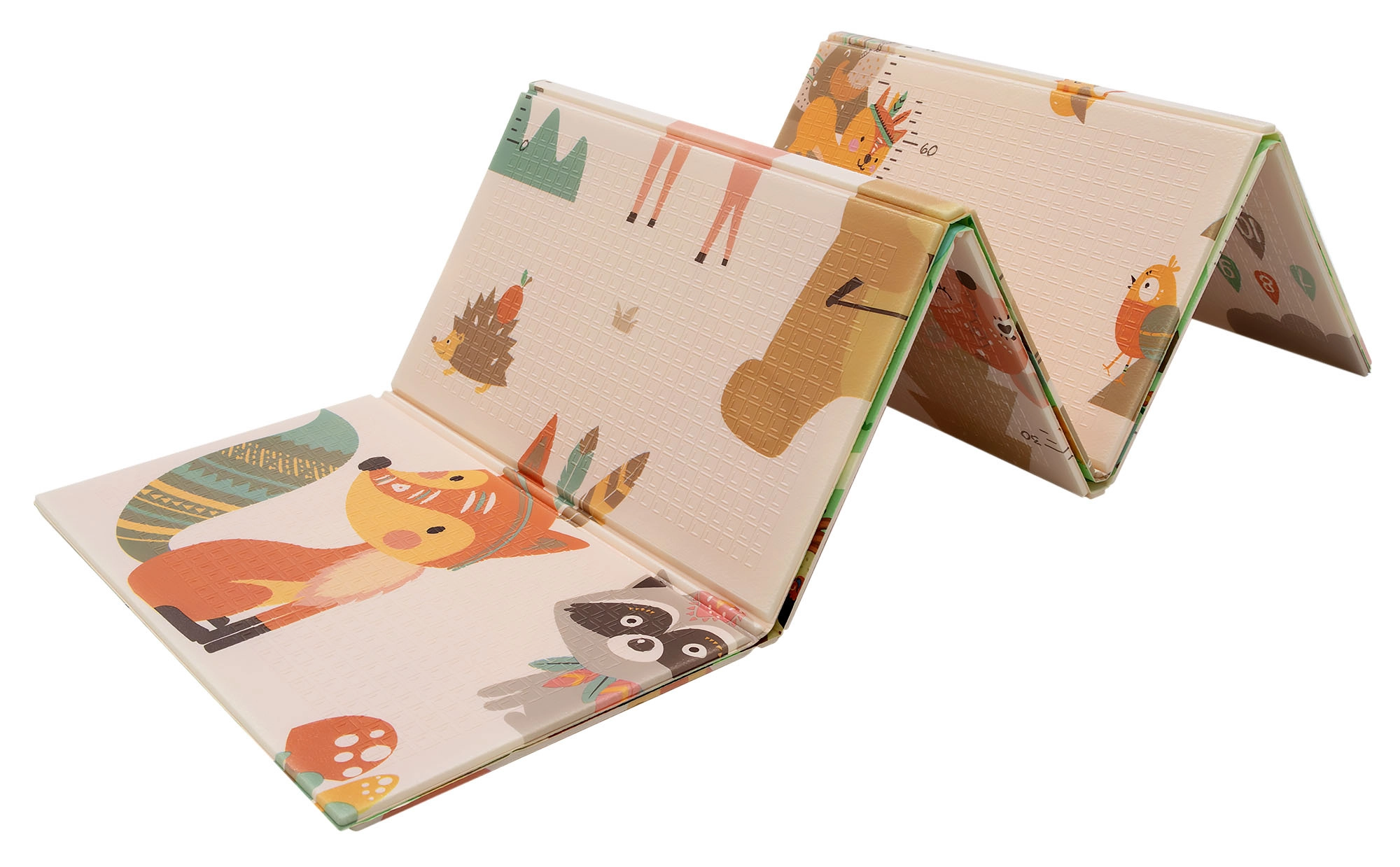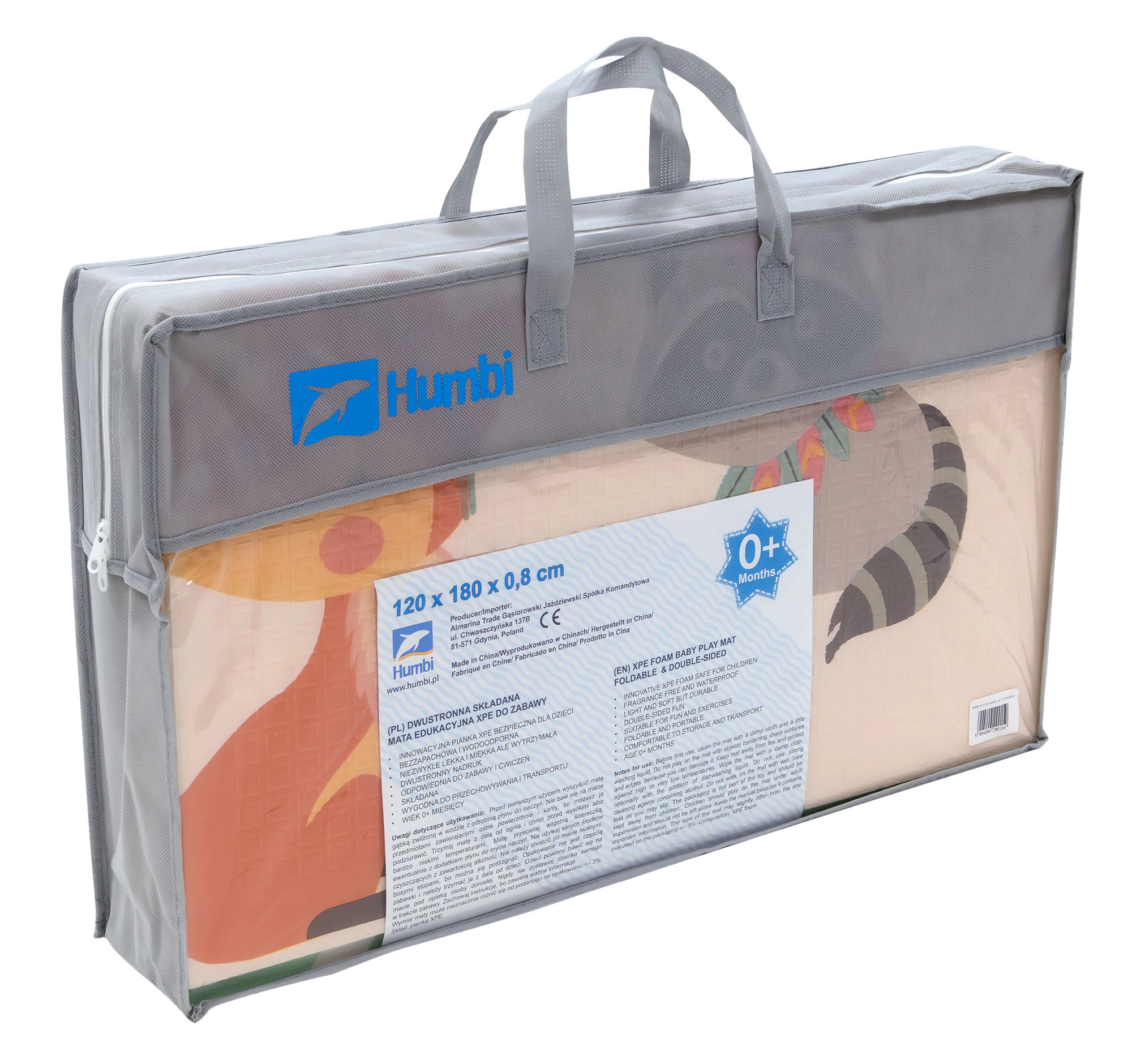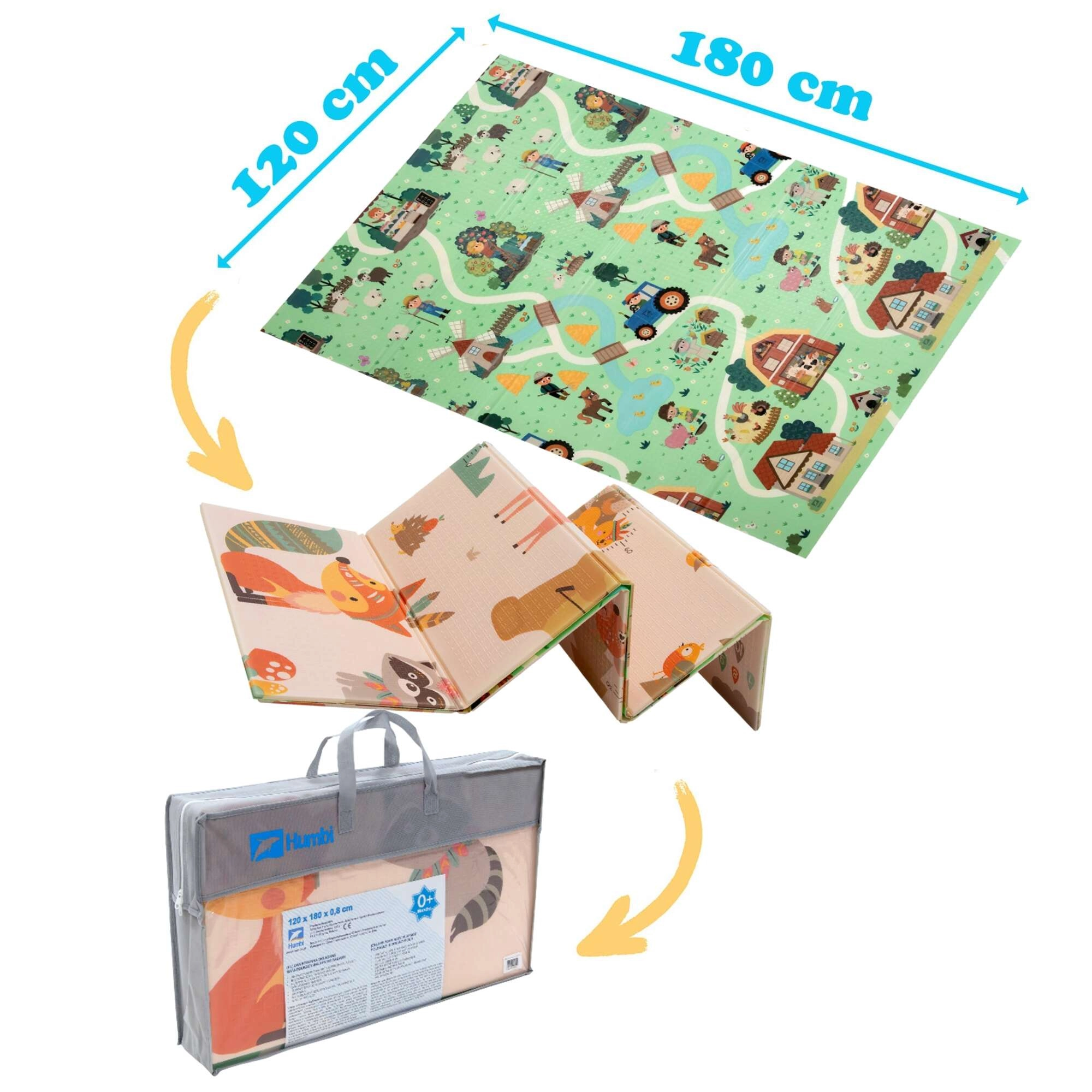 Podloga se brzo sklapa u harmonika oblik, pa je lako spremiti ispod kreveta ili uspravno iza namještaja. Vodootporna i jednostavna za čišćenje površina dovoljan je obrisati vlažnom krpom; nježna protuklizna tekstura povećava stabilnost i sigurnost. U kompletu je torba s patentnim zatvaračem i ručkom za praktično prenošenje kući, na terasu, piknik ili na put.