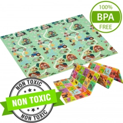 Dvije razigrane strane potiču razvoj djeteta: šarena abeceda sa životinjama i motiv sela s cestama za vožnju autićima i istraživanje. Podlogu lako sklopite u par sekundi, prenesete u priloženoj torbi, a zahvaljujući vodootpornoj površini dovoljno ju je obrisati vlažnom krpom.