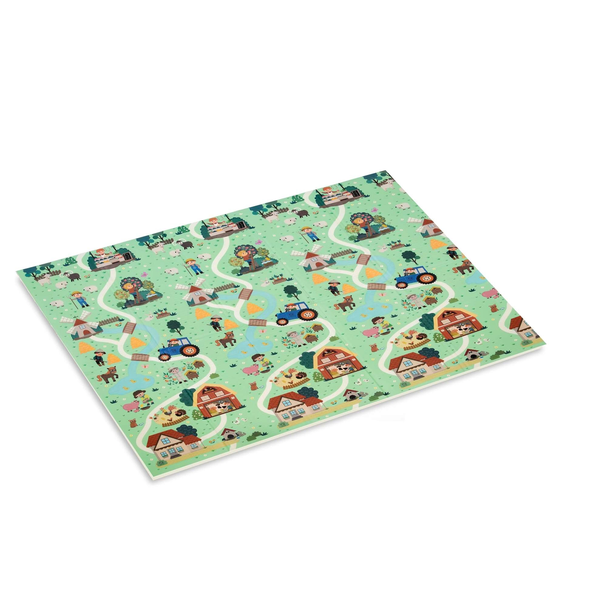 Jedna strana s kolorističnom abecedom i životinjama potiče razvoj rječnika, druga strana s motivom farme i cesta idealna je za igru autićima i maštu.