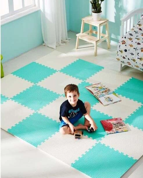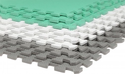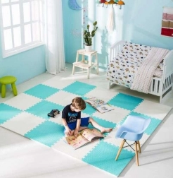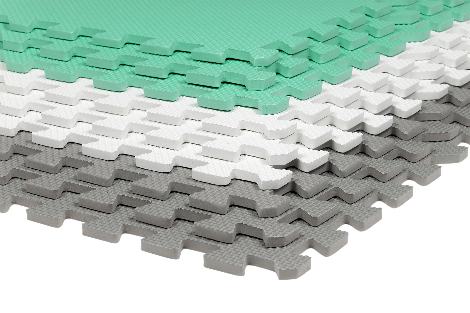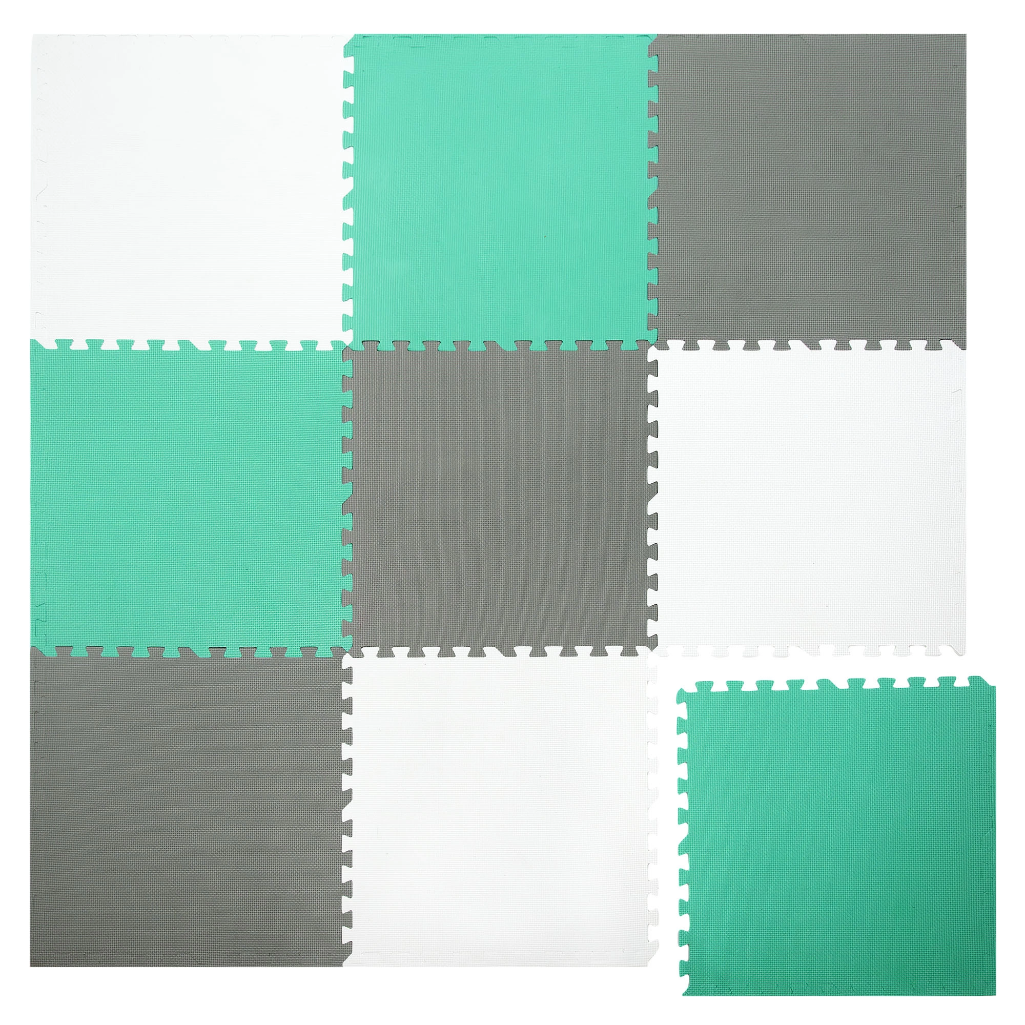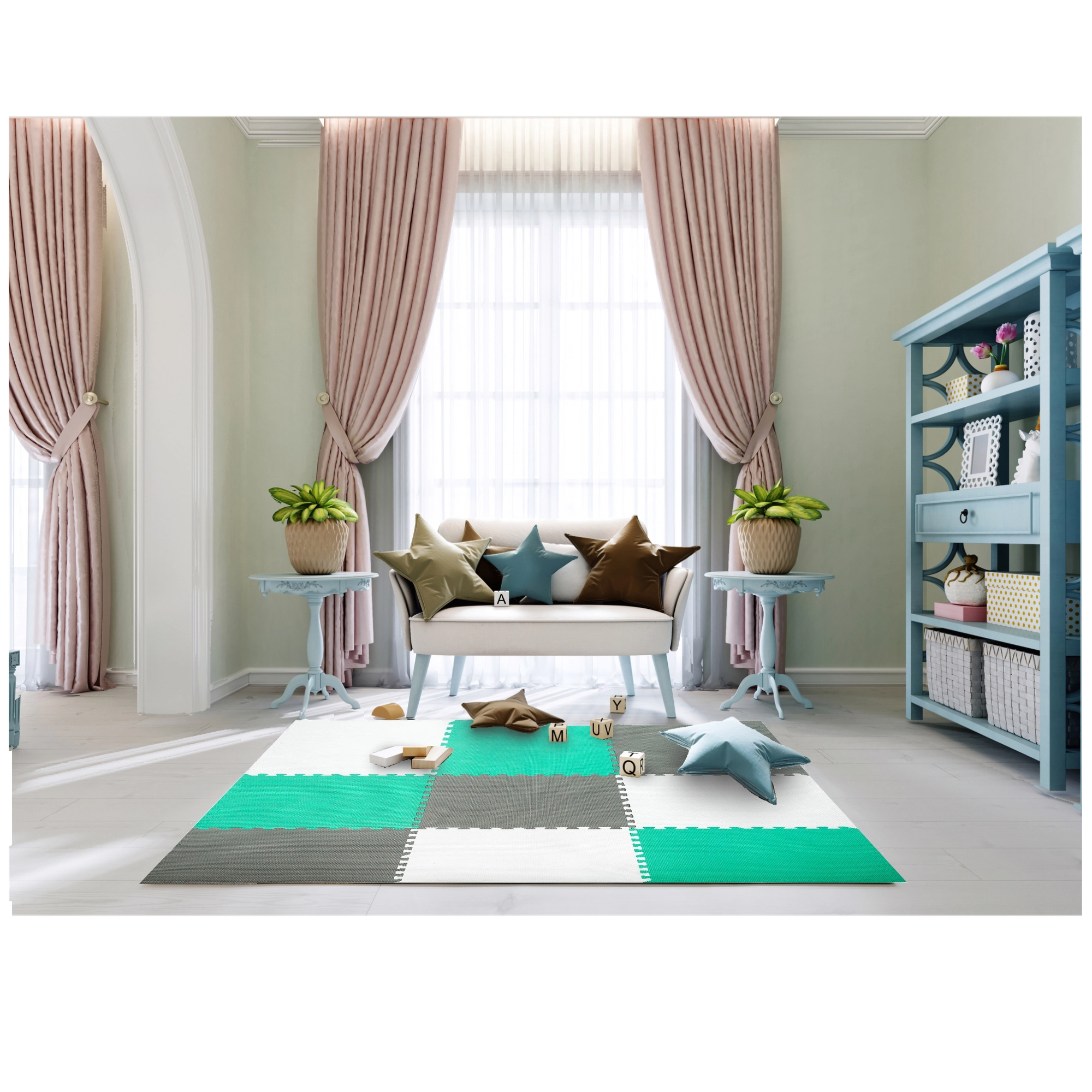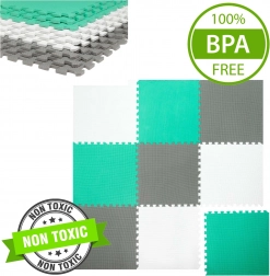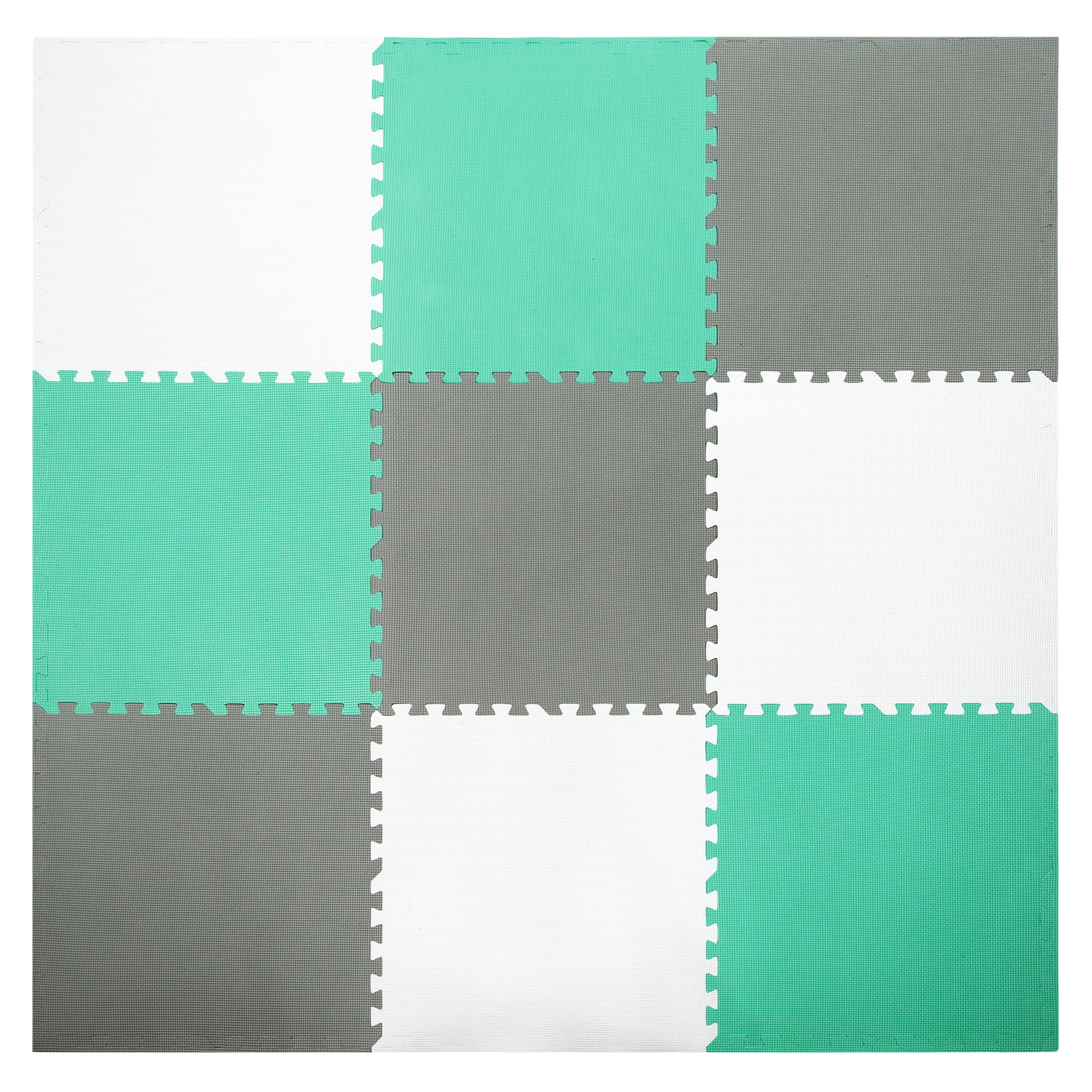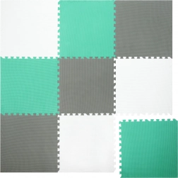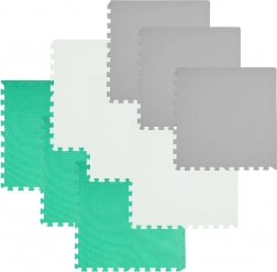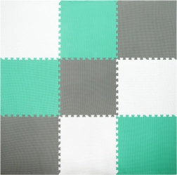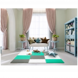 9 velikih dijelova 60 × 60 cm (uključujući 18 rubova) lako ćete spojiti u površinu 180 × 180 cm ili ih kombinirati s dodatnim setom istog modela i stvoriti veću zonu za igru. Materijal je vodootporan i lako se čisti – dovoljno je prebrisati vlažnom krpom. Neutralne mint, siva i bijela boje uklapaju se u svaki interijer i ne odvlače dječju pažnju.