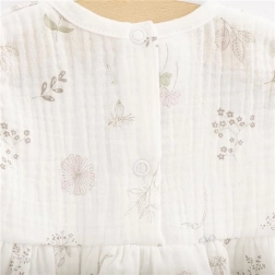 Mušelin od 100% pamuka nije samo iznimno ugodan, već i izdržljiv – svakim pranjem postaje još mekši i zadržava svoj oblik. Straga kopčanje na druker olakšava brzo presvlačenje, pa je haljina odlična za svakodnevno nošenje i ljetne šetnje.