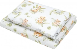 Nježna i sigurna posteljina za bebe od 100% pamuka u setu od 3 dijela: jastučnica 40×60 cm, navlaka za poplun 100×135 cm i zaštitna obloga (mantinel) 31×175 cm. Prozračan materijal, sigurni patentni zatvarači bez slobodno visećih završetaka i hipoalergena ispuna za miran i zdrav san. Postojane boje i ugodne, umirujuće nijanse s motivom Jungle.