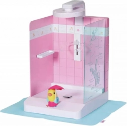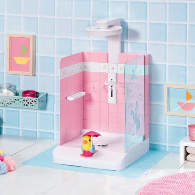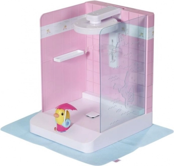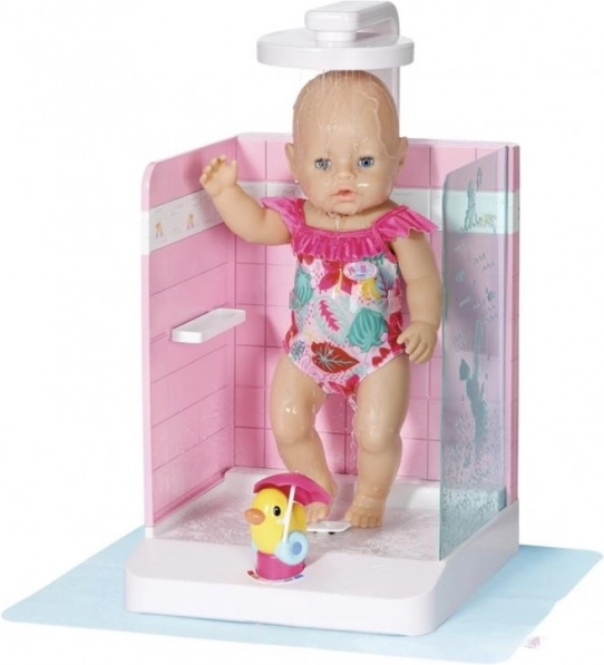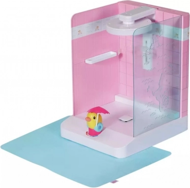 Tuš kabina za lutke BABY born pretvara svaku kupaonicu u zabavno vodeno igralište. Dovoljno je okrenuti pačića Bertu i pokreće se elektronička pumpa koja osigurava mlaz prave vode iz tuš ruže. Zamišljena miješalica u obliku pačića prikazuje temperaturu (bez stvarnog zagrijavanja), pa djeca mogu uživati u realističnoj igri kupanja.