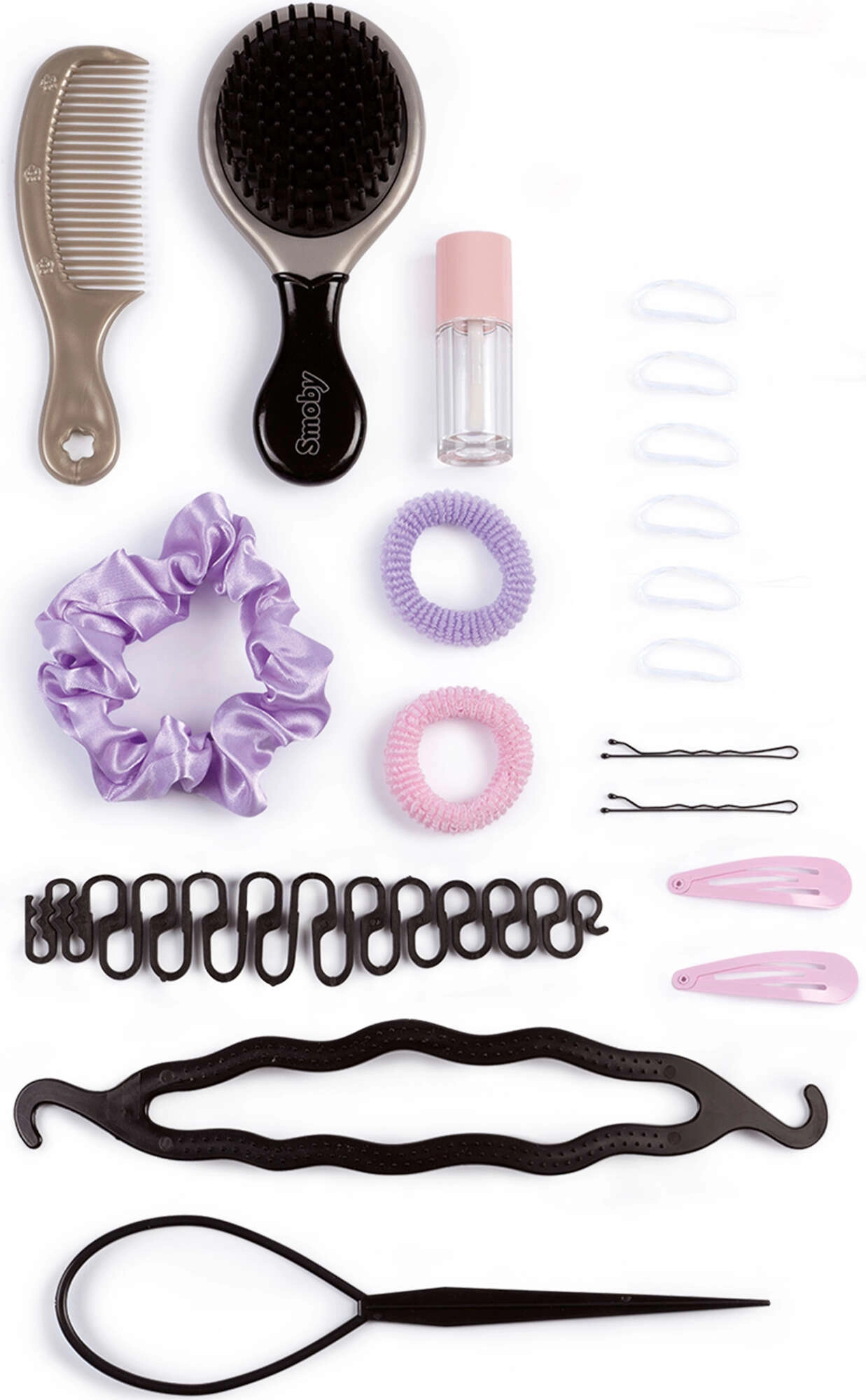 Četka, češalj, gumice, ukosnice, špangice, prozirne gumice i posebni alati za pletenje za lako stvaranje frizura.