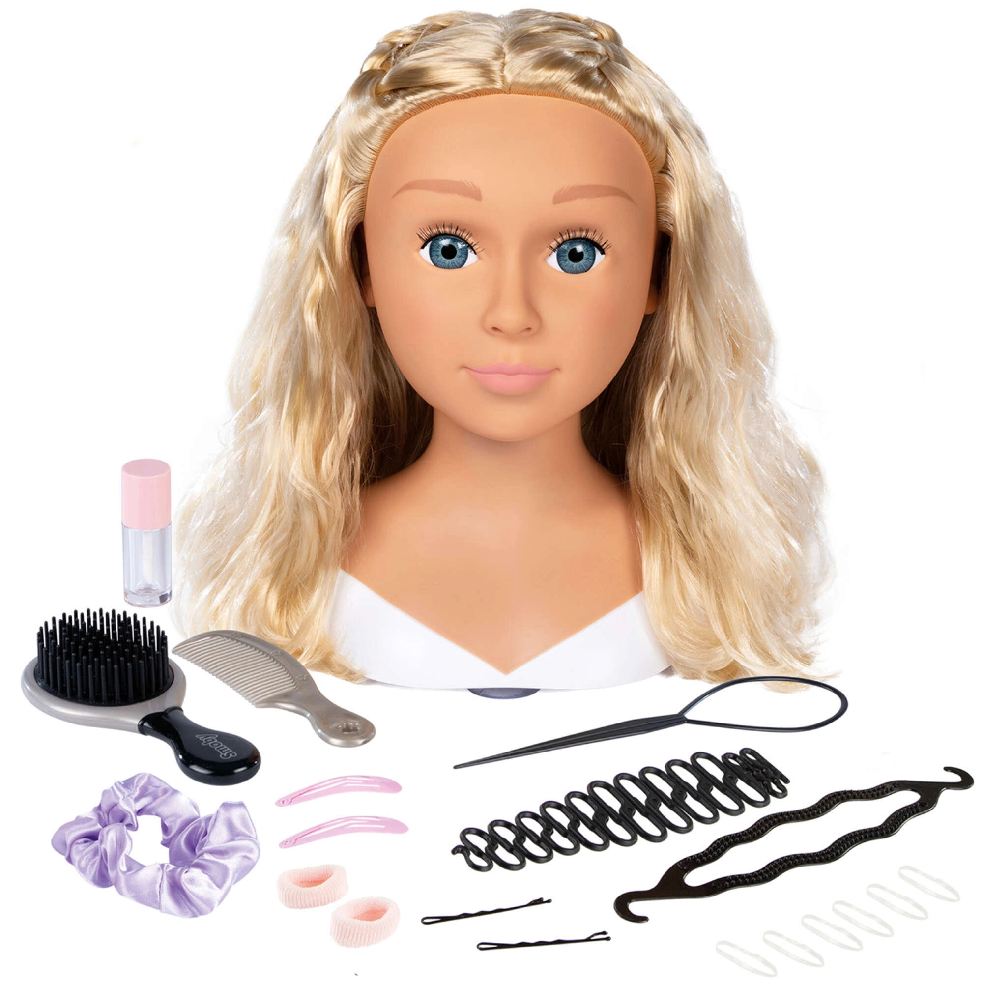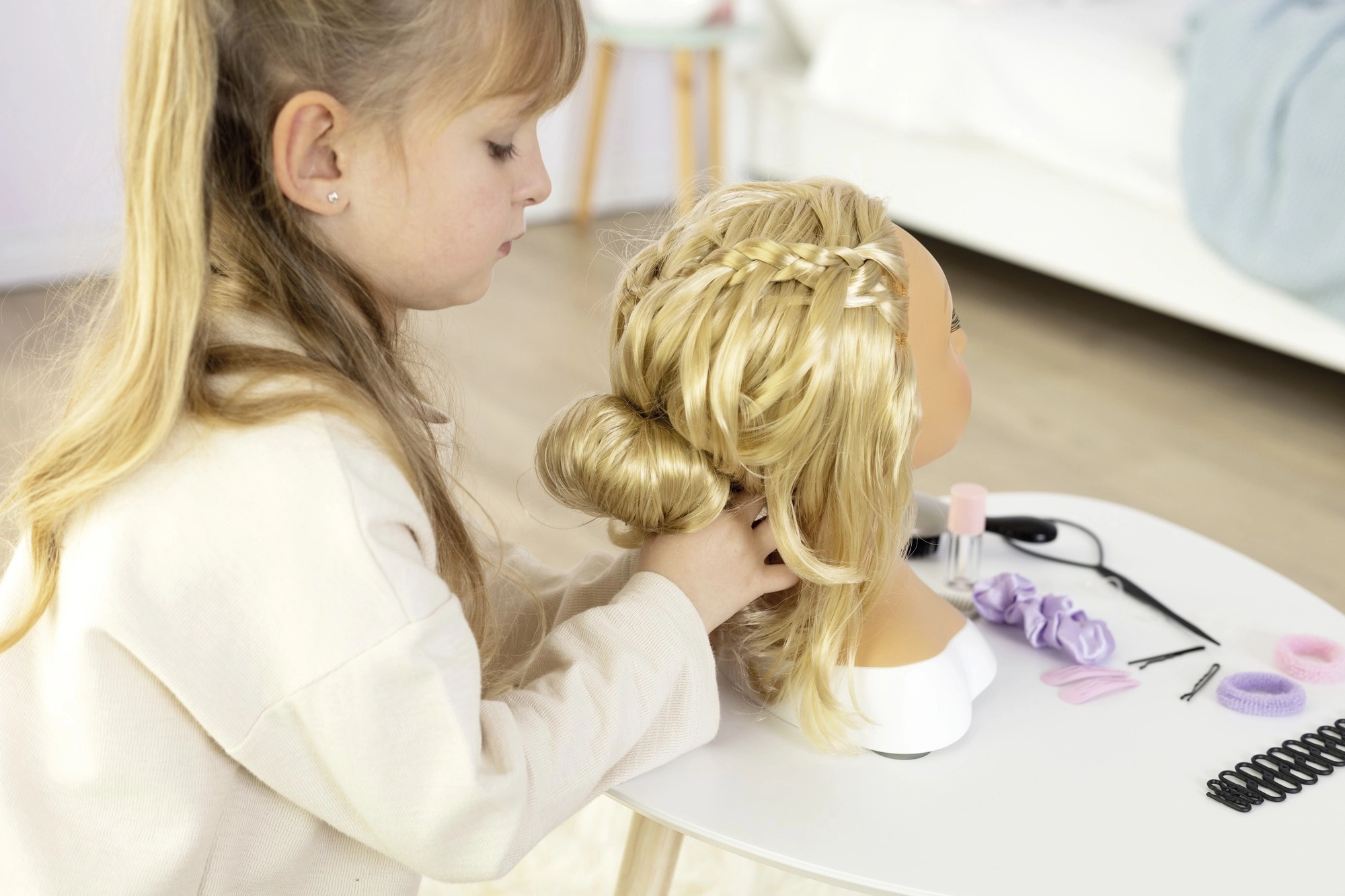 Stilistička glava, četka, češalj, ukosnice, špangice, gumice, alati za pletenje, dječji “magični” sjaj za usne