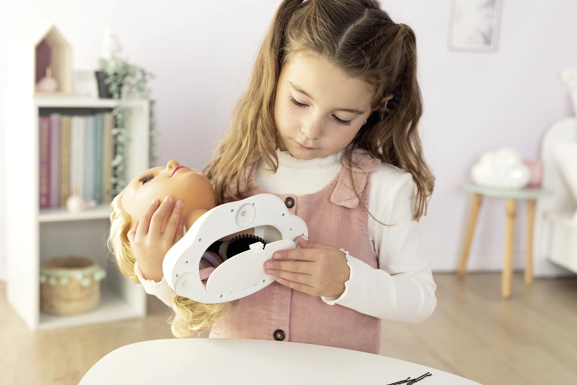 Otkrijte kreativni svijet frizura sa stilističkom glavom s dugom plavom kosom i plavim očima brenda SMOBY. Zahvaljujući bogatom setu od 19 frizerskih i styling dodataka djeca vježbaju češljanje, pletenje i ukrašavanje kose te razvijaju maštu, finu motoriku i osjećaj za estetiku. Dio kompleta je i siguran dječji “magični” sjaj za usne koji mijenja boju toplinom.