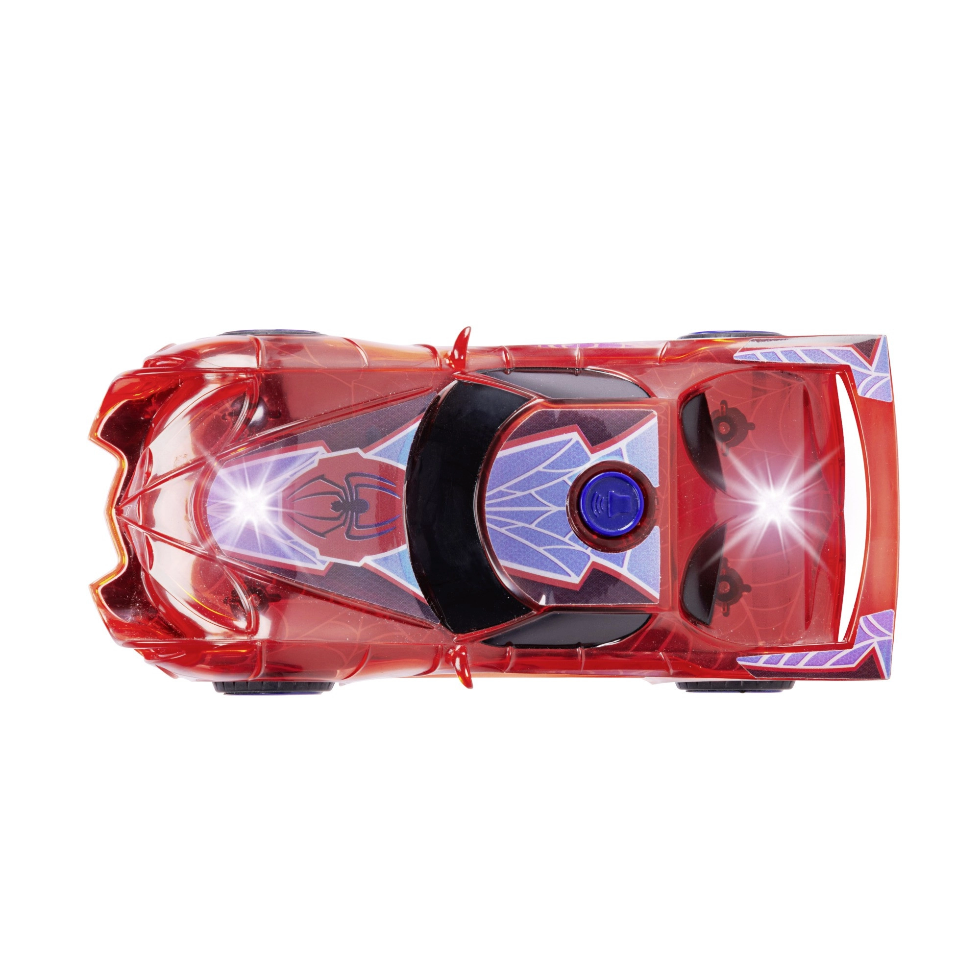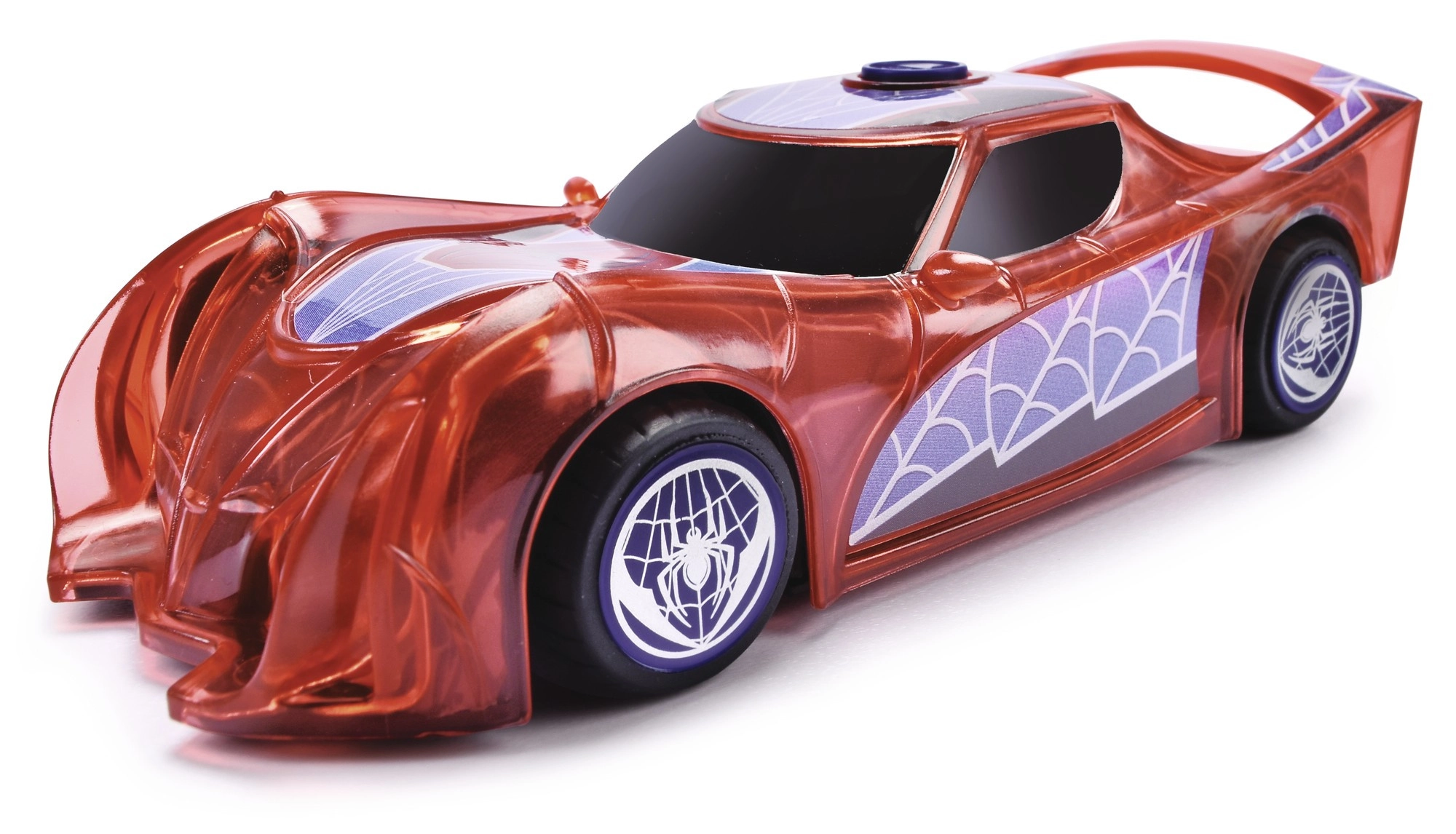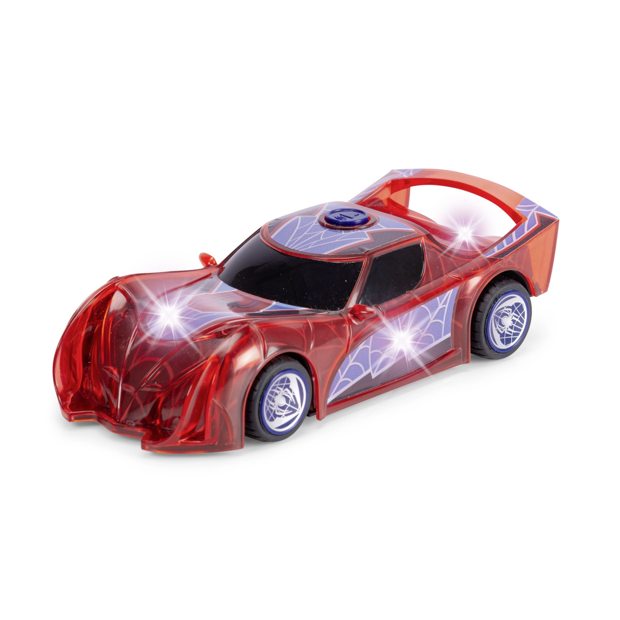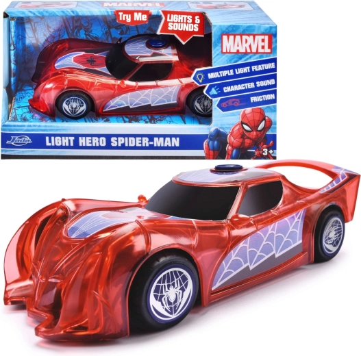 Superjunački automobil SPIDER-MAN u karakterističnoj crvenoj boji i s paučinskim detaljima ističe se prozirnim dizajnom i ugrađenim LED svjetlima koja osvjetljavaju svaku pustolovinu. Jednostavan push-and-go mehanizam (frikcijski pogon) dovoljan je lagano pogurnuti i auto juri naprijed.