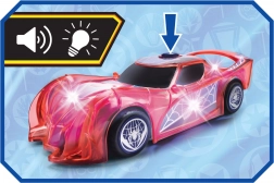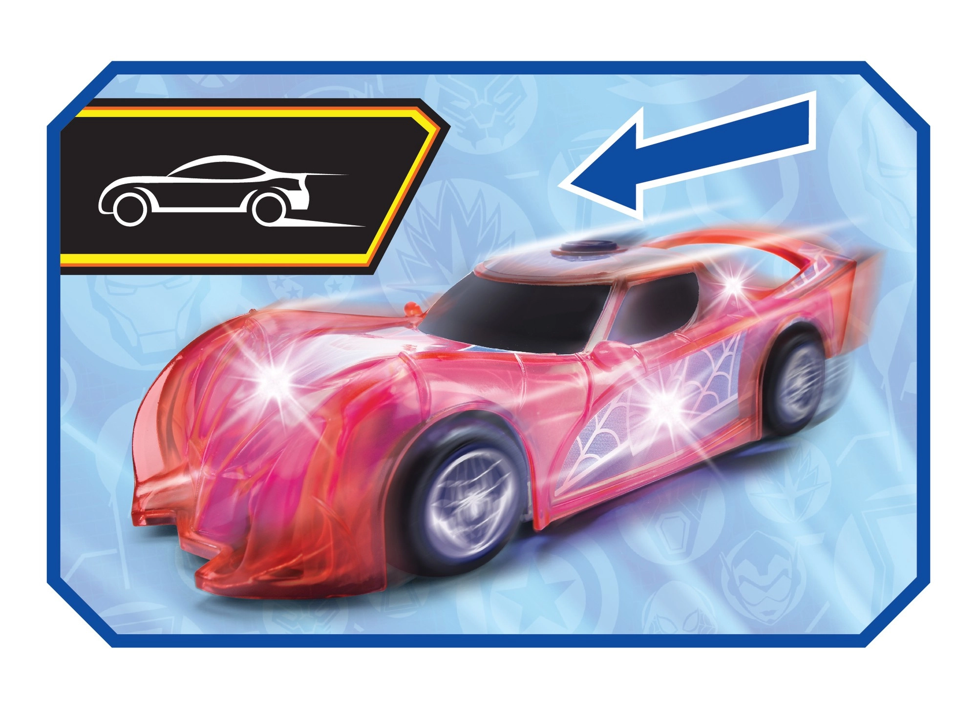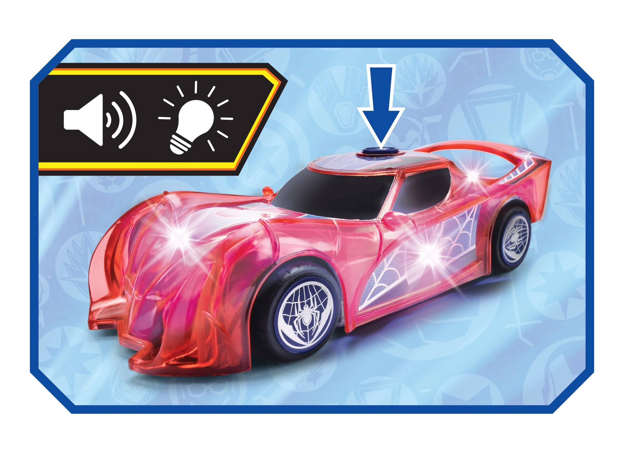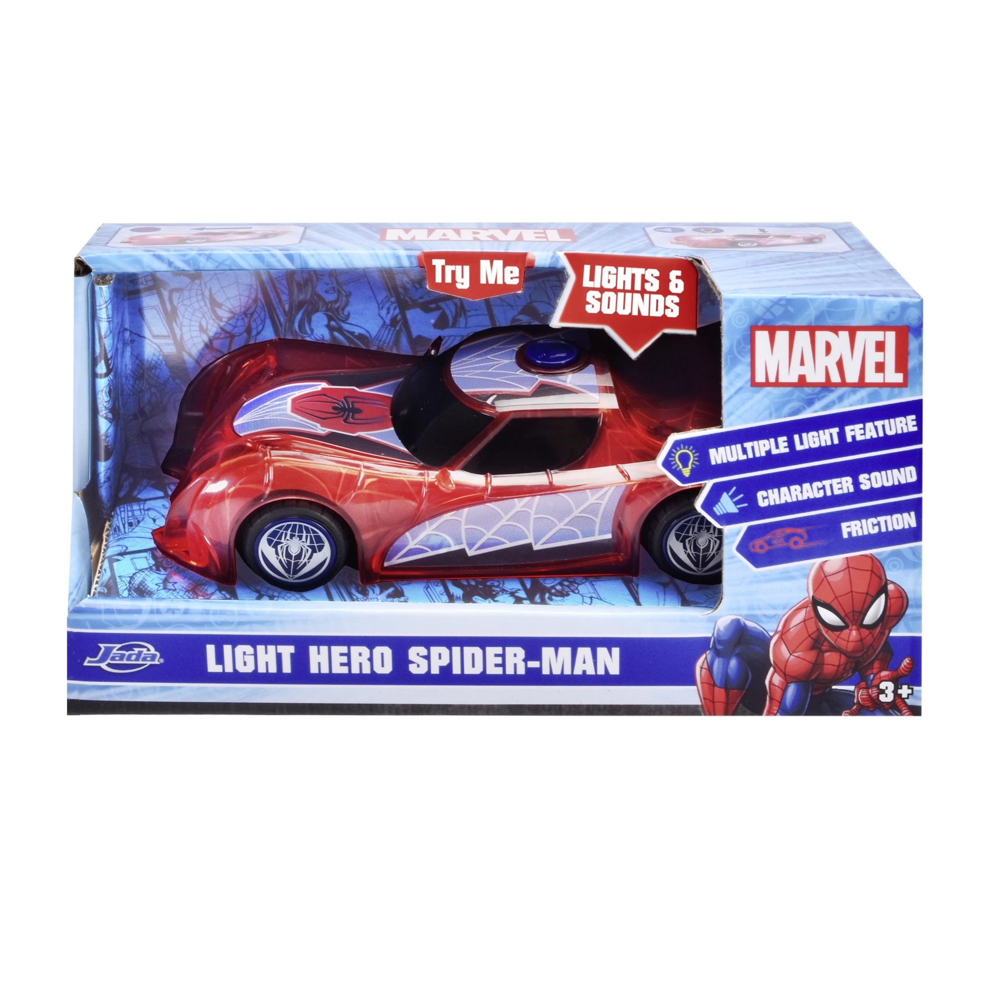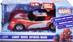 Superjunački automobil SPIDER-MAN u karakterističnoj crvenoj boji i s paučinskim detaljima ističe se prozirnim dizajnom i ugrađenim LED svjetlima koja osvjetljavaju svaku pustolovinu. Jednostavan push-and-go mehanizam (frikcijski pogon) dovoljan je lagano pogurnuti i auto juri naprijed.