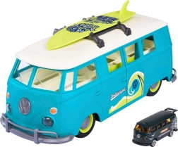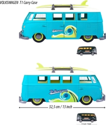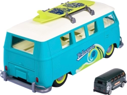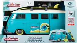 Veliki interaktivni Volkswagen T1 marke MAJORETTE oduševit će preciznom izradom i autentičnim detaljima legendarnog kampera. Nosač u obliku dostavnog vozila u plavo-zelenoj izvedbi s krem detaljima otvara se u praktični igraći kovčeg s parkirnim mjestima za priloženi autić. Prednji gumb u obliku VW logotipa aktivira jaka svjetla.
