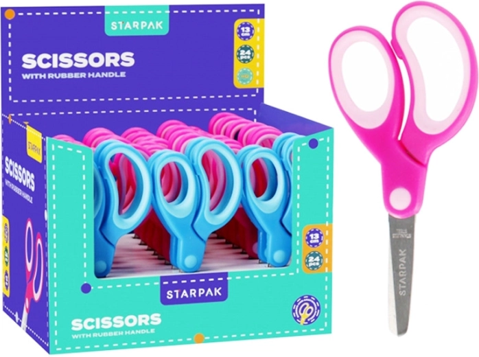 Praktične školske škare duljine 13 cm, idealne za male dječje ruke. Zahvaljujući ergonomskim ručkama i zaobljenim vrhovima sigurne su za djecu od 3 godine, odlične za rezanje papira i kreativne projekte. Dostupne u više varijanti boja, pakiranje od 24 komada, cijena po 1 kom.