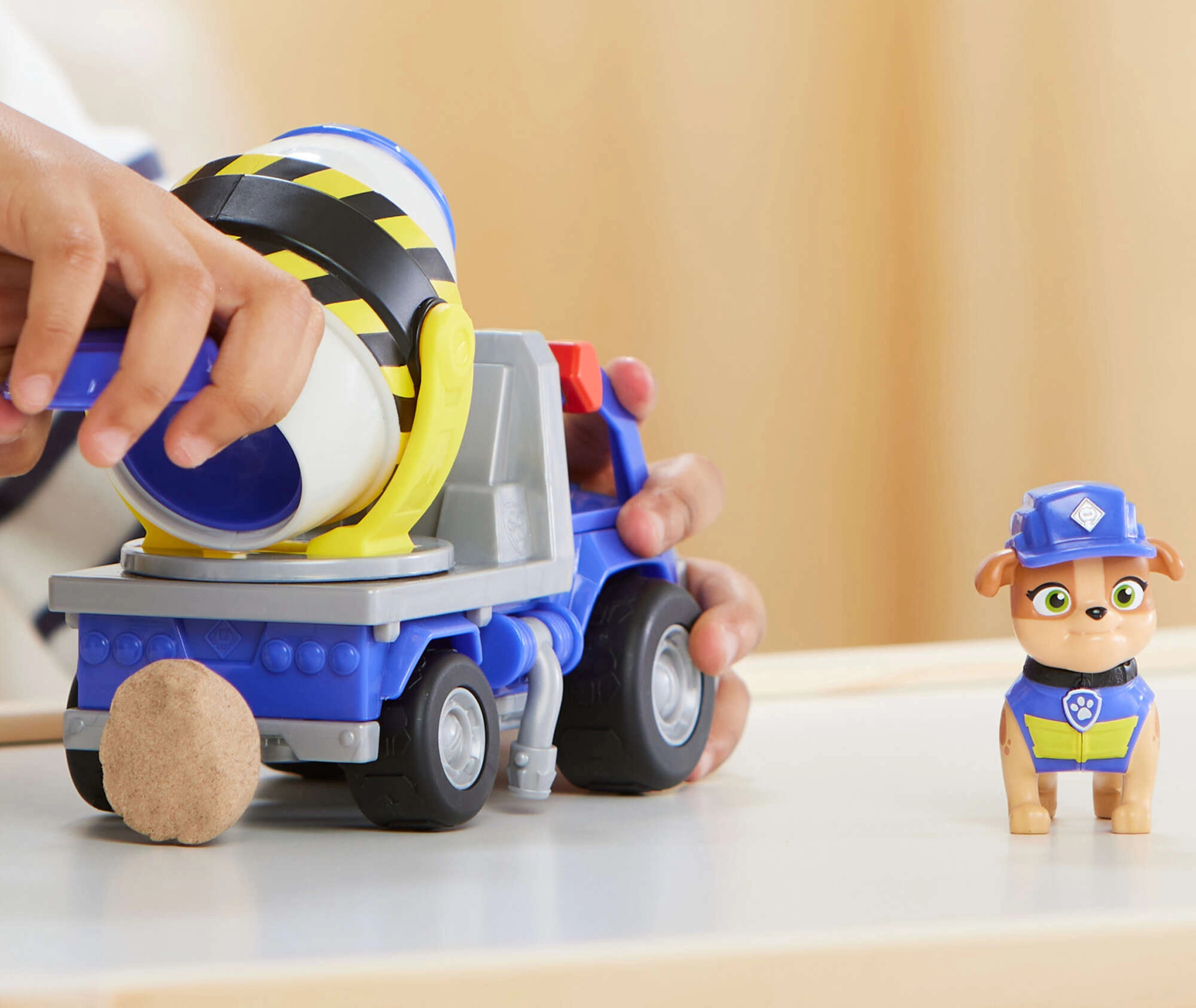 Zakoračite na gradilište s junacima PAW PATROL! Plava miješalica s karakterističnim žuto‑crnim prugama na bubnju i figuricom psića Mix spremna je za akciju. Djeca mogu ručno okretati bubanj i prevoziti “beton” na mjesto, dok veliki izdržljivi kotači osiguravaju glatku vožnju po različitim površinama.