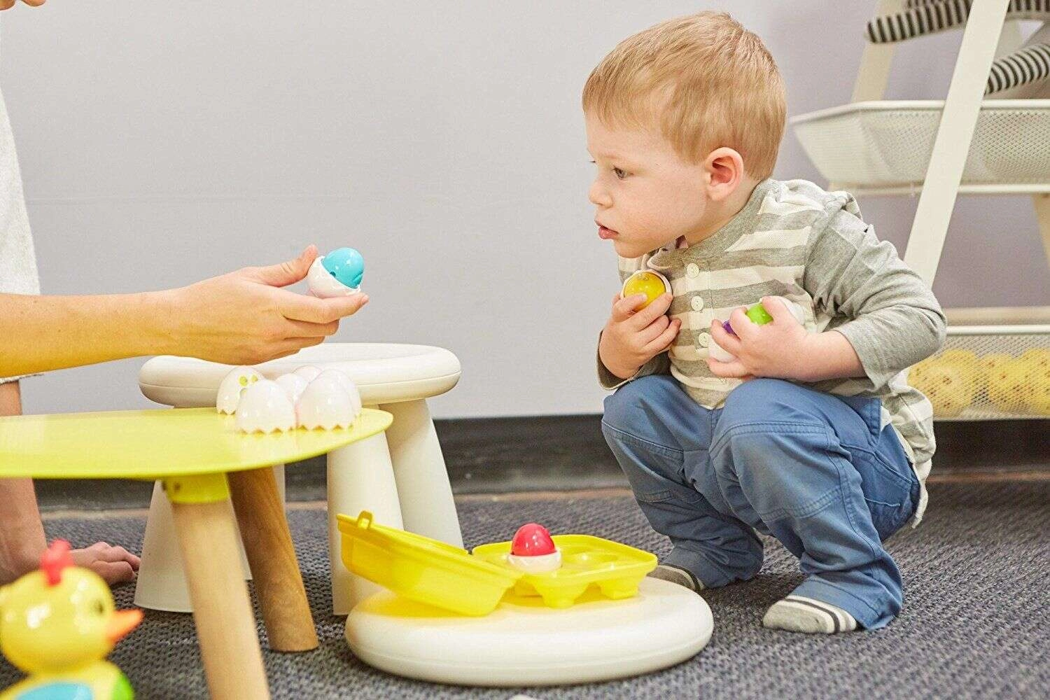 Šareni pilići u jajima pište kada ih pritisnete. Dijete tako prirodno razvija sluh, dodir i razumijevanje uzroka i posljedice.