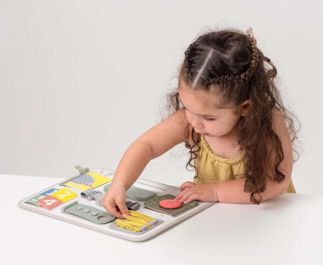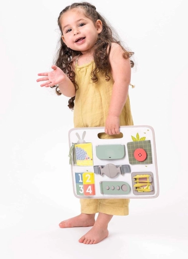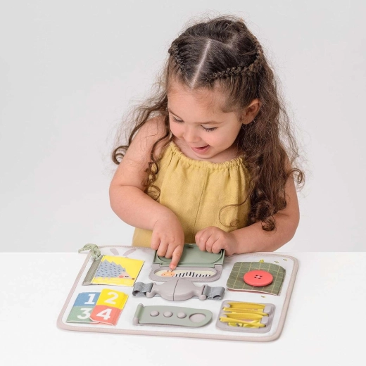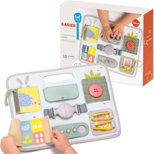 Otkrijte pametno i sigurno pomagalo za svakodnevno učenje kroz igru. TAF TOYS Activity Buckle Board osmišljena je za djecu od 18 mjeseci i kombinira praktična zakopčavanja (patentni zatvarač, gumb, kopča, čičak trake) s senzoričkim elementima i aktivnostima za brojanje. Ugrađena ručka olakšava prenošenje, pa ploču lako ponesete na izlet, u automobil ili k bake i djeda.