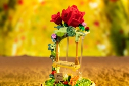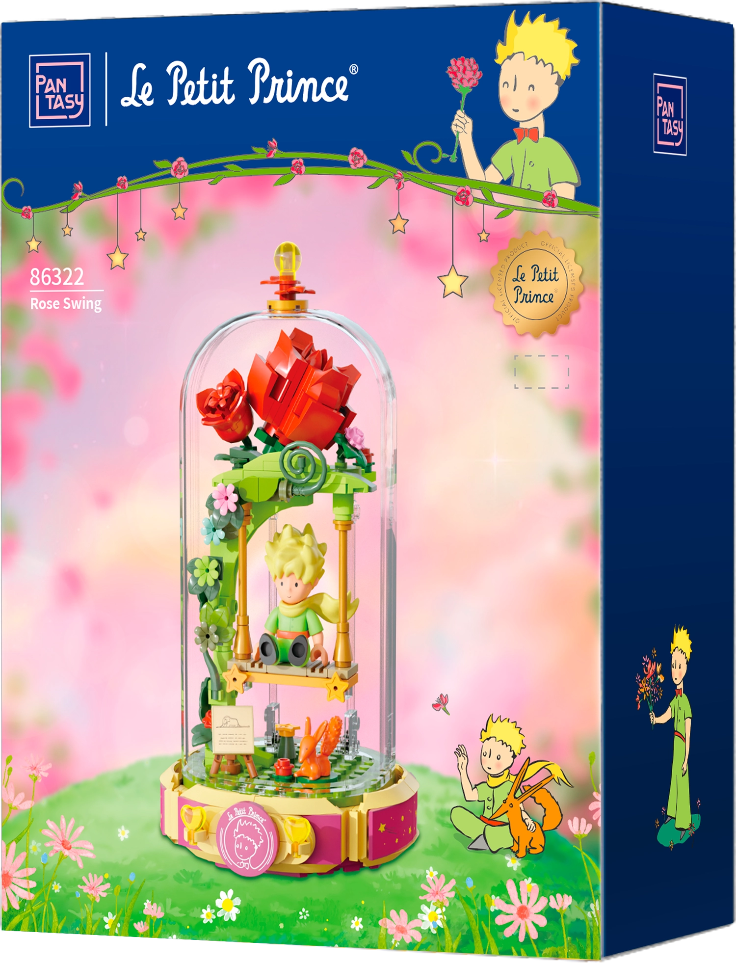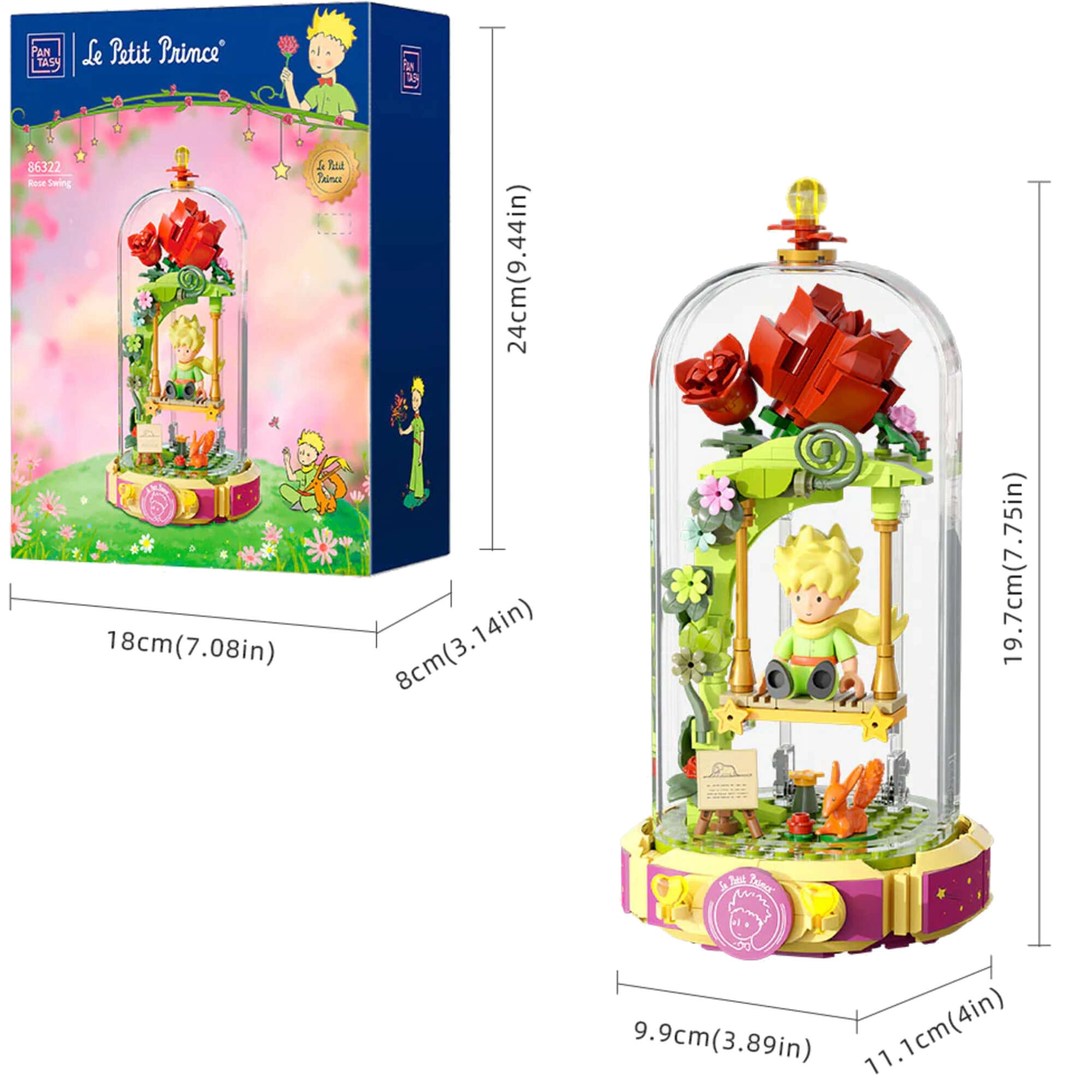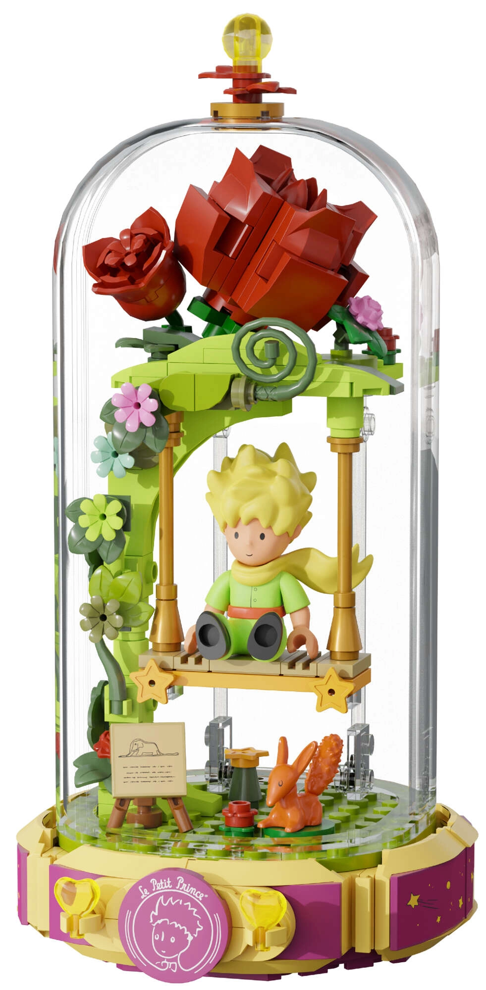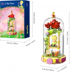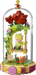 Ovaj dizajnerski set prenosi poetiku knjige u nježnu dioramu: Mali princ sjedi na ljuljački pod ružičnim lukom, okružen cvijećem, laticama i zvijezdama. Scena je zaštićena prozirnim pokrovom, pa će se istaknuti na polici ili radnom stolu i ostati bez prašine.