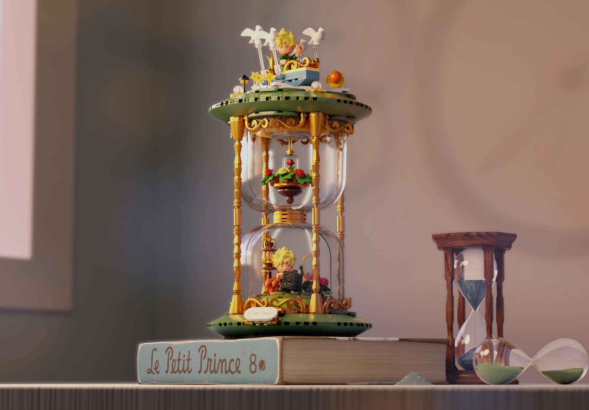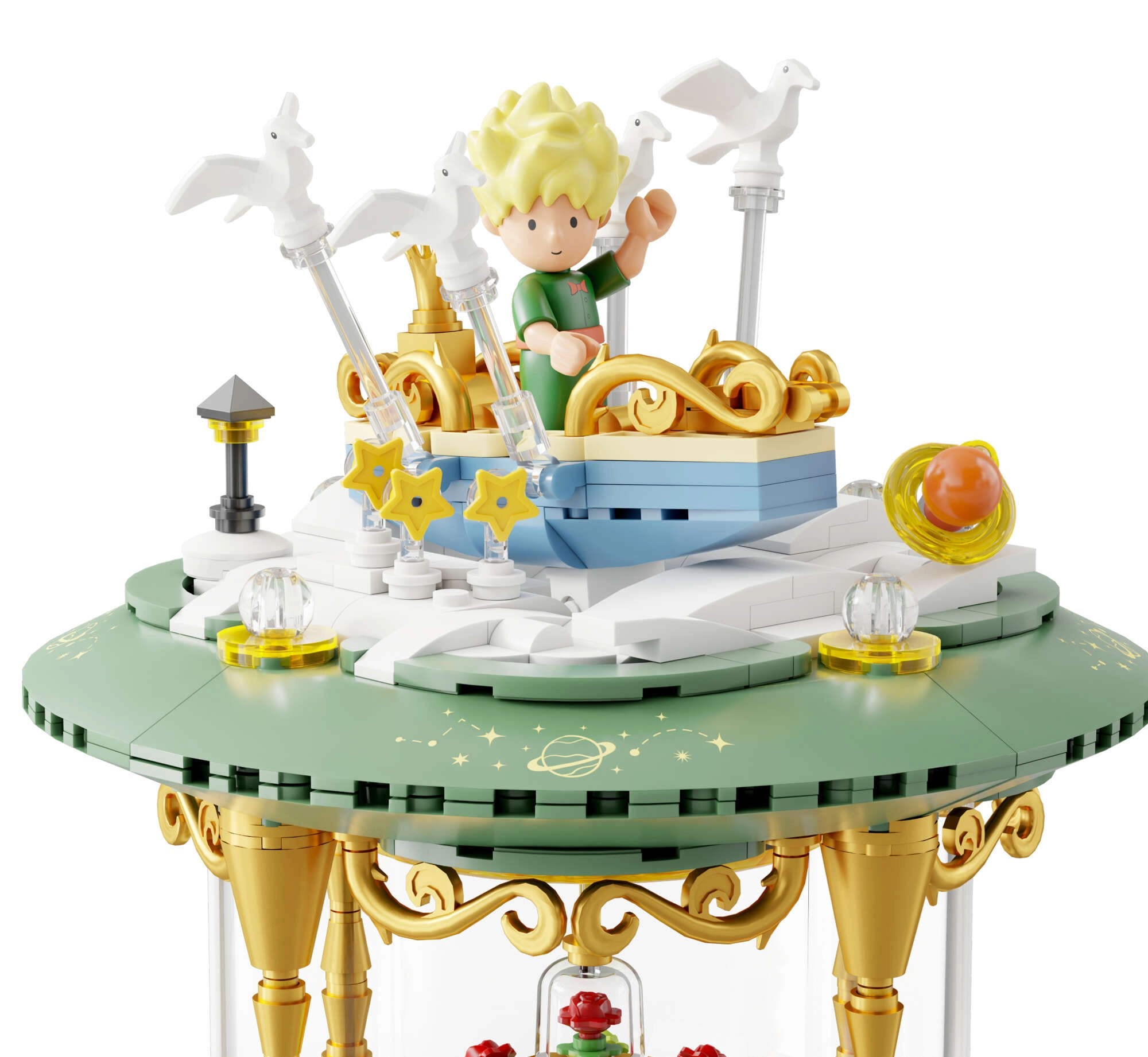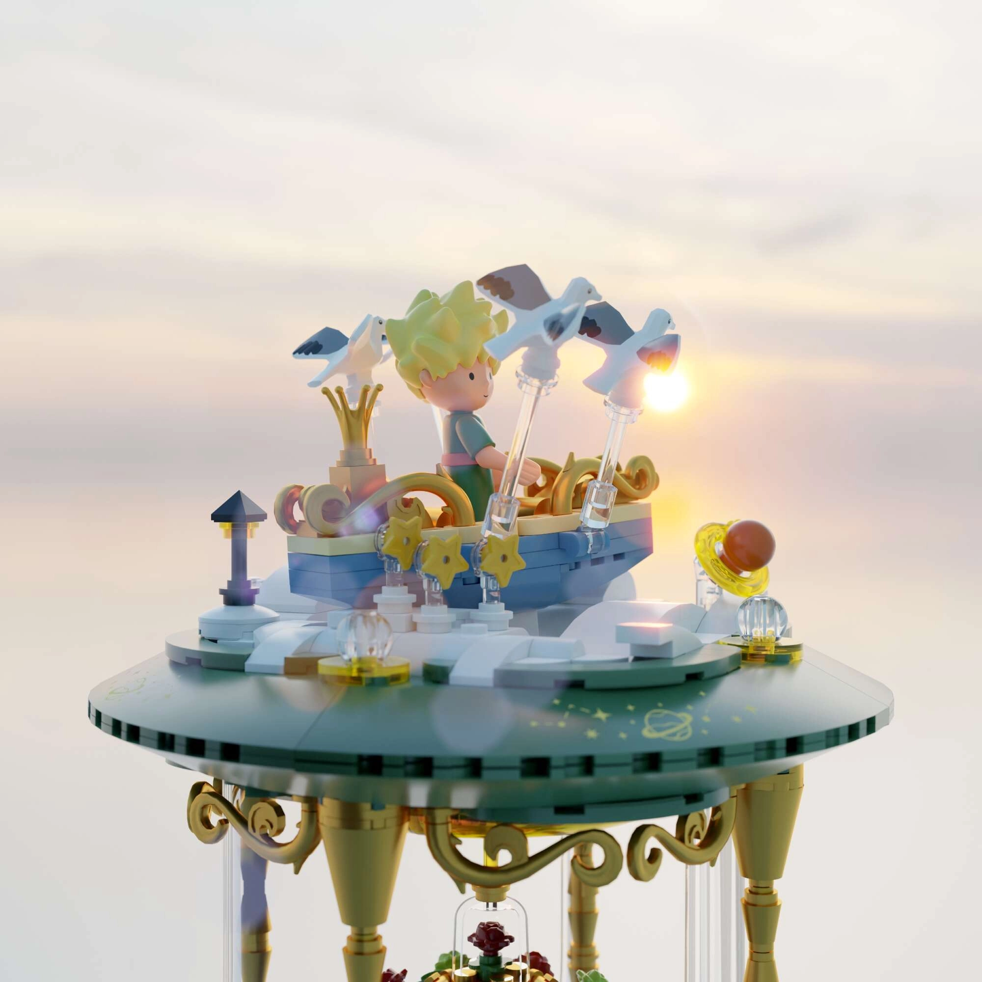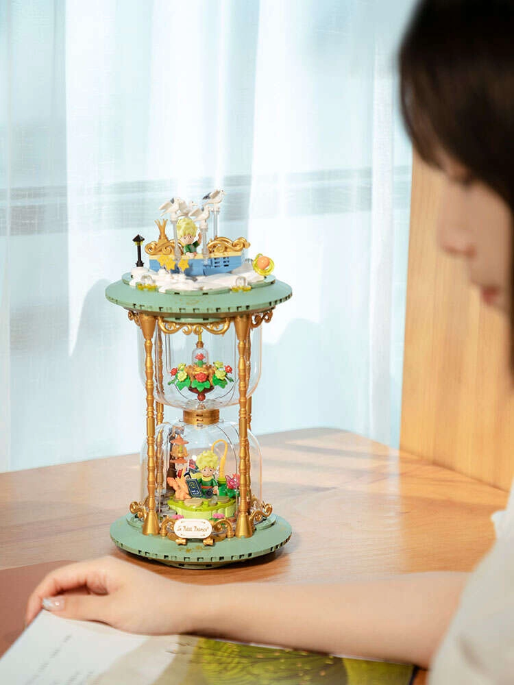 Ovaj izložbeni građevni set u obliku stilskog pješčanog sata spaja poetiku bezvremenog djela s modernim dizajnom. Zeleni postamenti, zlatni stupovi i prozirne komore s mini scenama stvaraju efektan dioramski prikaz – Mali princ, lisica, ruža pod staklenim pokrovom i zvjezdano nebo. Zahvaljujući preciznom slaganju kockica i tiskanim uzorcima model zadržava čist izgled dugi niz godina.