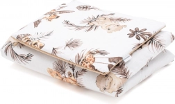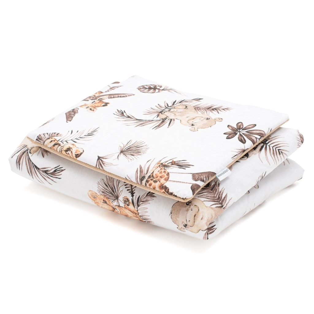 Obostrani set NEW BABY Safari za kolica osmišljen je za udobnost od rođenja. Jedna strana od 100% pamuka s preslatkim safari tiskom ugodna je na dodir i prozračna, a druga strana od mekanog velveta grije i dugotrajno zadržava oblik. Pokrivač upotpunjuju šarene vrpce koje zaokupljaju bebinu pažnju i potiču osjetilnu percepciju.