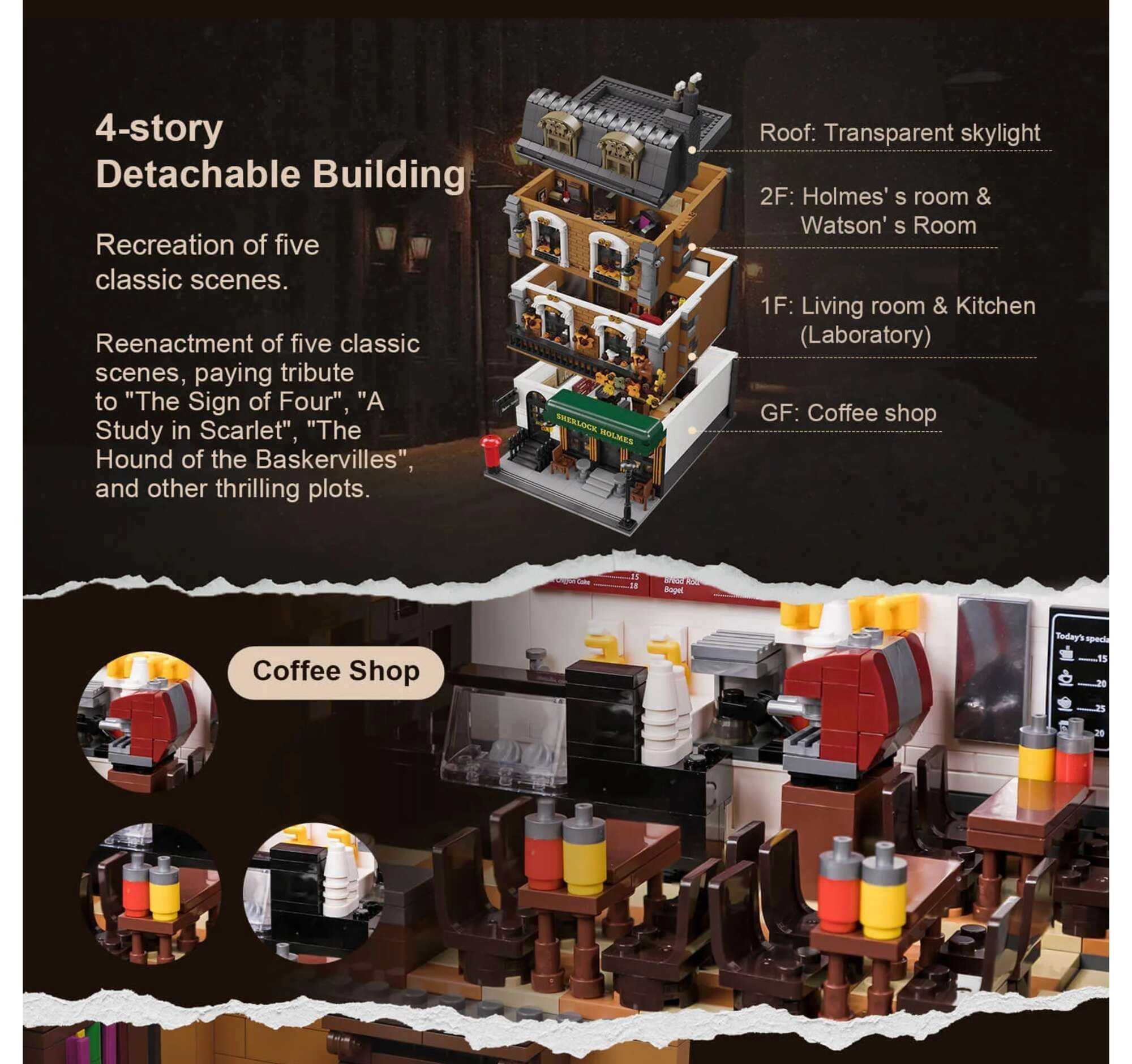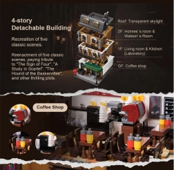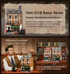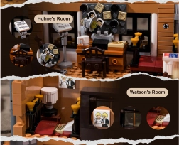 Model Detverokatne gradske kuDe vjerno do0Aarava atmosferu viktorijanskog Londona. U njemu 07ete prona07i ugodan salon s knji7Enicama, kafi7 bar 221B, Holmesovu spava7u sobu s novinama i violon0Delom te radnu sobu punu artefakata. Zahvaljuju07i vi61e od 60 posebno tiskanih kocaka s motivima Londona, Watsona i karata u7Eivat 07ete maksimalnu autenti0Dnost bez potrebe za naljepnicama.