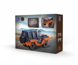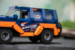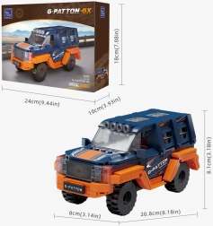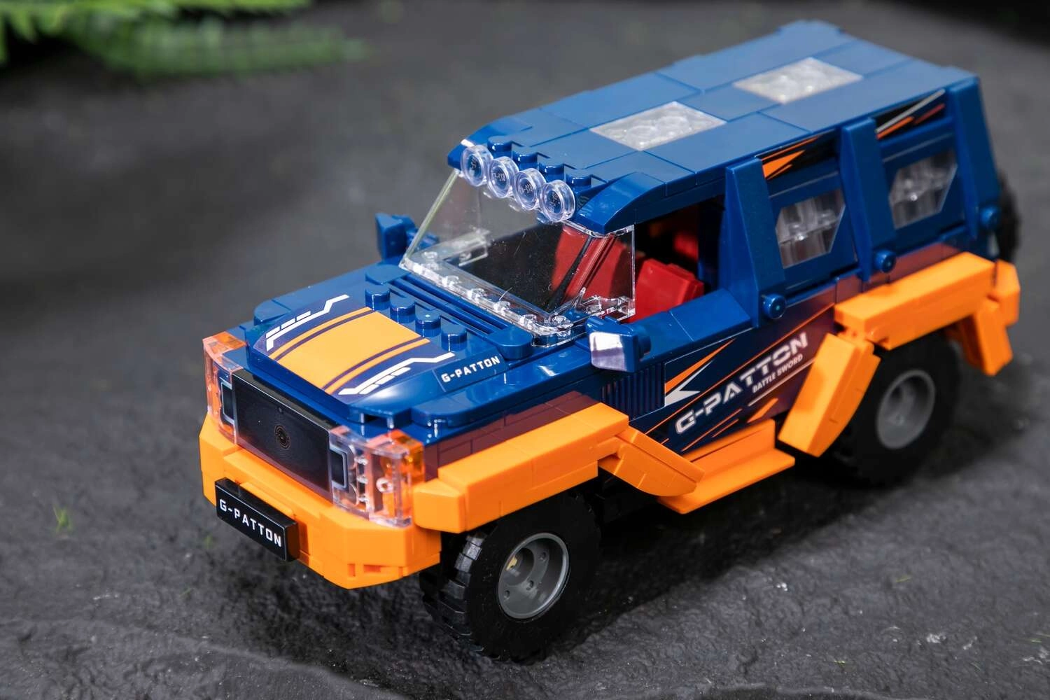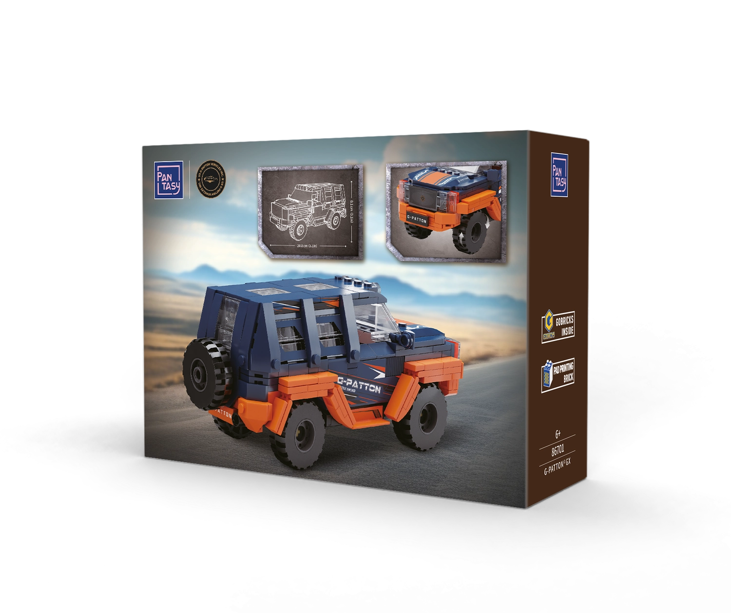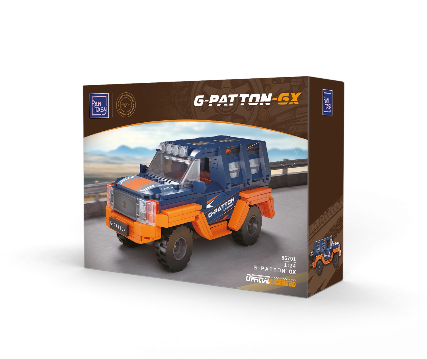 Doživite radost slaganja s konstruktorskim setom PANTASY G‑Patton GX. Robusni terenski SUV ističe se plavo‑narančastim dizajnom, prozirnim prozorima, detaljnom maskom i svjetlima na krovu. Dijelovi od kvalitetnog ABS‑a čvrsto drže, a otisnuti ukrasi ostaju dugotrajno lijepi – bez mjehurića i bez odljepljivanja naljepnica.