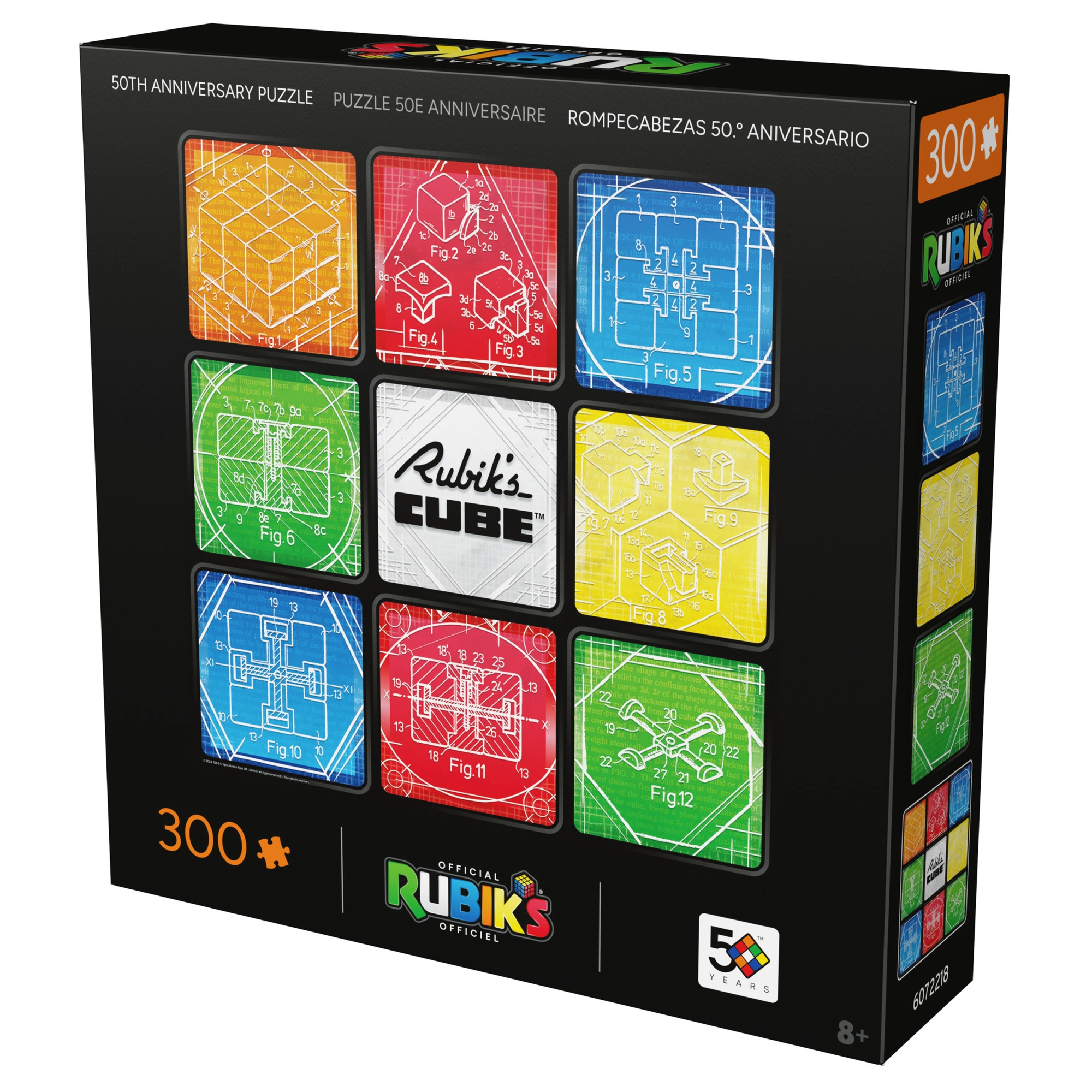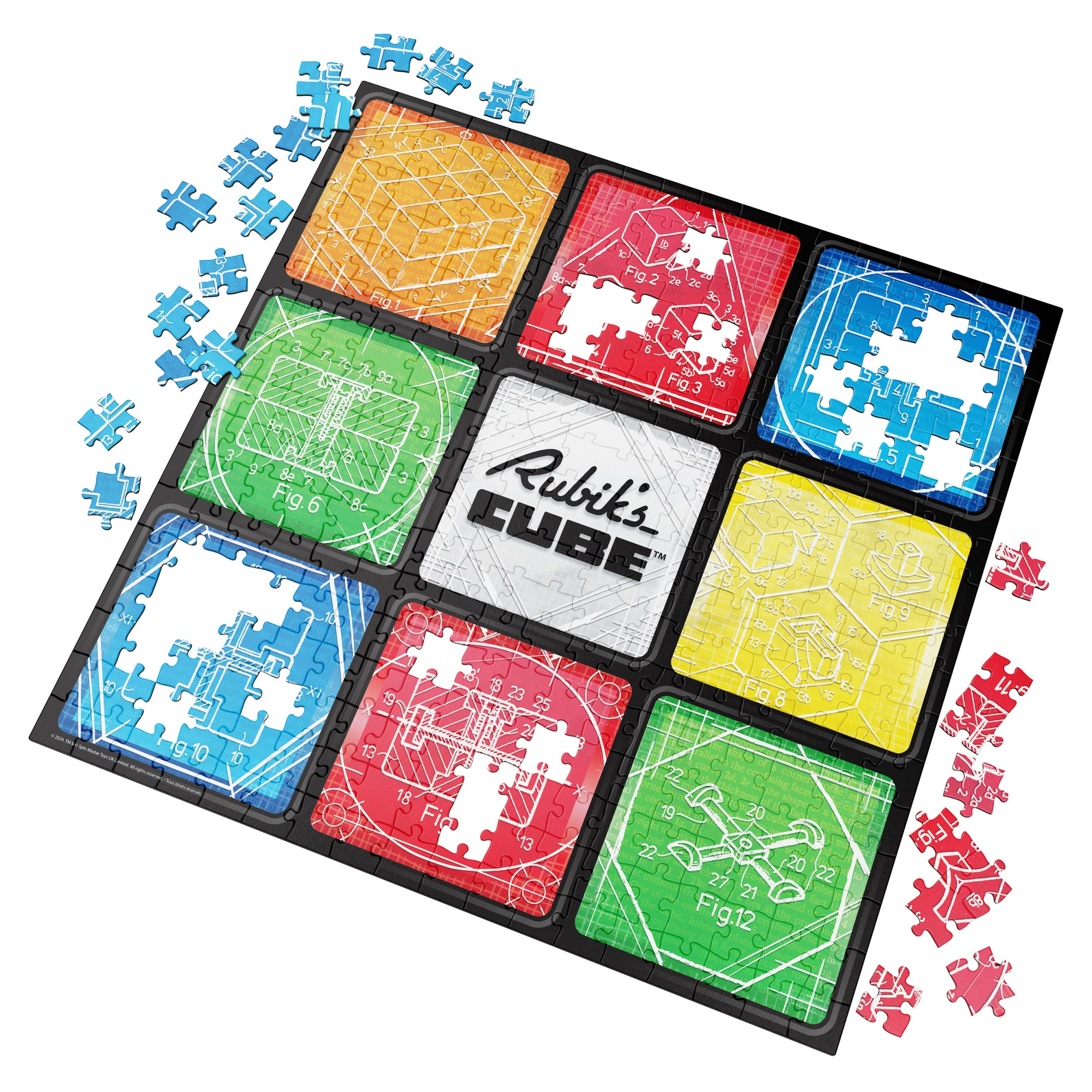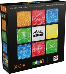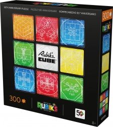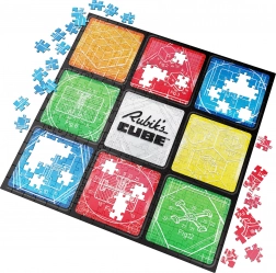 Sadržaj i motiv: Nakon slaganja dobit ćete kvadratnu sliku 50,8 × 50,8 cm s devet polja koja upućuju na klasični raspored 3×3. Središte kompozicije krasi logotip RUBIK’S CUBE, a okruženje čine tehnički crteži mehanike slavne kocke.