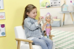 Čarobna lutka BABY born morska vila visine 46 cm donosi zabavu u svako kupanje. U vodi ima pokretnu peraju i njezin kostim ima efekt promjene boje u hladnoj vodi. Zahvaljujući dugoj plavoj kosi s obojenim pramenovima i dodacima uživat ćete u kreativnom češljanju – u kompletu su traka za kosu i ružičasti češalj. Lutka je na baterije i potiče maštu i socijalne vještine.