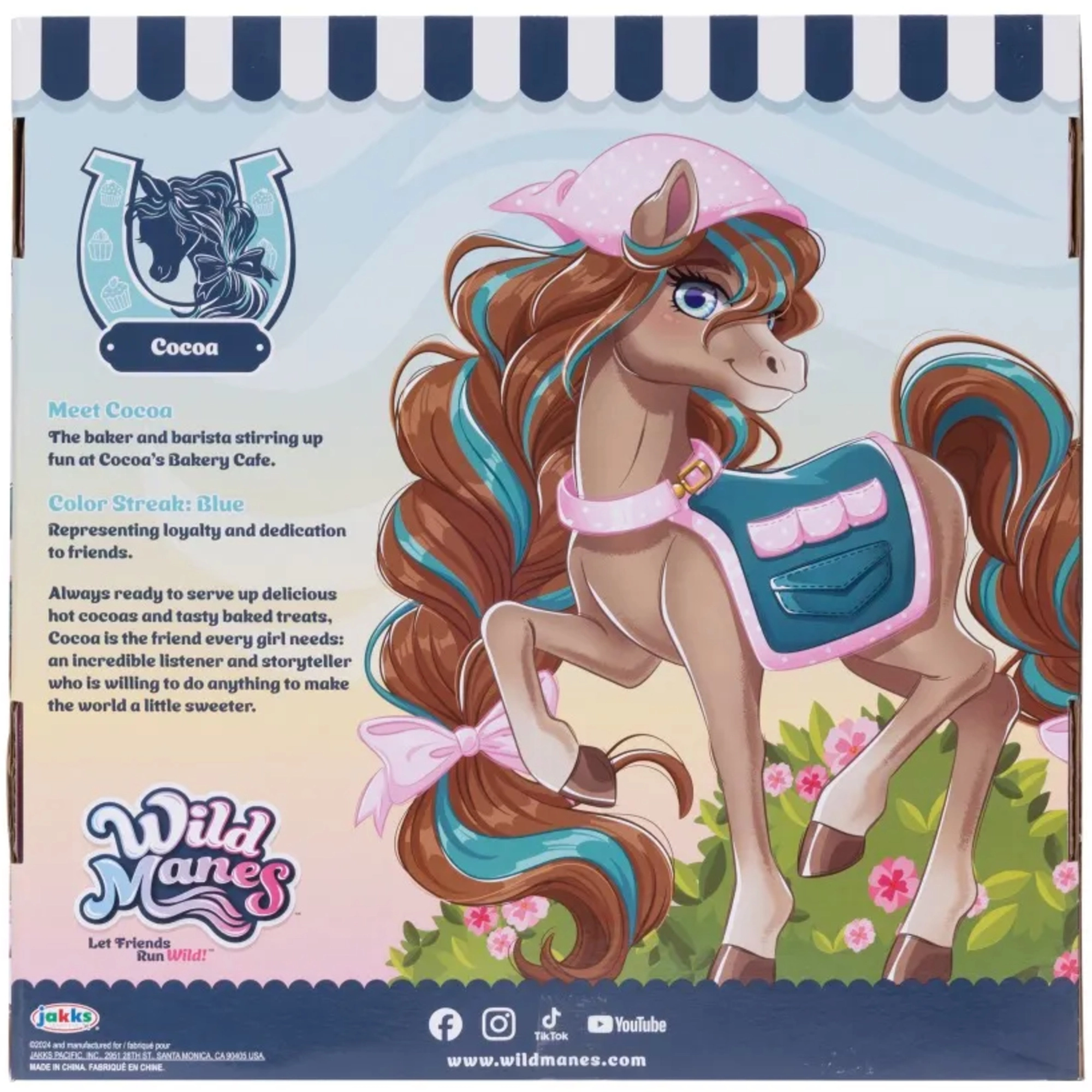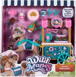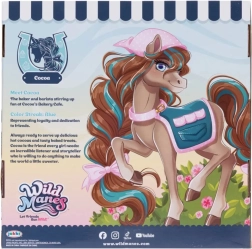 Konjić Cocoa iz popularne serije WILD MANES dolazi s detaljno izrađenim kolicima Bakery Café, gdje može posluživati napitke i slastice. Figurica ima detaljno oblikovanu grivu s pletenicama, izražajne oči i nosi stilsku pregaču – spremna za svaku avanturu. Zahvaljujući kopčama u obliku potkove Cocoa može držati dodatke i lako odigrati razne scenice.
