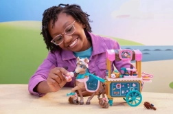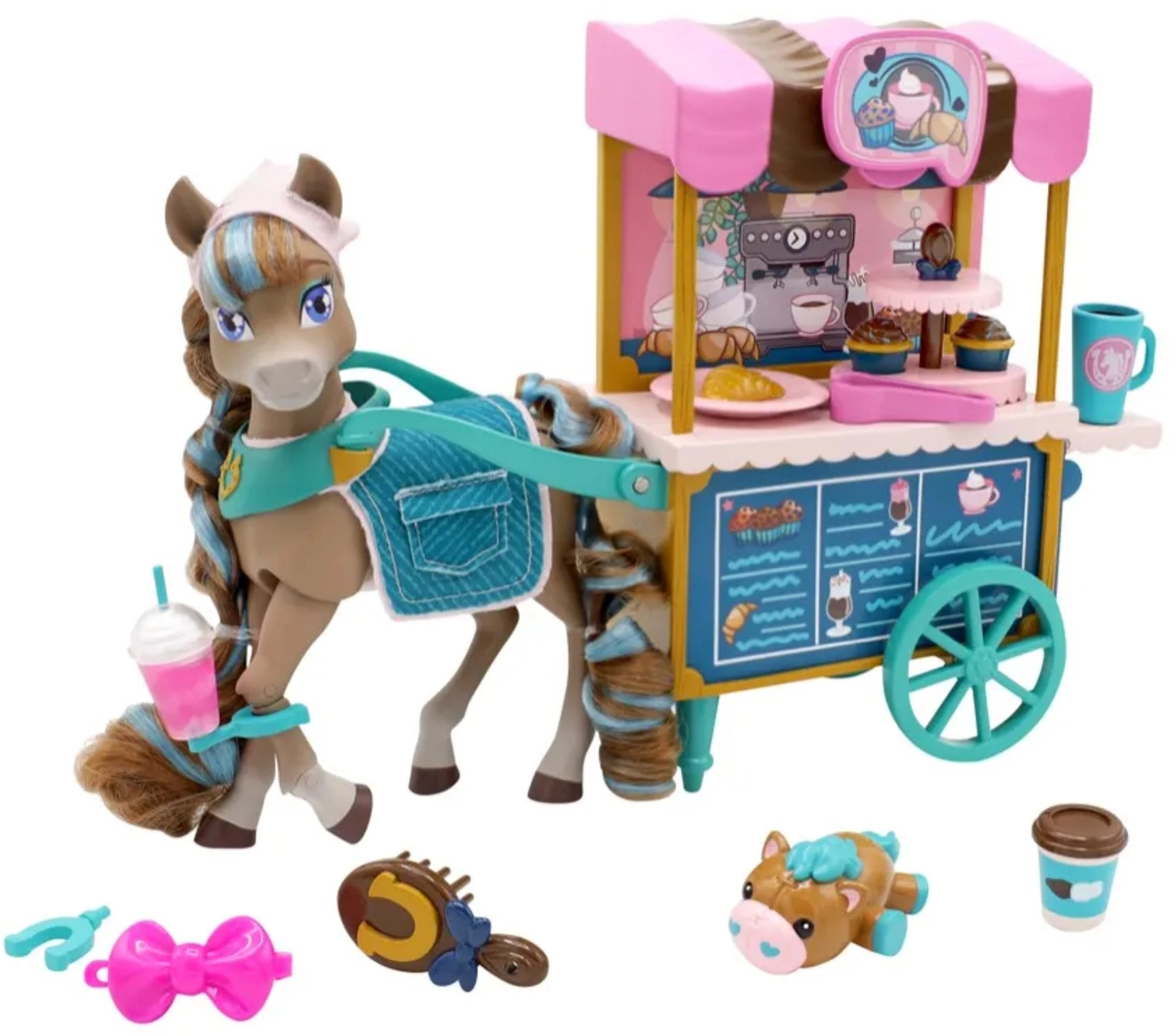 Kolica imaju okretne kotačiće, ručku i police za poslastice, šarenu tendu i grafiku kavane. Set uključuje i poslužne i pekarske dodatke, malog ljubimca te češalj za uređivanje grive. Sve je osmišljeno za kreativnu ulogovnu igru, razvoj fine motorike i socijalne igre.