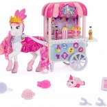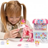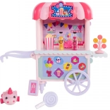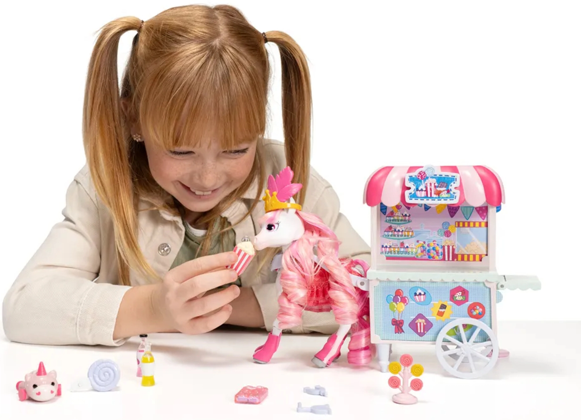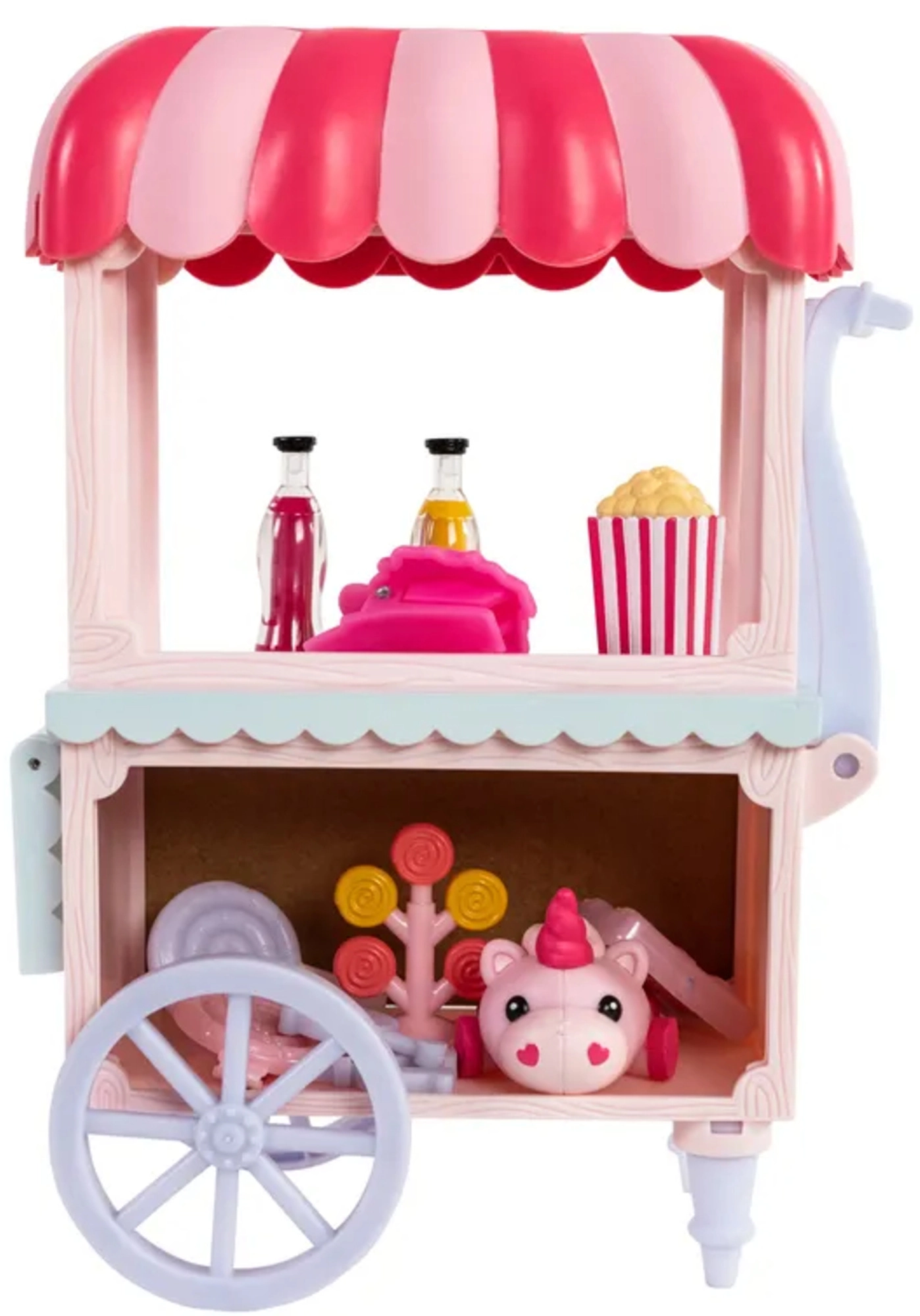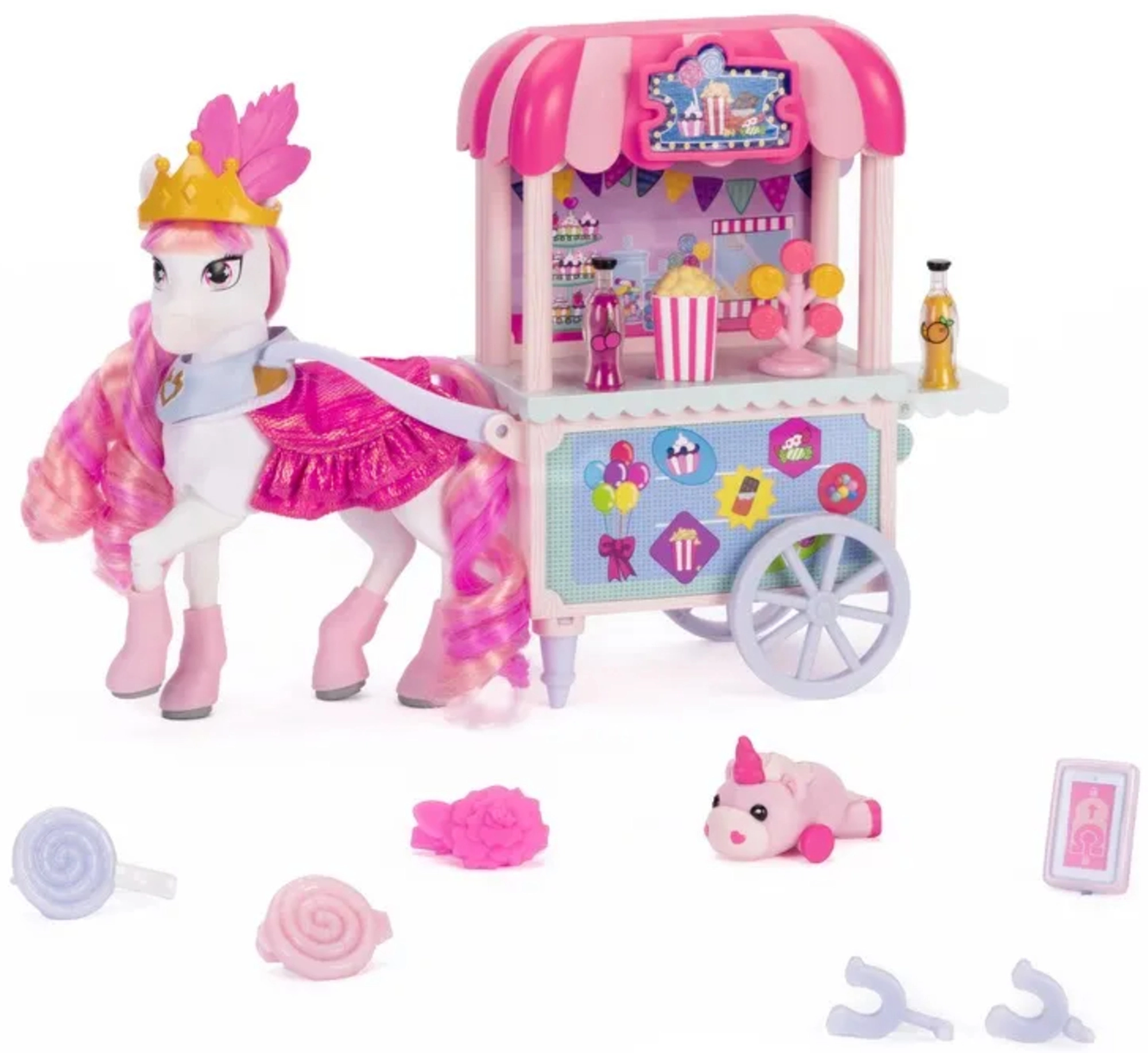 Šareni štand Sugar Rush Carnival s prugastim krovićem i funkcionalnim kotačićima spreman je za prodaju popcorn-a, lizalica i napitaka. Pomoću vučne šipke/uzda kolica se mogu priključiti na Candi i krenuti u slatku vožnju kroz gradić Mane Lane. U kompletu su i mali dodaci za njegu i styling – četka, ukosnice i još ponešto.