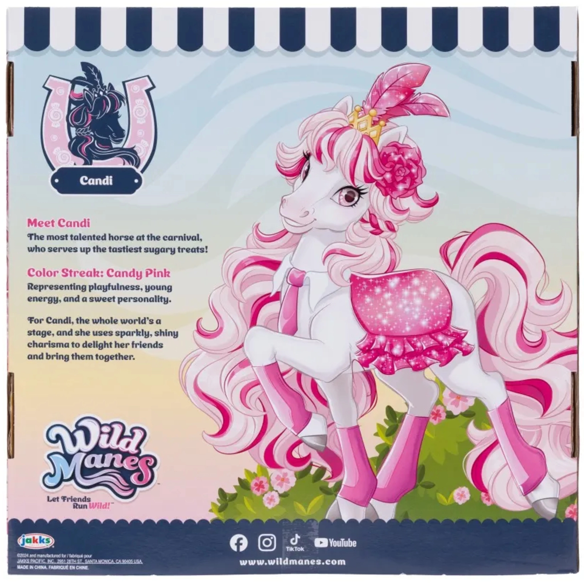 Jednorog Candi osvaja bijelim tjelešcem, ružičastom grivom i repom, sjajnom krunom i stylish odjećom. Zahvaljujući pokretnim udovima figuricu je lako postaviti u različite poze i ponovno proživjeti omiljene scene iz svijeta WILD MANES.