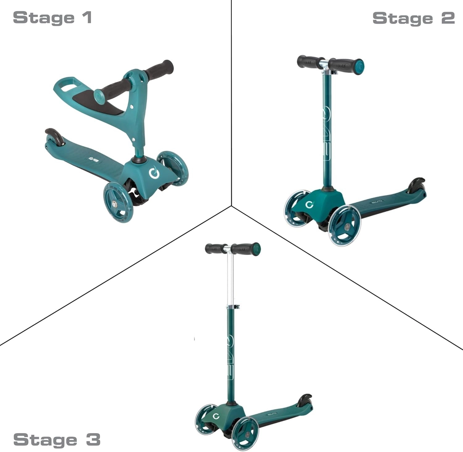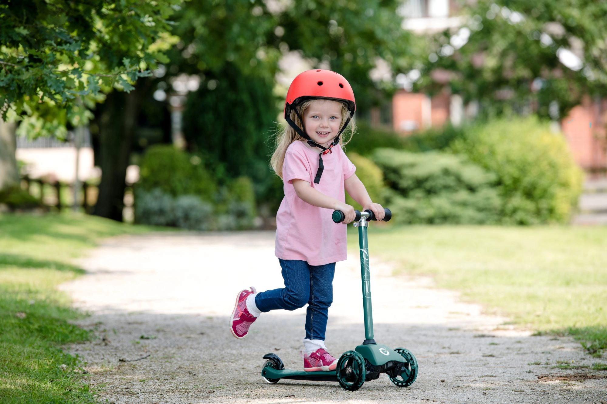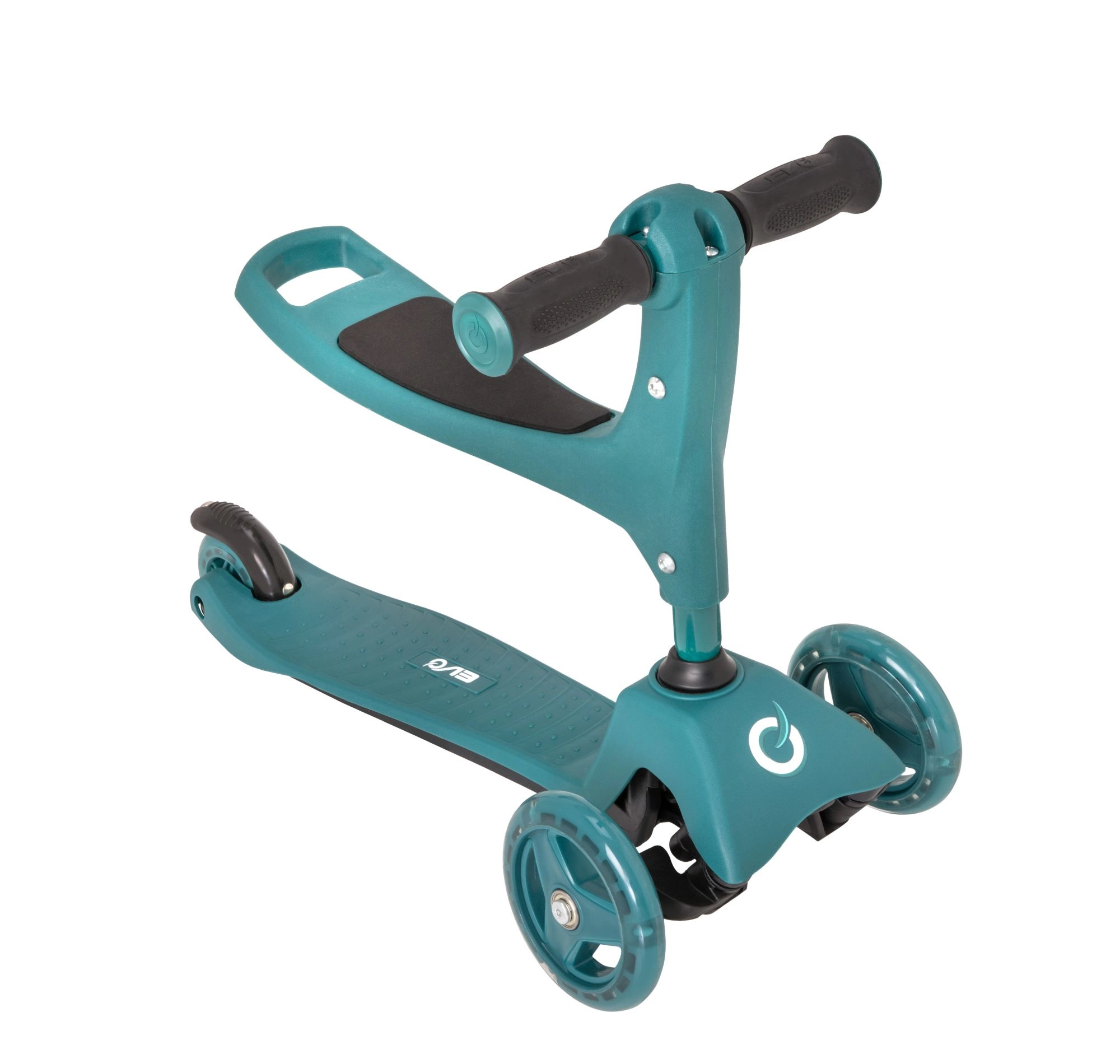 Ovaj pametni troskotačni romobil 2u1 u trenu se pretvara iz guralice sa sjedalom u klasični romobil. Zahvaljujući podesivim upravljačima (otprilike 40 cm u načinu guralice i 62–72 cm u načinu romobila) raste s djetetom i pruža sigurnost pri prvim vožnjama i kasnije pri živahnijem odgurivanju.