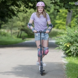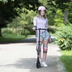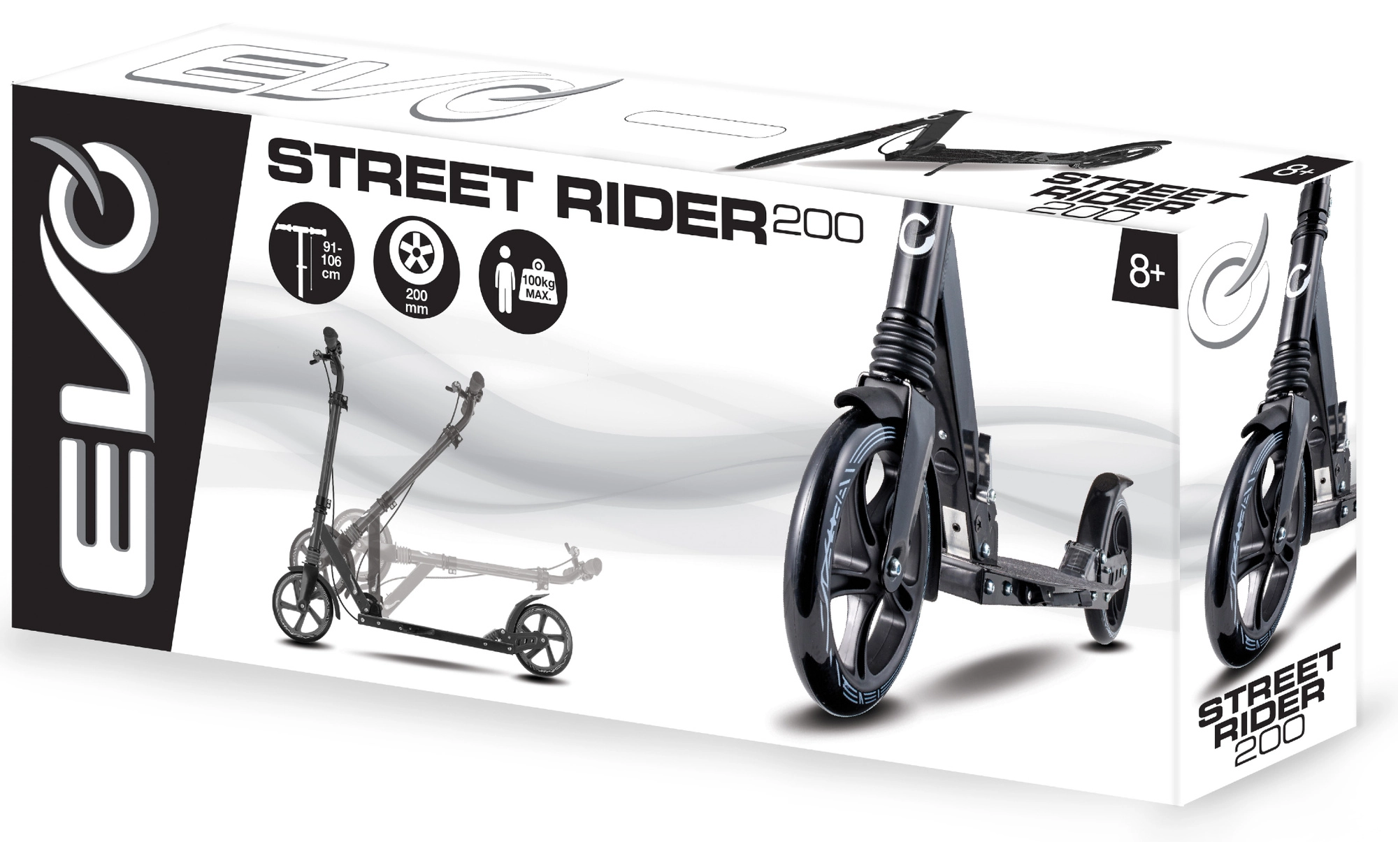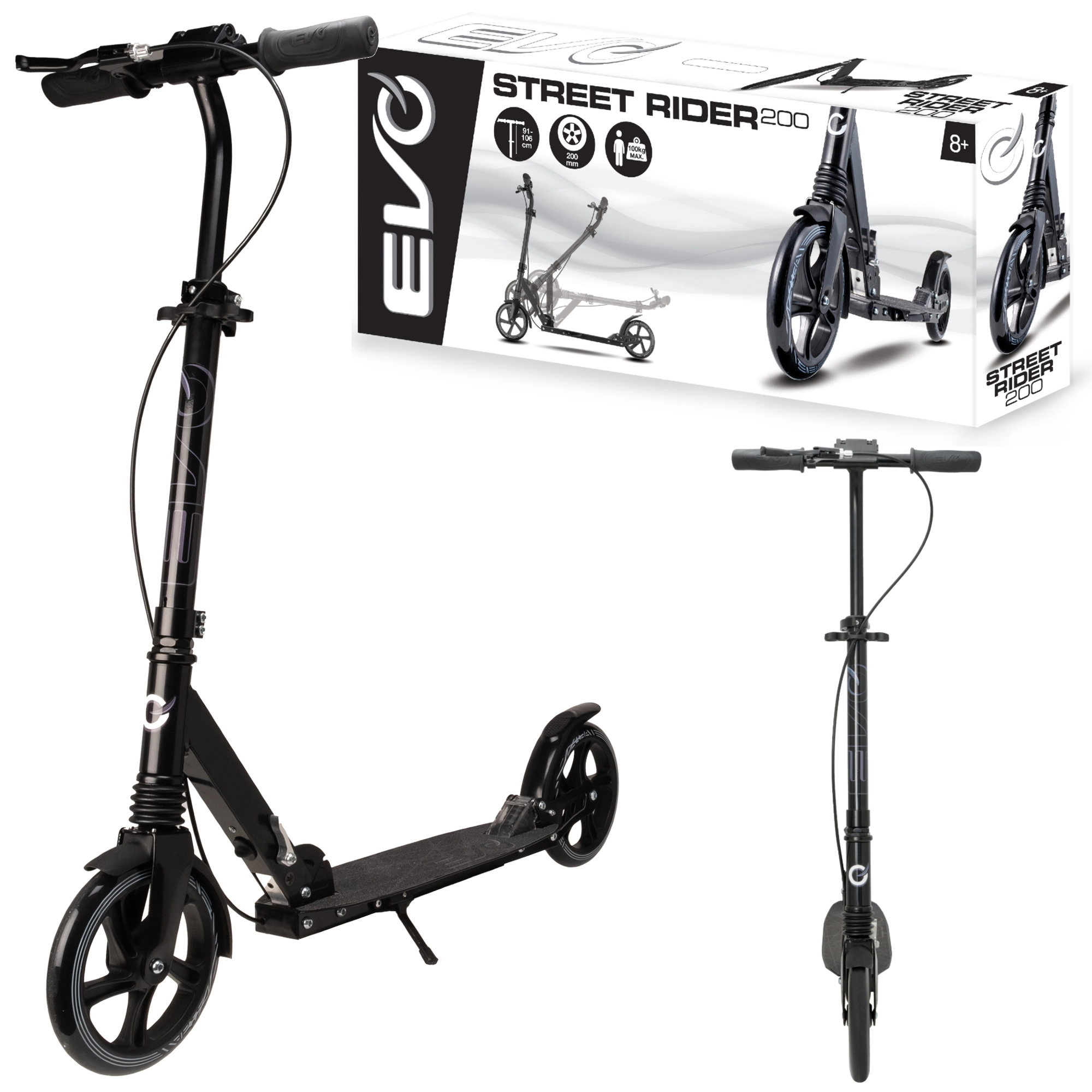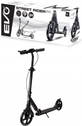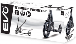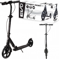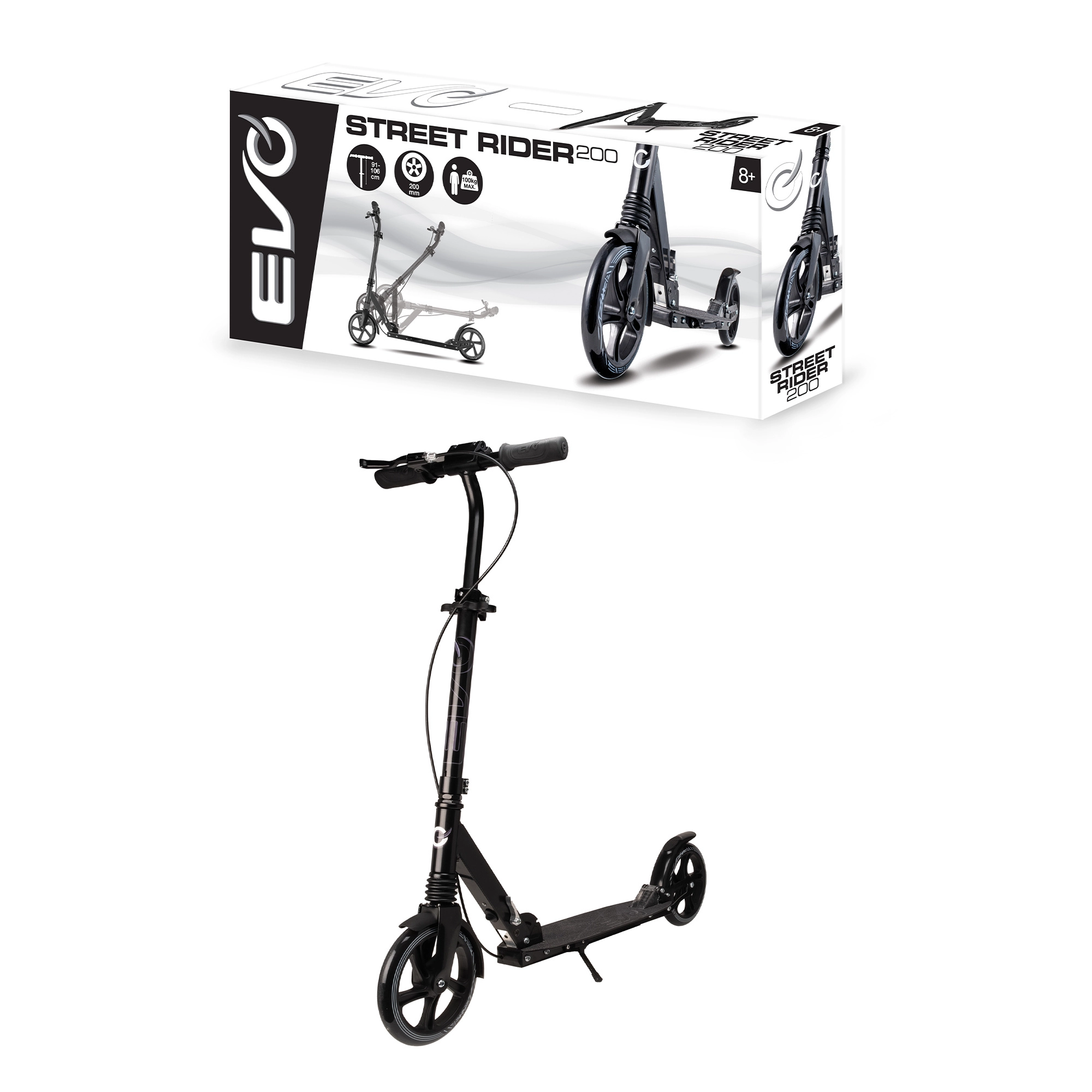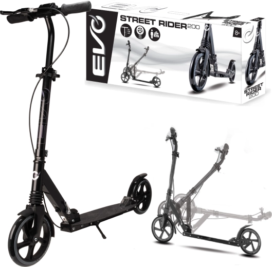 Lagan i izdržljiv romobil EVO Street Rider 200 za vozače od 8 godina nudi velika 200 mm kotača, smanjen otpor kotrljanja zahvaljujući ležajevima ABEC-7, prednje i stražnje ovjesenje, sklopivi mehanizam za lako nošenje te visinski podesiv volan. Za sigurno zaustavljanje brinu stražnja nožna kočnica i prednja ručna kočnica, stabilnost povećava protuklizna platforma i praktično integrirano postolje.